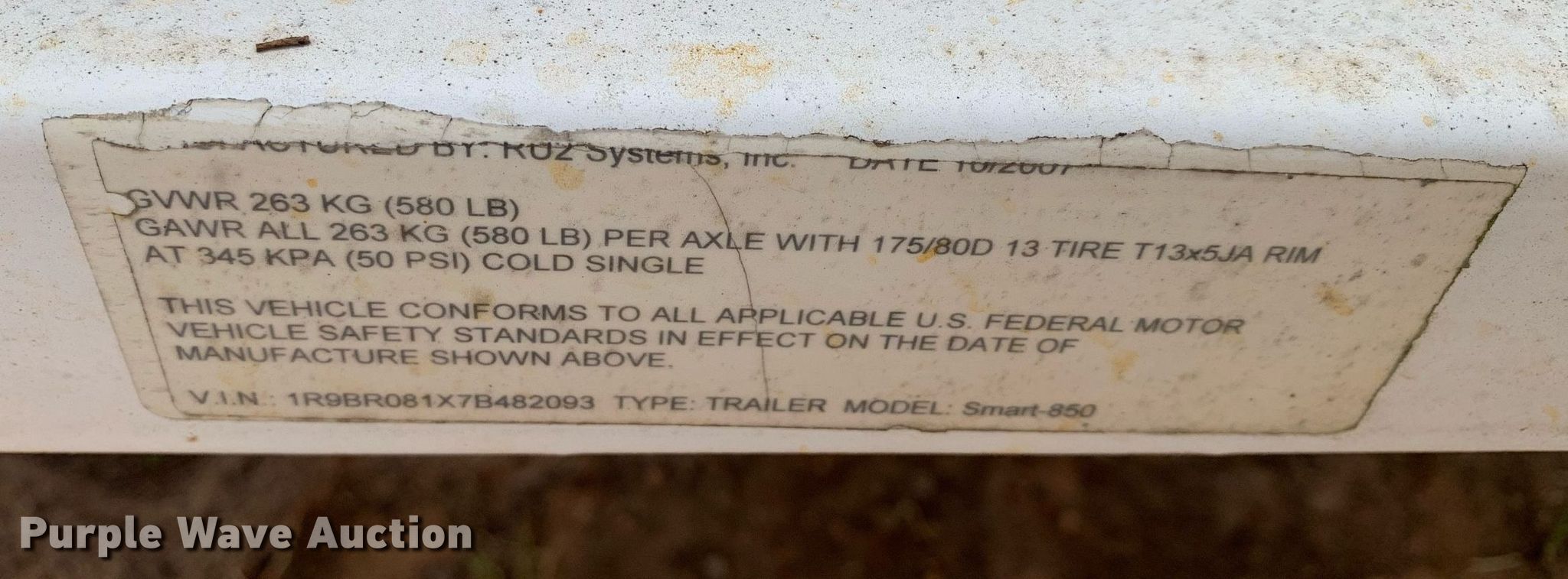 2007 RU2 Systems, Inc. Smart-850 radar trailer. VIN: 1R9BR081X7B482093. Dimensions Overall: 7' 10" L x 68" W. Chassis Ball hitch: 2", Landing gear: Single, Suspension: Spring, GVWR: 580 lbs, GAWR: 580 lbs. Tires Steel wheels, Size: ST175/80D13. Notes Unknown operating condition. Transfer of ownership documentation will be a bill of sale. City of Henderson, TX. 1203 Highland Drive. Henderson, TX 75652