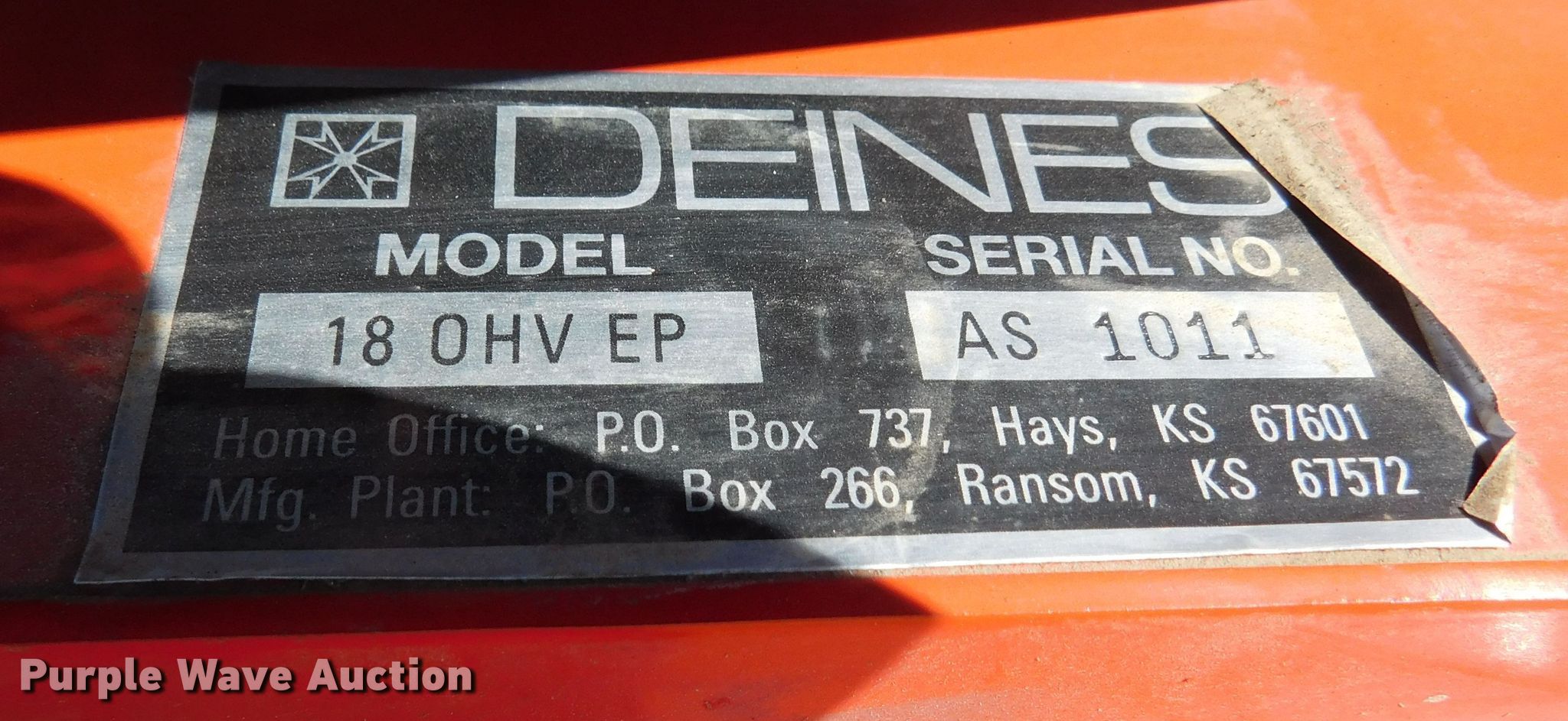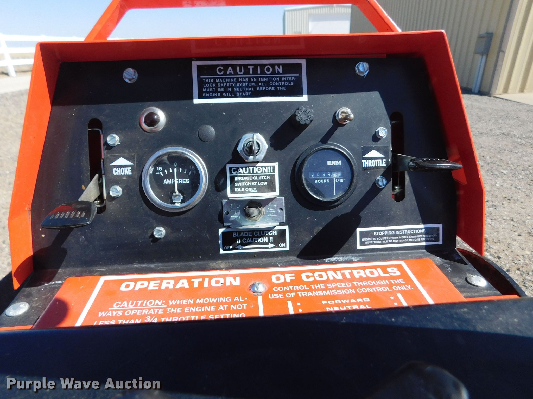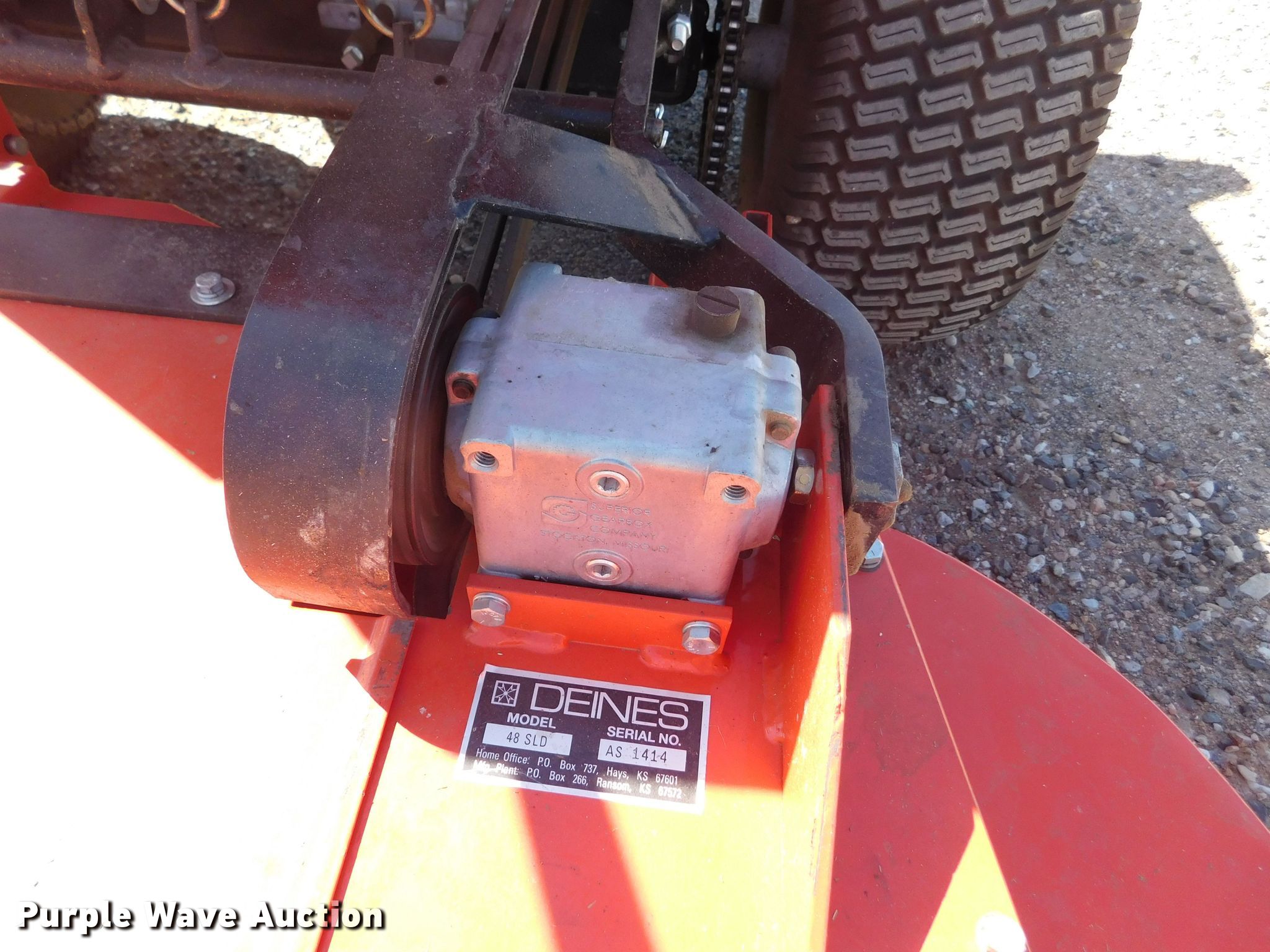 Purple Wave is selling a used Lawn Mower in Kansas. This item is a Deines Marty J 1800 ZTR lawn mower with the following: Hours: 85 on meter, Cutting width: 48", Serial: AS1011