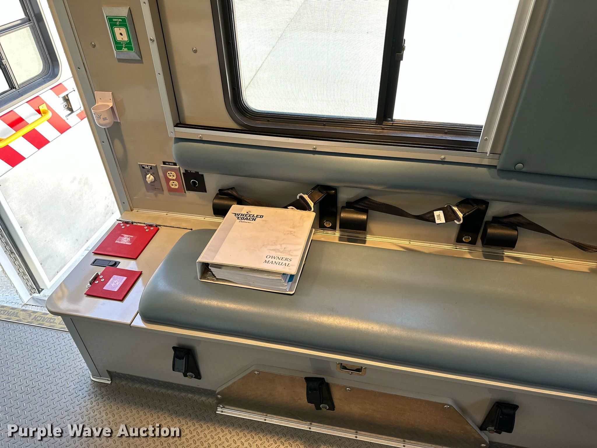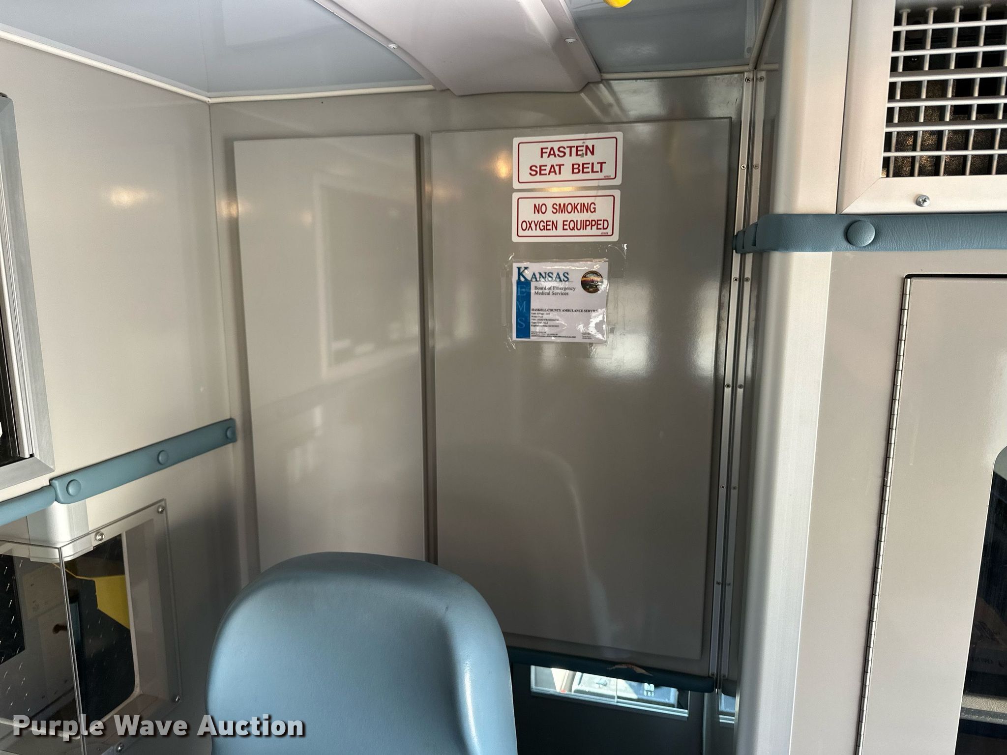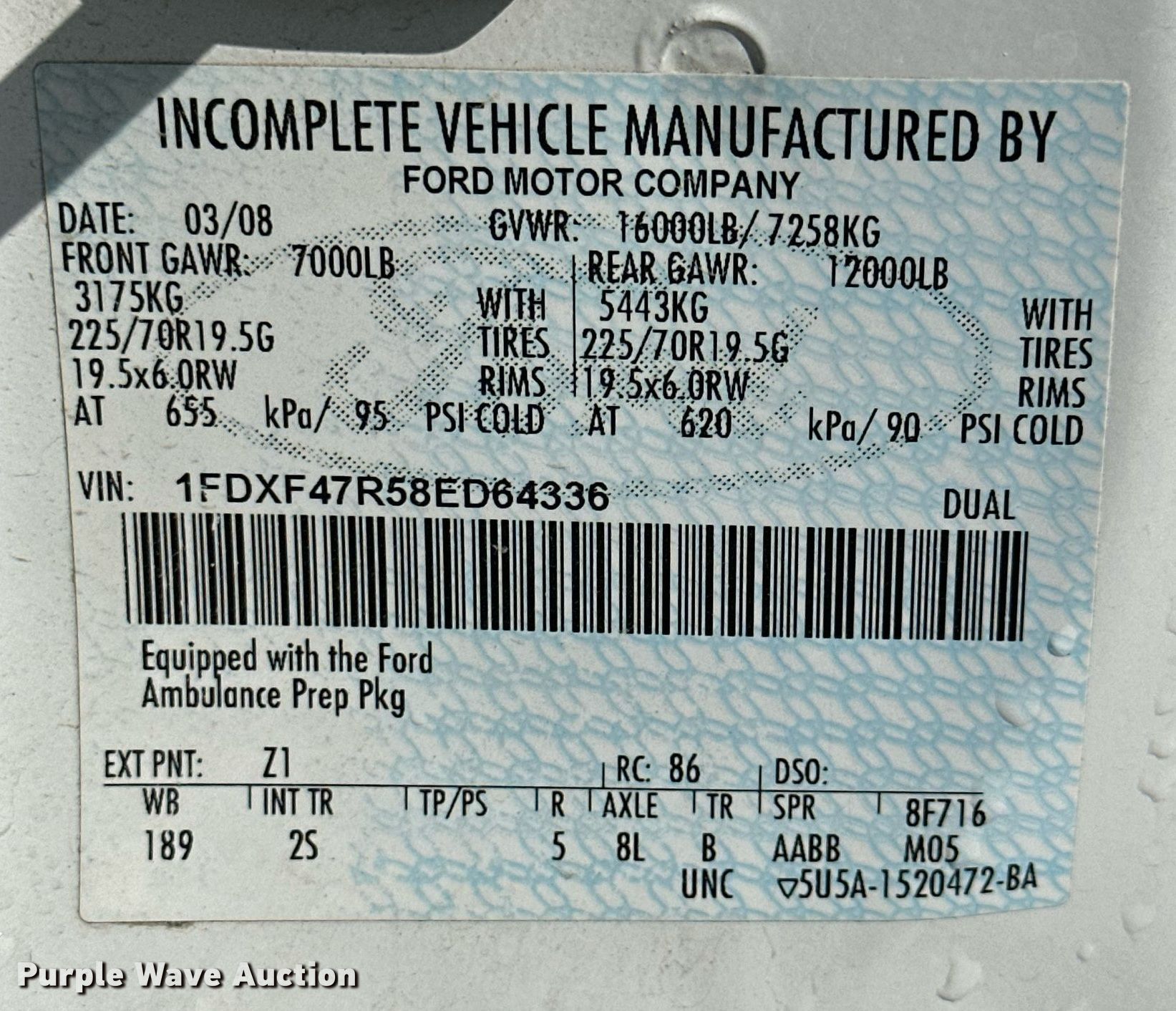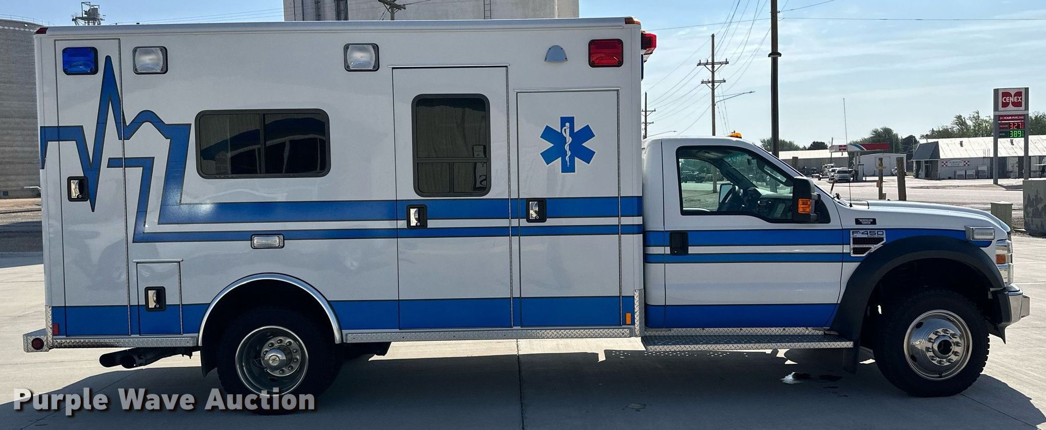 2008 Ford F450 Super Duty ambulance. Miles: 20,736 on odometer, VIN: 1FDXF47R58ED64336. Engine Displacement: 6.4L, Cylinders: 8, Fuel type: Diesel. Transmission Automatic. Chassis Four wheel drive, Axles: Single, Suspension: Spring, Brakes: Hydraulic. Interior AC, Heat, Power windows, Power locks, Cruise control. Features Ambulance body Wheeler Coach, PA/ siren controls, Oxygen hookups. Tires Size: 225/70R19.5. Kansas title. Title distribution may be delayed up to 14 days from verification of funds. 700 West La Lande Avenue. Sublette, KS 67877