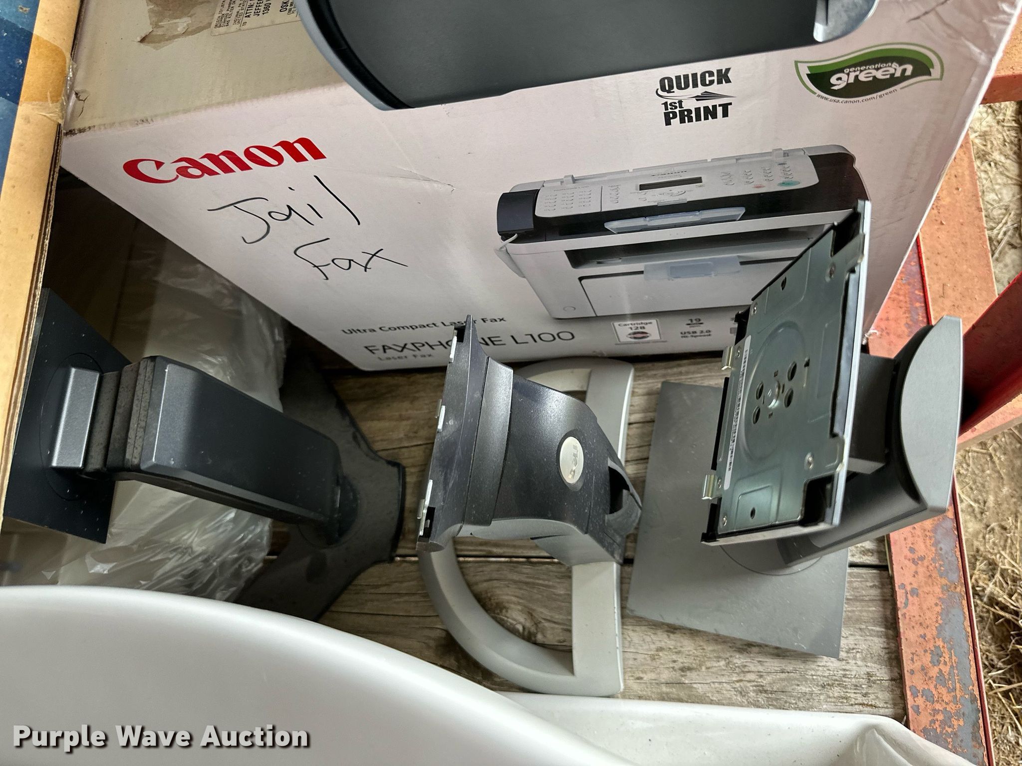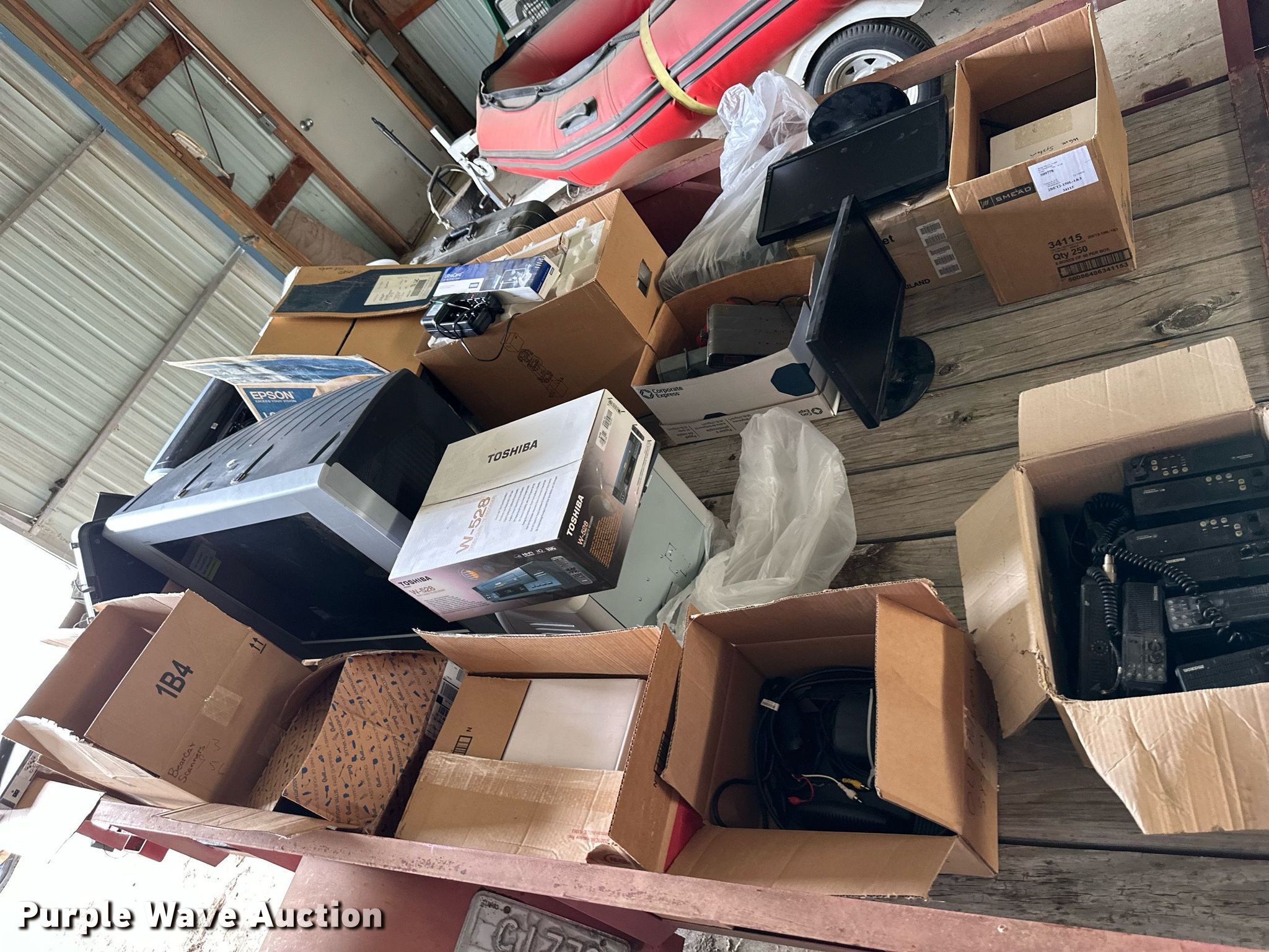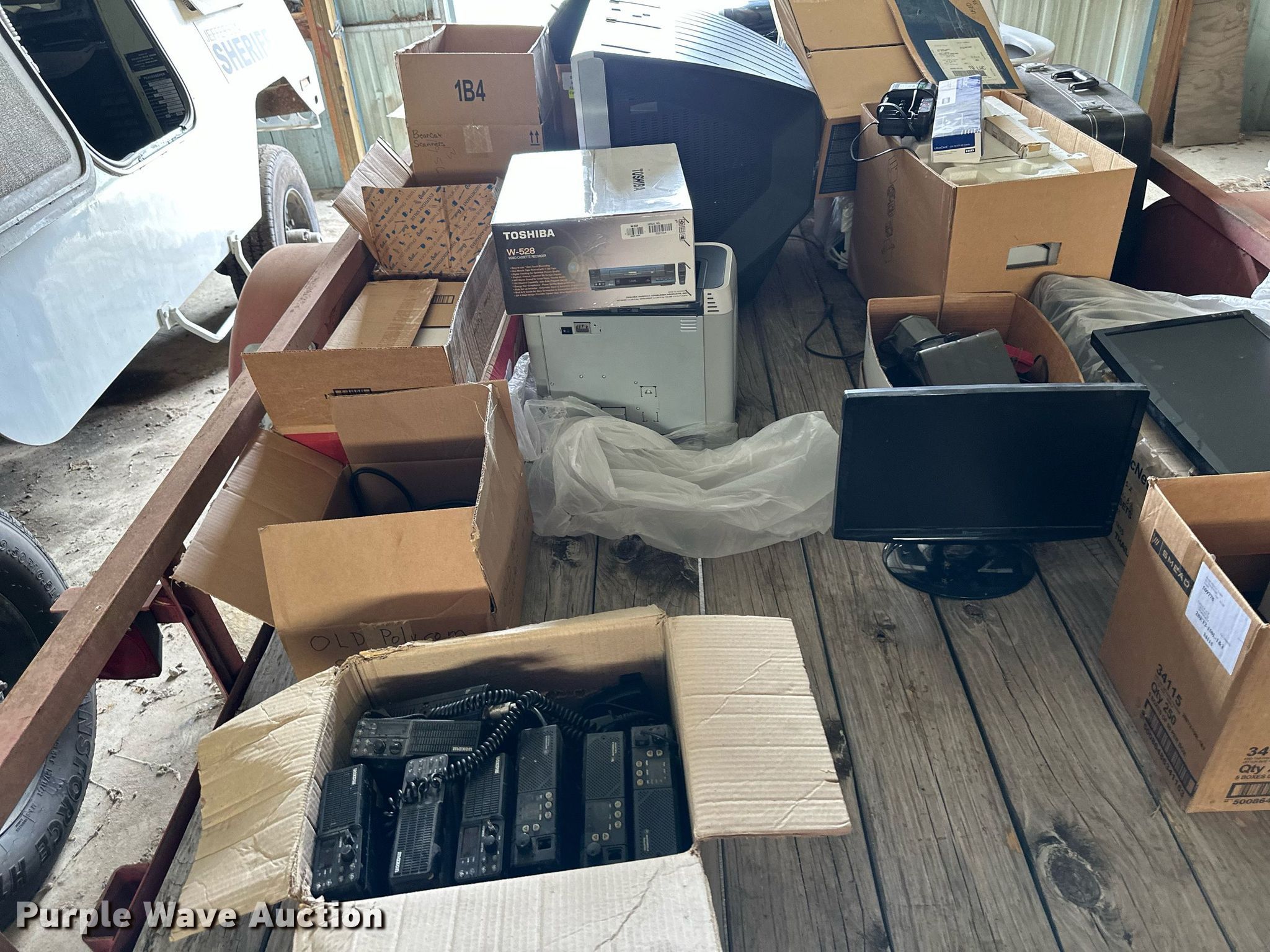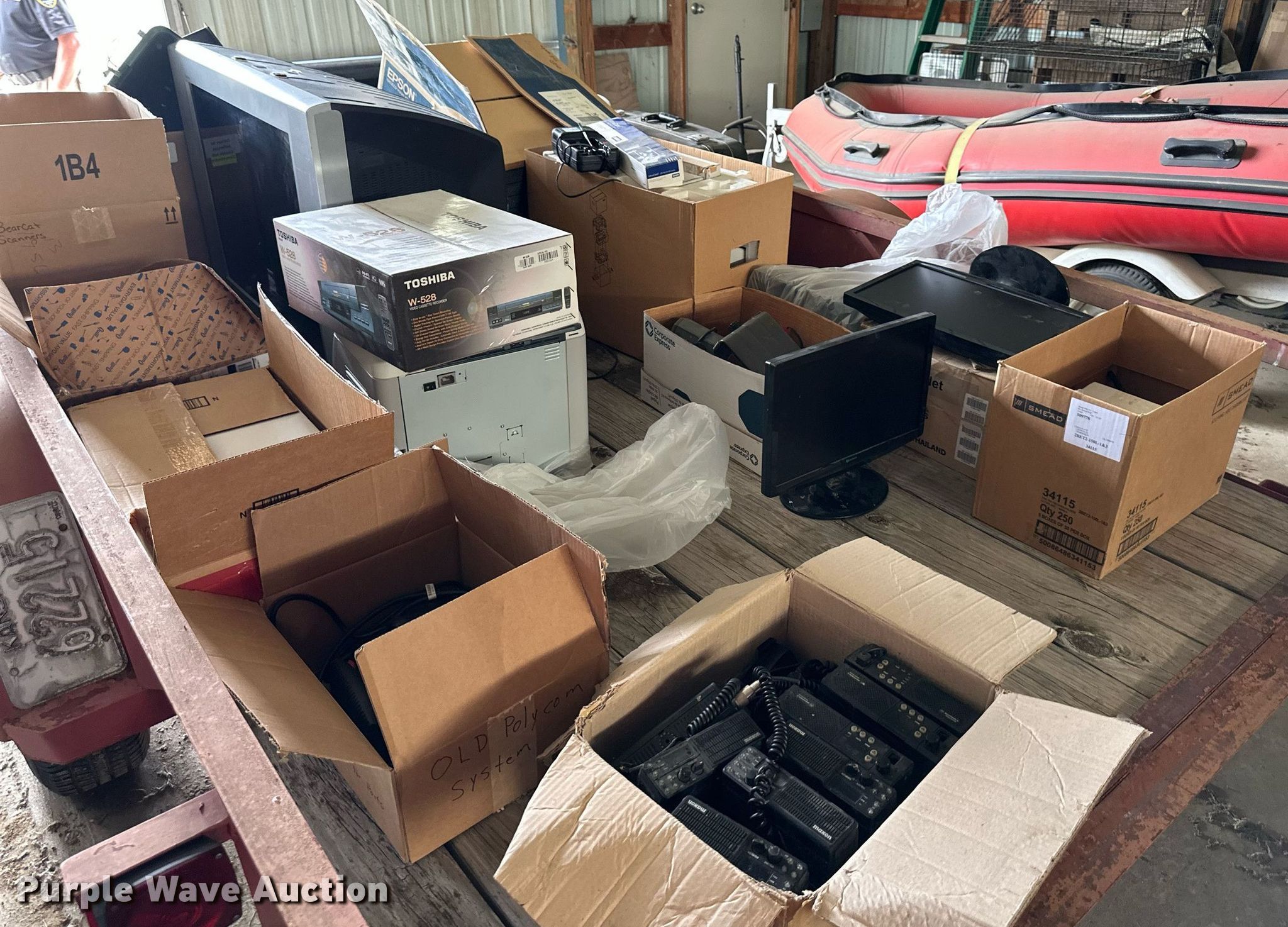 Purple Wave is selling a used Electronics in Kansas. This item is a Electronics with the following: (3) monitor mounts, (4) fax machines, (2) printers, Bosch camera system, (11) BearCat 800A scanners, Television, Sony DVD player, (2) Meridian phones, Toshiba VHS player, Poly communication video system, (10) Maxon VHF SM-4150M, (5) Motorola VHF radios, (2) monitors, Wave alarm system, (2) Custom KR101 Custom Pro1000 radar unit, LamCraft camera, Elton P420 card printer, Toilet and more