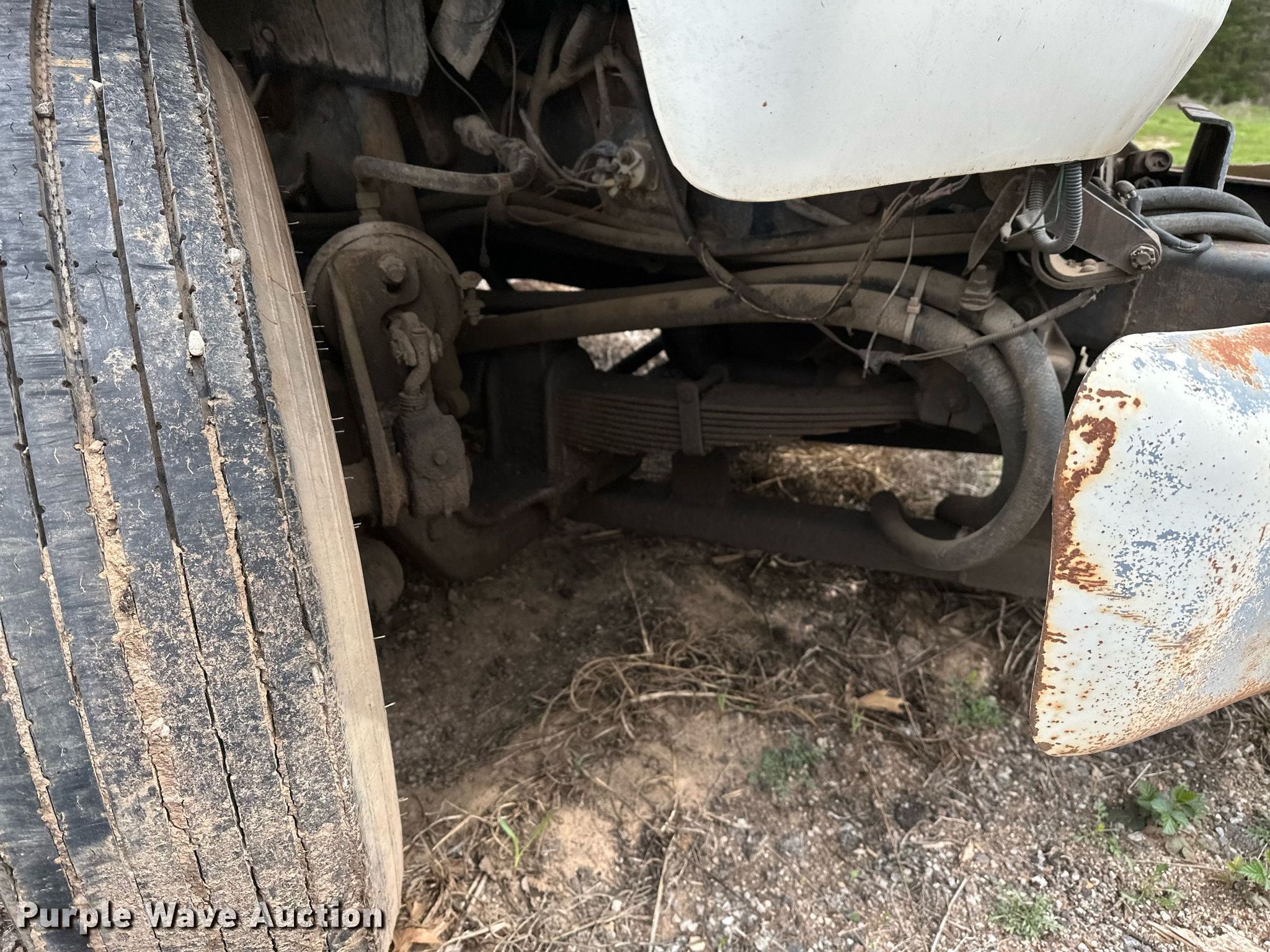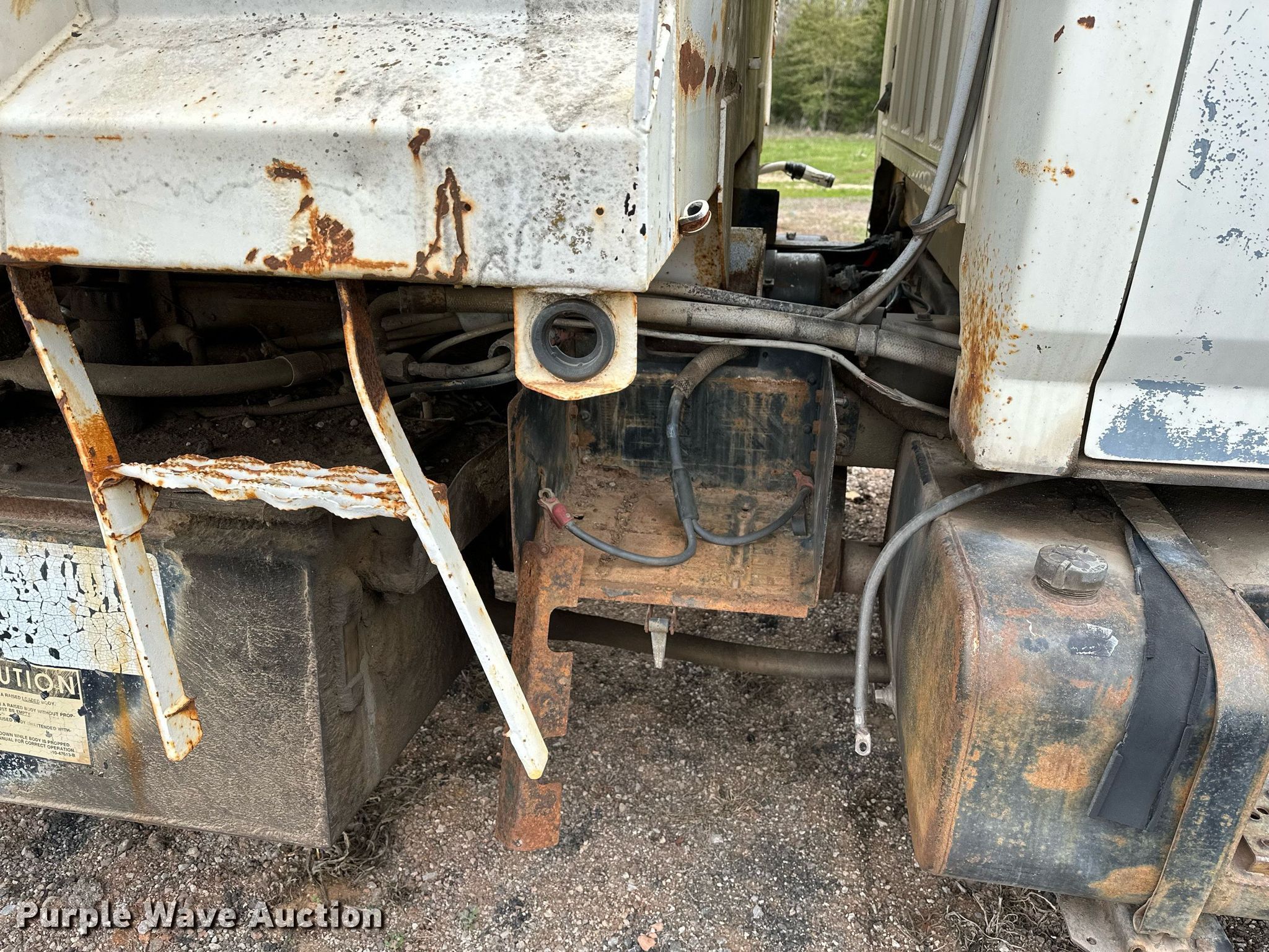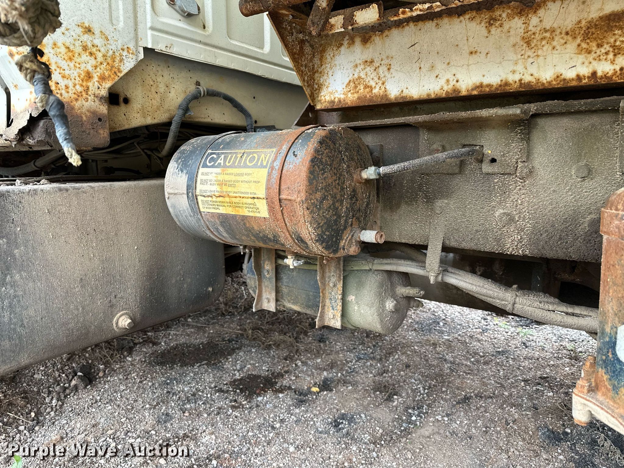 1993 Ford FT900 dump truck. Miles: 104,115 on odometer, VIN: 1FDYL90E1PVA09955. Engine Cummins, Displacement: 8.3L, Cylinders: 6. Transmission Automatic. Chassis Axles: Tandem, Differential lock: Inter-axle, Suspension: Spring, Brakes: Air, PTO, GVWR: 46,000 lbs. Interior Heat. Features Dump bed Galion, 14' L x 96" W, Side height: 45", Bed type: Steel, Ram: Single, Spreader Dimensions: 144" L x 80" W x 49" H, Plow Width: 132". Tires Size: 11R22.5. Notes Tire off bead, Rodent damage, Contents not included, Unknown operating condition of plow and spreader , Non-operational engine, Non-operational unit. Oklahoma title. Creek County, OK. 620 Industrial Rd. Bristow, OK 74010
