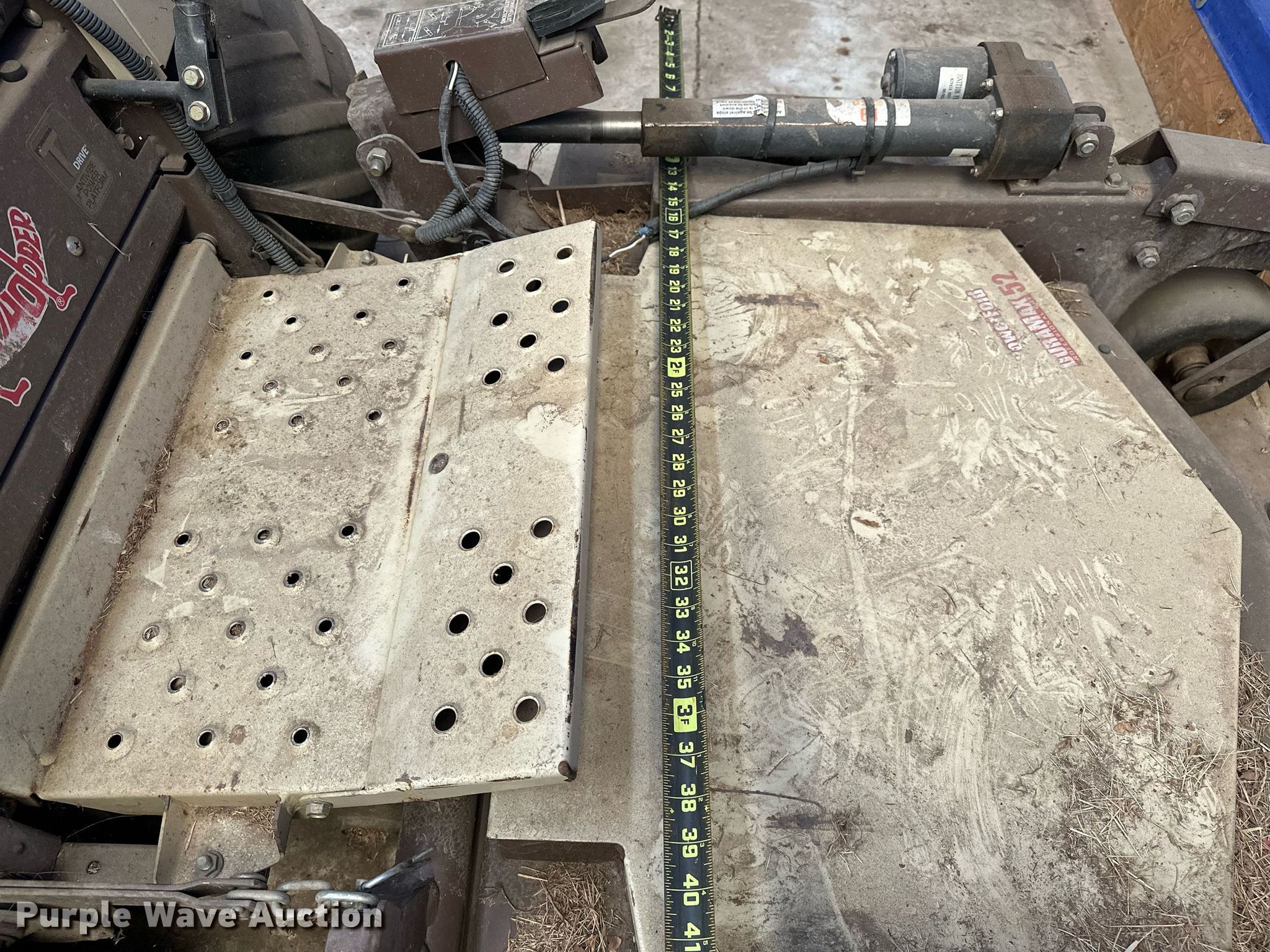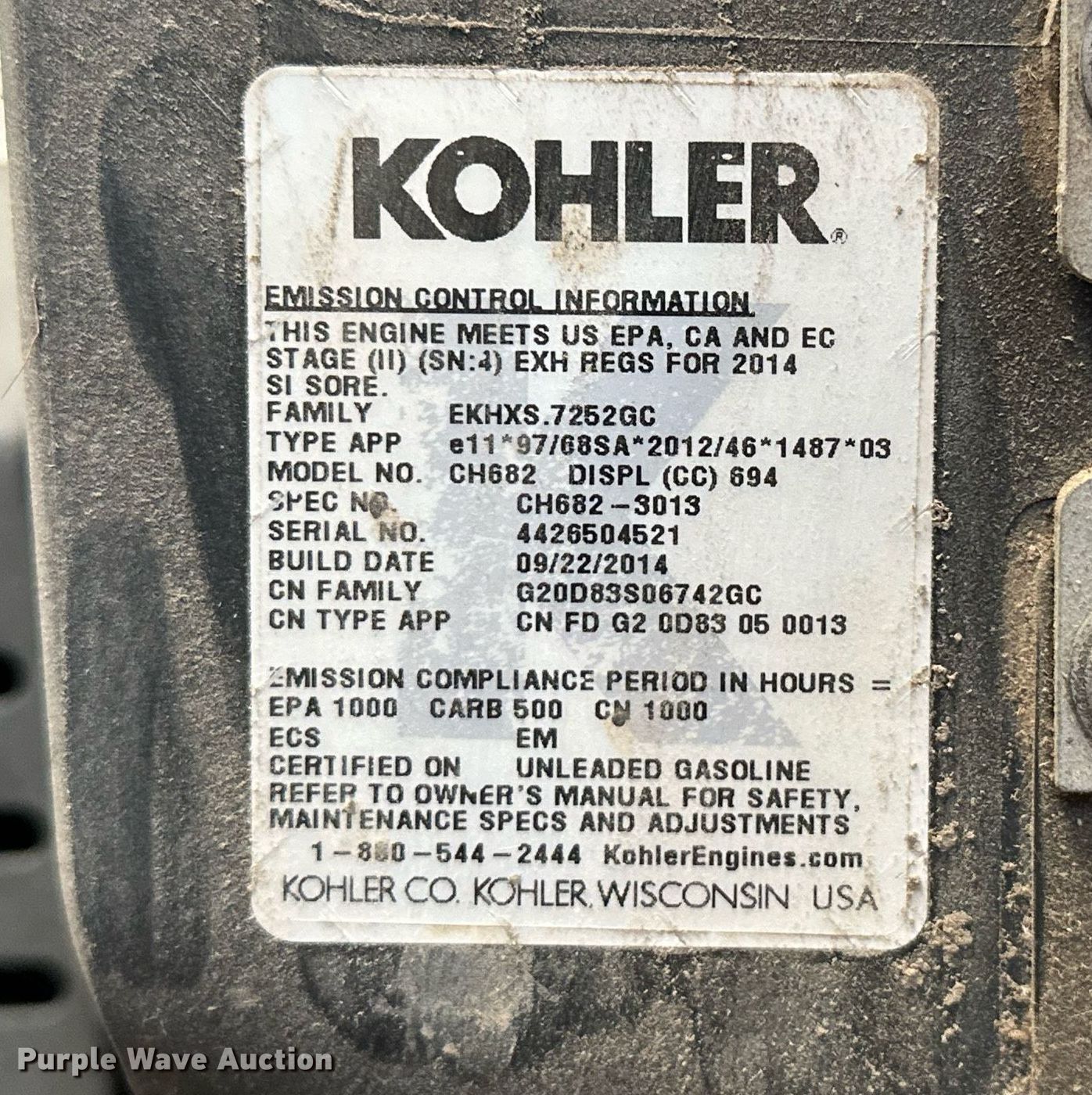 Grasshopper 623T ZTR lawn mower. Hours: 103 on meter, Cutting width: 52", Serial: 6416771. Engine Kohler CH682, Displacement: 894 cc, Cylinders: 2, Fuel type: Gas. Transmission Hydrostatic. Features Grass bagger, Hydraulic front deck lift. Tires Rear: 21x11.00-8. Notes Battery missing, Non-operational unit. Connors State College. 700 College Rd.. Warner, OK 74469