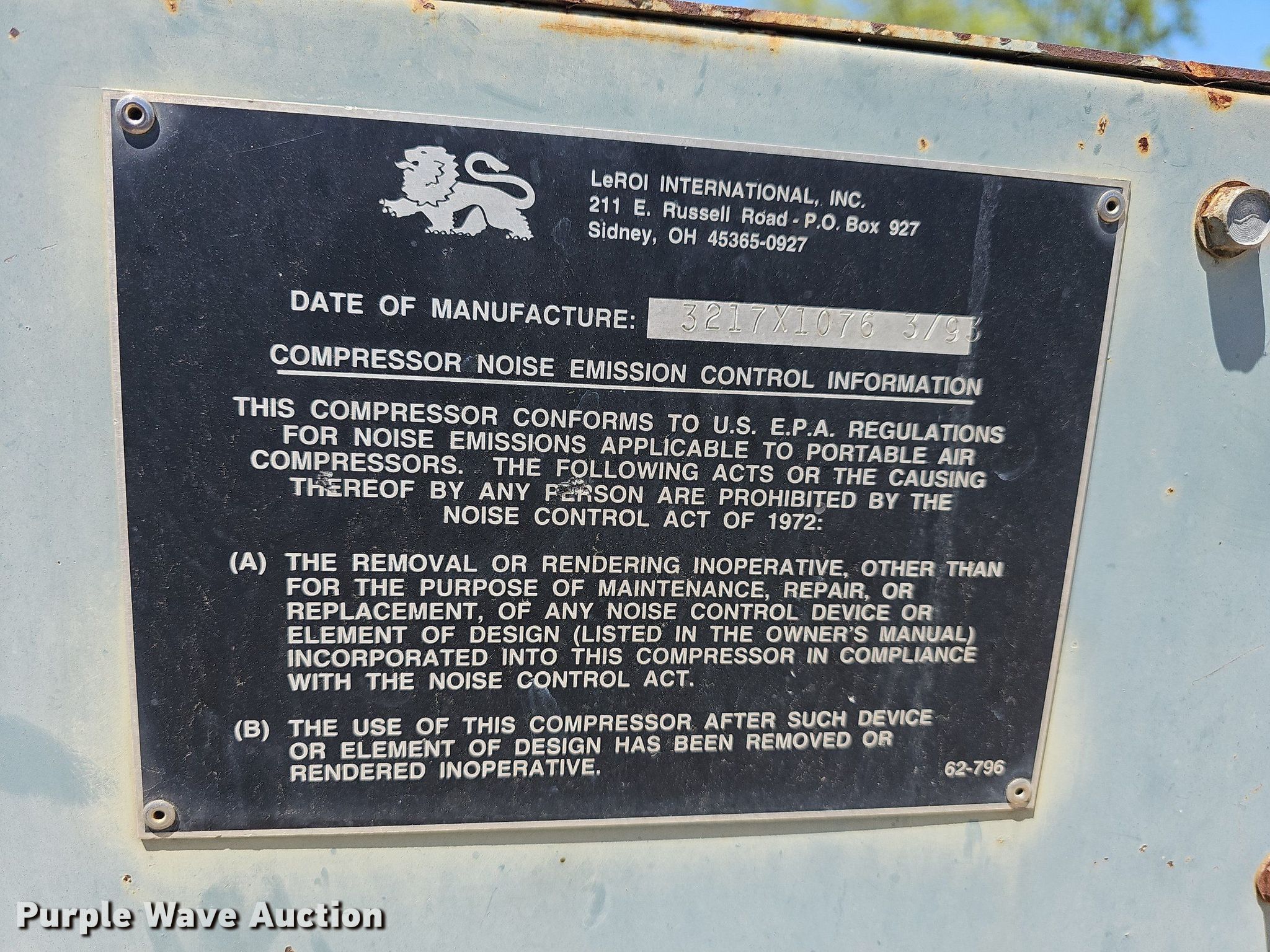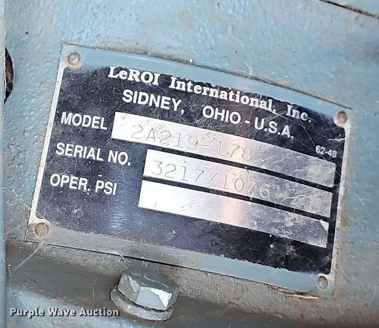 1993 Leroi air compressor. Hours: 656 on meter, Serial: 3217X1076. Engine John Deere, Cylinders: 4, Fuel type: Diesel. Features Air compressor Leroi 2A219-178, PSI: 185. Trailer 12' L x 74" W, Ball hitch size: 2", Suspension: Spring, Axles: Single, Tire size: 7.00-15.00. Transfer of ownership documentation will be a bill of sale which will be assigned and distributed by the seller. County of Dade, MO. 306 E 6th St. Lockwood , MO 65682