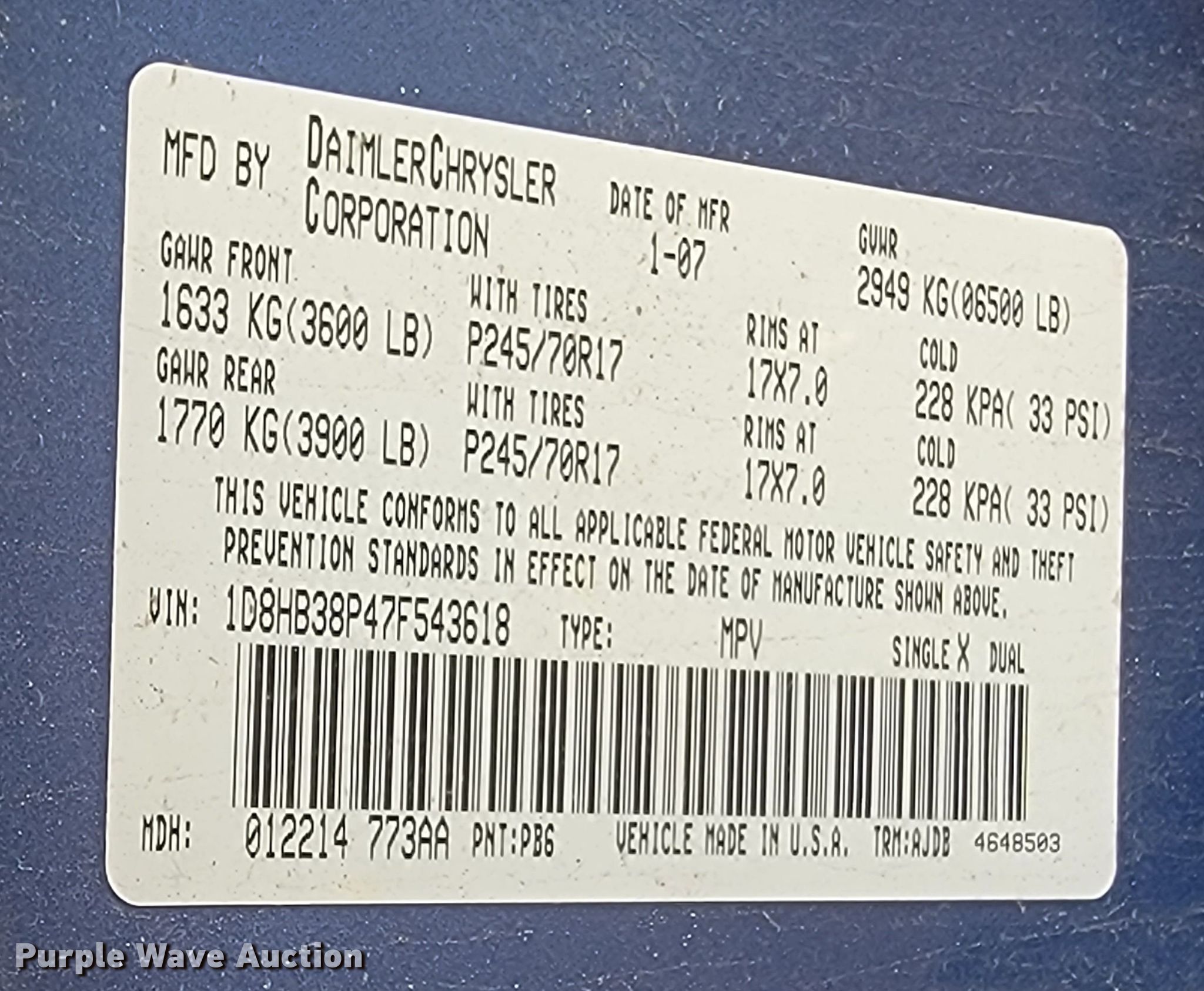 Purple Wave is selling a used Passenger Vehicle in South Dakota. This item is a 2007 Dodge Durango SUV with the following: Miles: 135,282 on odometer, VIN: 1D8HB38P47F543618