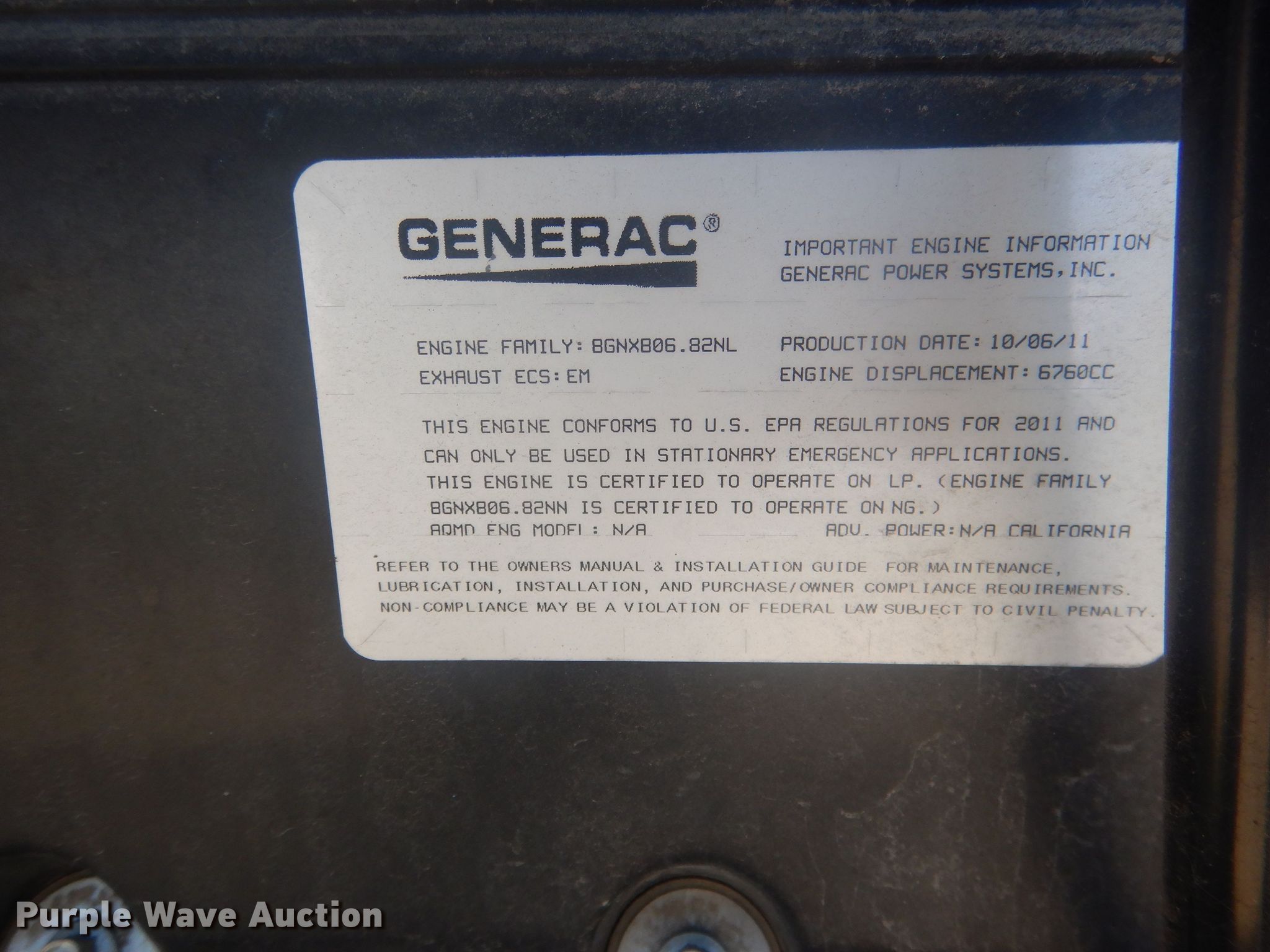 Olympian G70LG2 generator. Hours: 149 on meter, Serial: GXC01324. Engine Generac BGNXB06.82NL, Displacement: 6.8L, Cylinders: 10, Fuel type: LPG. Features kVA: 70, kW: 70, Phase: Single, Backup start, Electric start, Skid mounted. D12 Industries. 415 South Maple Street. North Platte, NE 69101