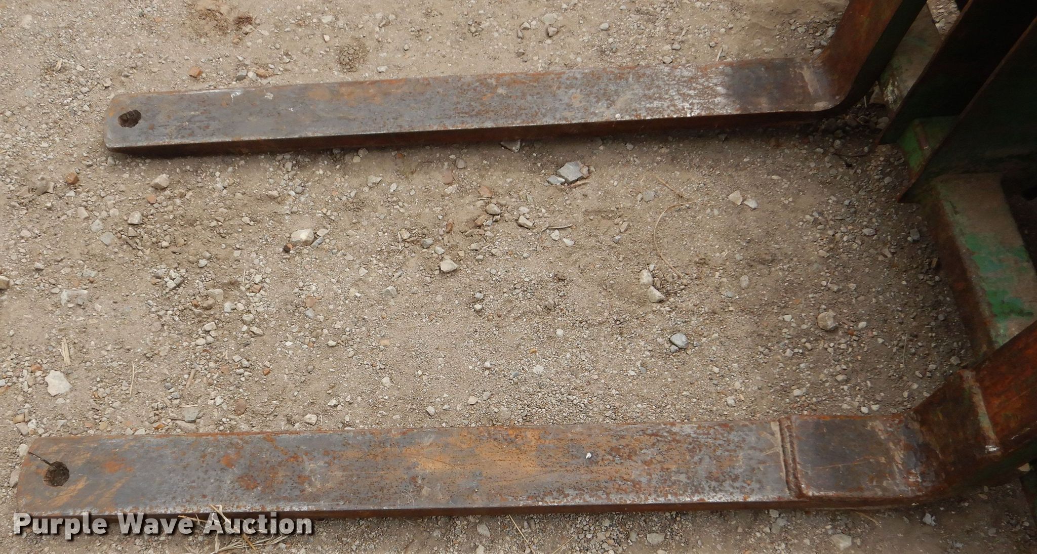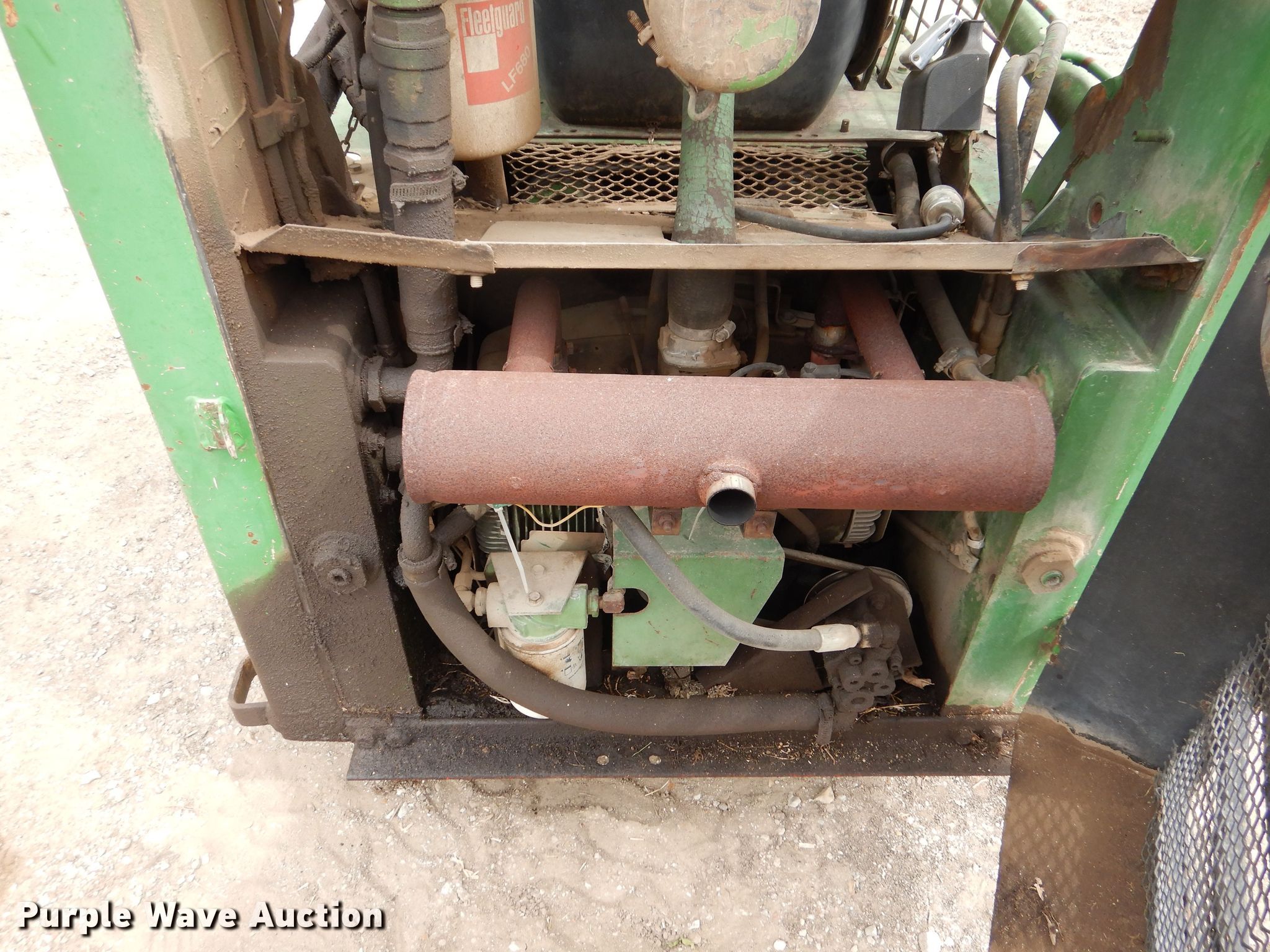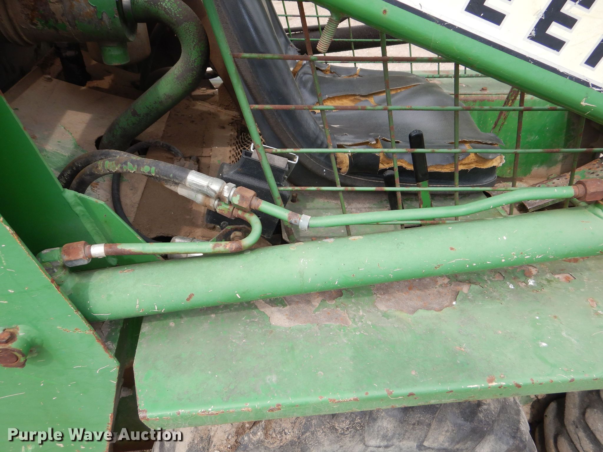 John Deere 90 skid steer loader. Hours: 1,180 on meter, Serial: 190210M. Engine Cylinders: 2, Fuel type: Gas. Operators station OROPS, Bucket control: Foot. Features Bucket Width: 48", Cutting edge: Weld-on, Bucket Width: 48", Teeth: 7, Forks Length: 41". Tires Front: 27x8.50-15, Brand: Firestone. Notes Wheel bearing issues. Leonardville, KS 66449