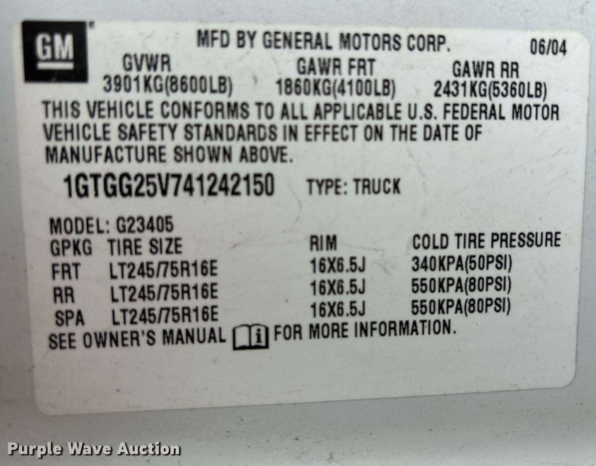 Purple Wave is selling a used 3/4 or 1 Ton Pickup or Van in Iowa. This item is a 2004 GMC Savana G2500 van with the following: Miles: 298,969 on odometer, VIN: 1GTGG25V741242150, Unit #: 72