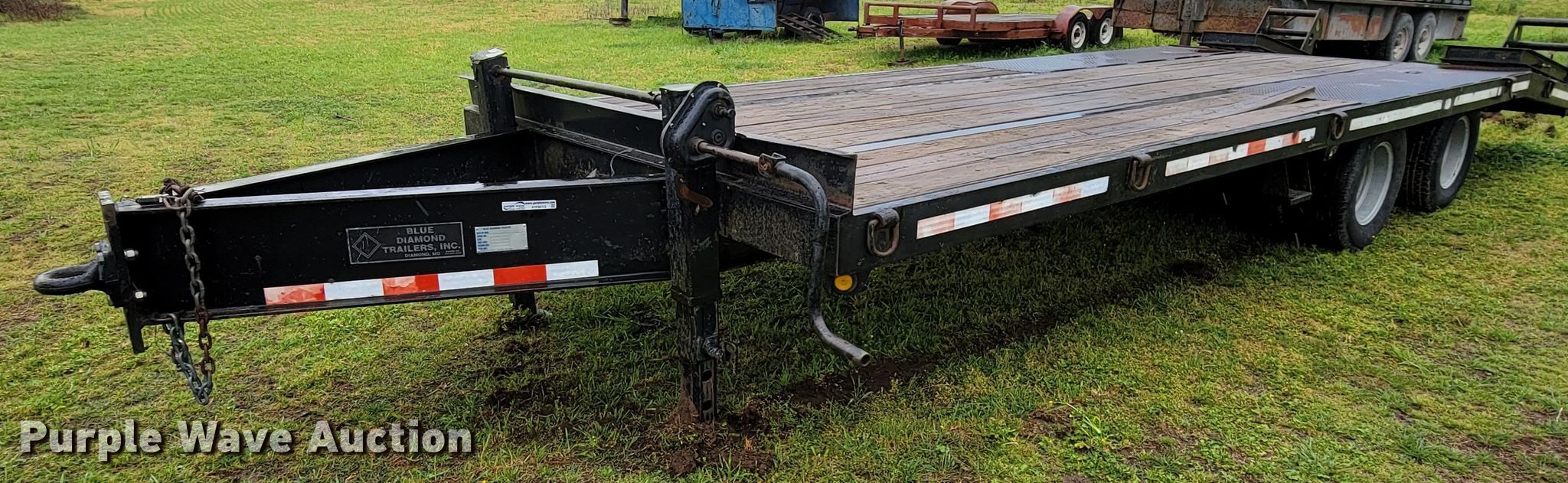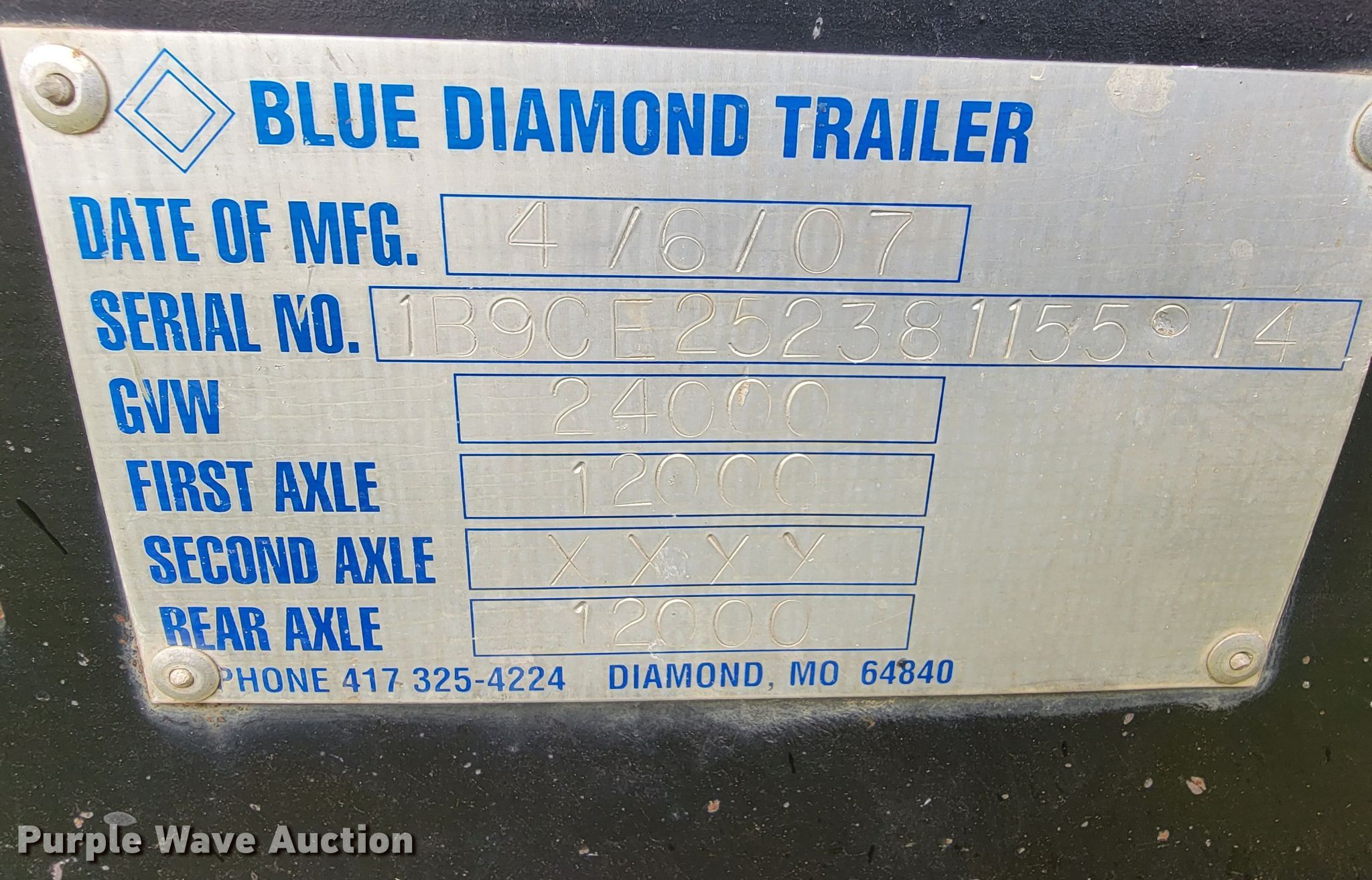 2007 Blue Diamond equipment trailer. VIN: 1B9CE252381155914. Dimensions Overall: 30' L x 98" W, Deck: 20' L x 98" W, Deck height: 33", Tail length: 5', Ramps: Manual Length: 5'. Features Deck type: Wood. Chassis Hitch: Pintle, Landing gear: Dual, Suspension: Spring, Brakes: Electric, Axles: Tandem, GVWR: 24,000 lbs. Tires Size: 235/80R16. Missouri title. Title distribution may be delayed up to 14 days from verification of funds. Sarcoxie, MO 64862