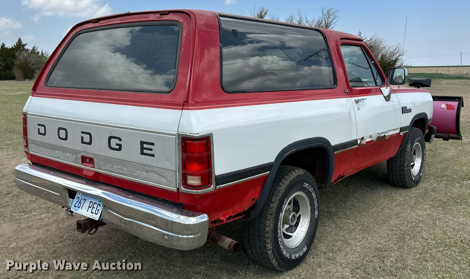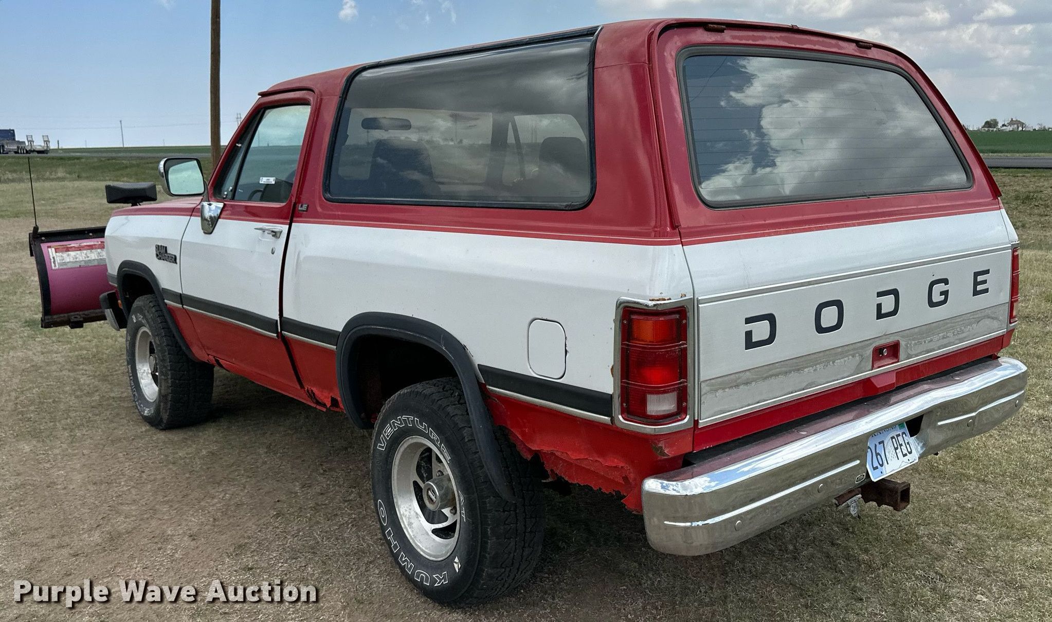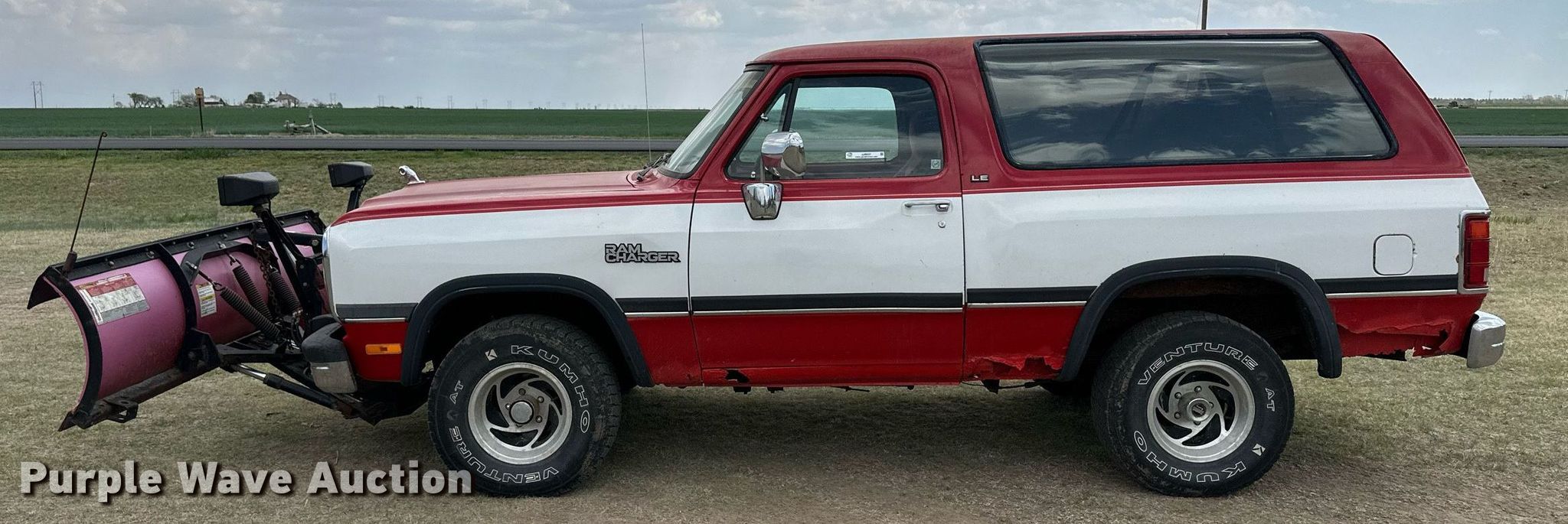 1993 Dodge Ram Charger SUV. Miles: 112,388 on odometer, VIN: 3B4GM17Z5PM128736. Engine Displacement: 5.9L V8 OHV, Cylinders: 8, Fuel type: Gas. Transmission Automatic, Four wheel drive. Features Western snow plow Width: 90". Interior AC, Heat, Power windows, Power locks, Cruise control. Tires Size: 31x10.50R15. Kansas title. Title distribution may be delayed up to 30 days from verification of funds. 159 North K-23. Dighton, KS 67839
