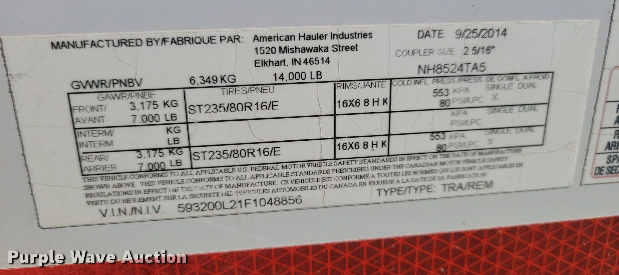 2015 American Hauler enclosed cargo trailer. VIN: 593200L21F1048856. Dimensions Overall: 29' 6" L x 101" W, Body: 24' L x 102" W. Features Deck type: Wood. Chassis Ball hitch: 2 5/16", Landing gear: Single, Suspension: Spring, Brakes: Electric, Axles: Tandem, GVWR: 14,000 lbs, GAWR: 7,000 lbs. Tires Steel wheels, Size: ST235/85R16. Iowa title. Seller is an Iowa licensed motor vehicle dealer. The buyer may be required to pay sales tax and/or registration fees to the dealer prior to taking possession. Buyers may be required to provide identification to the licensed dealer to comply with Iowa state laws. Title will be assigned and distributed by the dealer. Please contact the seller for distribution questions. Midwest Auto Sales. 6229 US Highway 63. Ottumwa, IA 52501