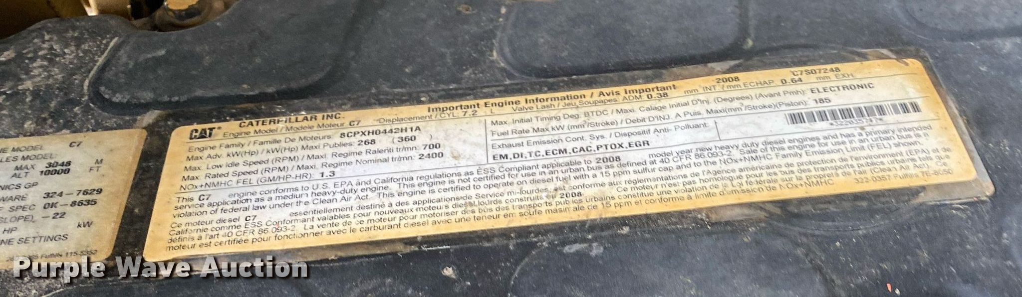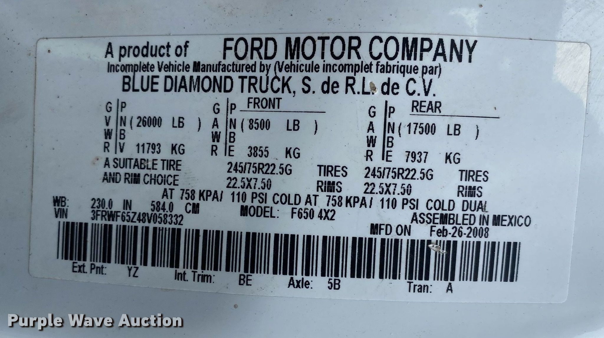 2008 Ford F650 Super Duty XLT flatbed truck. Miles: 123,319 on odometer, VIN: 3FRWF65Z48V058332. Engine Caterpillar C7, Displacement: 7.2L, Cylinders: 6, Fuel type: Diesel, HP: 360. Transmission Automatic. Chassis Axles: Single, Suspension: Spring, Brakes: Air, GVWR: 26,000 lbs, Wheelbase: 230". Interior AC, Heat. Features Flatbed 18' 4" L x 96" W. Tires Size: 10R22.5. Notes Dash warning indicator: Check engine, Driver side mirror missing. Oklahoma title. 15107 North 137th East Avenue. Collinsville, OK 74021