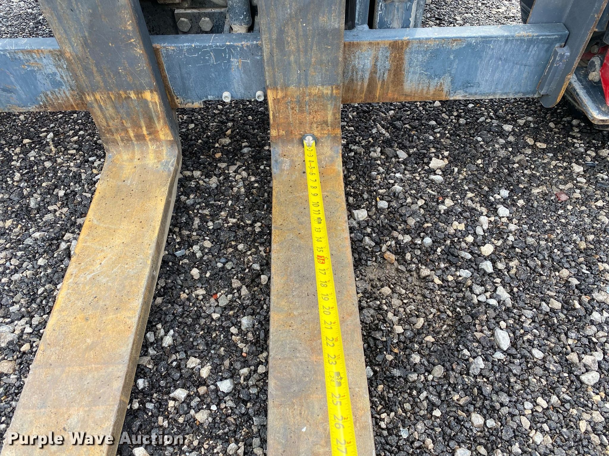 2014 Moffett M70 forklift. Hours: 659 on meter, Serial: N080478. Engine Cylinders: 4, Fuel type: Diesel. Transmission Hydrostatic. Chassis Differential lock. Operators station Canopy. Features Maximum lift capacity: 7,000 lbs, Maximum lift height: 144", Mast stages: 2, Side shift, Mast tilt, Fork length: 48". Tires Size: 31x15.5-15. 15107 North 137th East Avenue. Collinsville, OK 74021