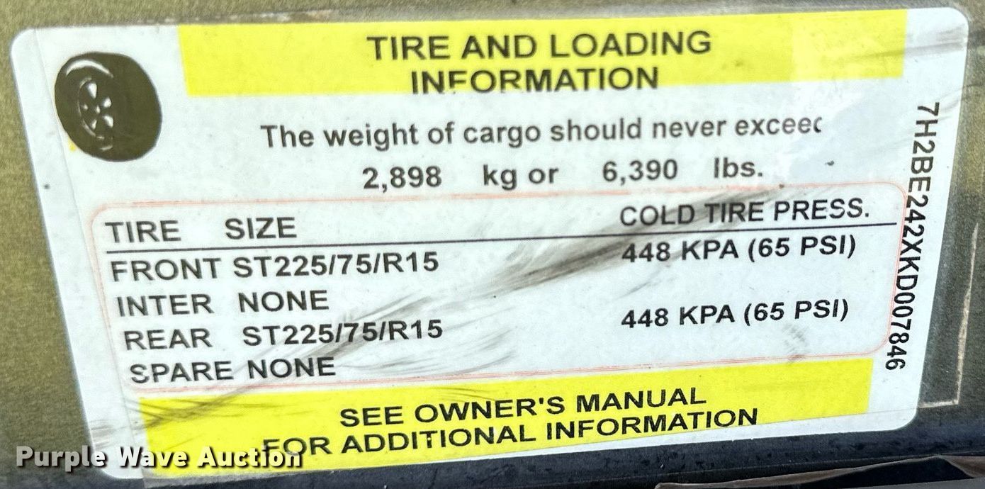 2019 Rock Solid Cargo enclosed cargo trailer. VIN: 7H2BE242XKD007846. Dimensions Overall: 29' L x 100" W, Body: 24' L x 100" W. Features Deck type: Wood, Badland ZXR 5000 winch. Chassis Ball hitch: 2 5/16", Landing gear: Single, Suspension: Spring, Brakes: Electric, Axles: Tandem, GVWR: 9,990 lbs. Tires Steel wheels, Size: 225/75D159. Kansas title. Title distribution may be delayed up to 14 days from verification of funds. Fleet Serve, LLC. Manhattan, KS 66502