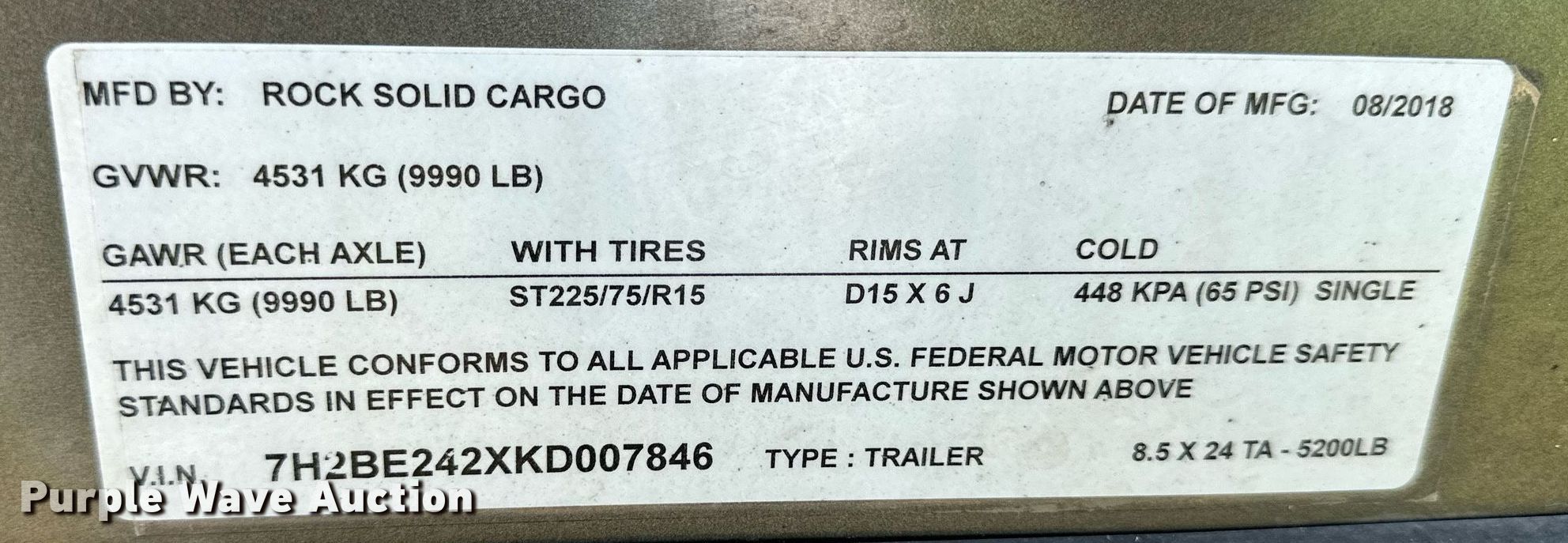 Purple Wave is selling a used Enclosed Cargo Trailer in Kansas. This item is a 2019 Rock Solid Cargo enclosed cargo trailer with the following: VIN: 7H2BE242XKD007846