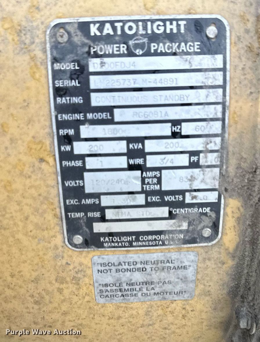 Purple Wave is selling a used Generator Set in Minnesota. This item is a Katolight D200FDJ4 generator with the following: Hours: 7,905 on meter, Serial: LM225737 M-44891