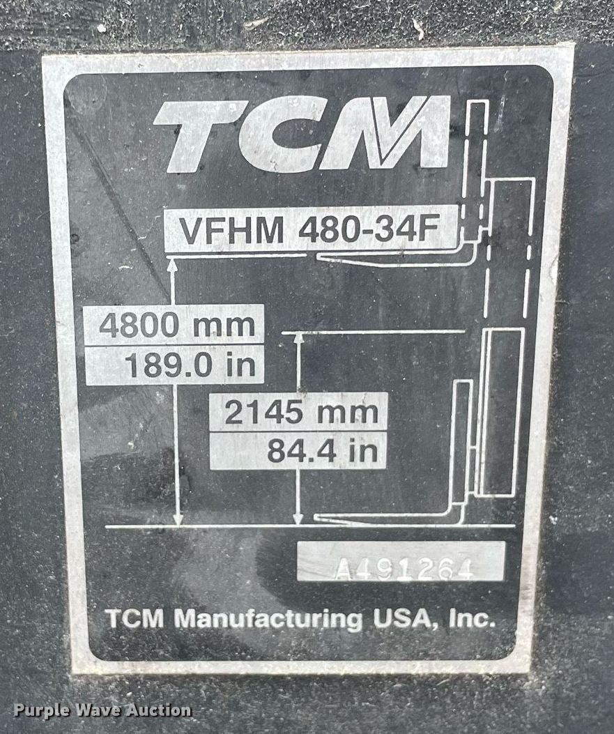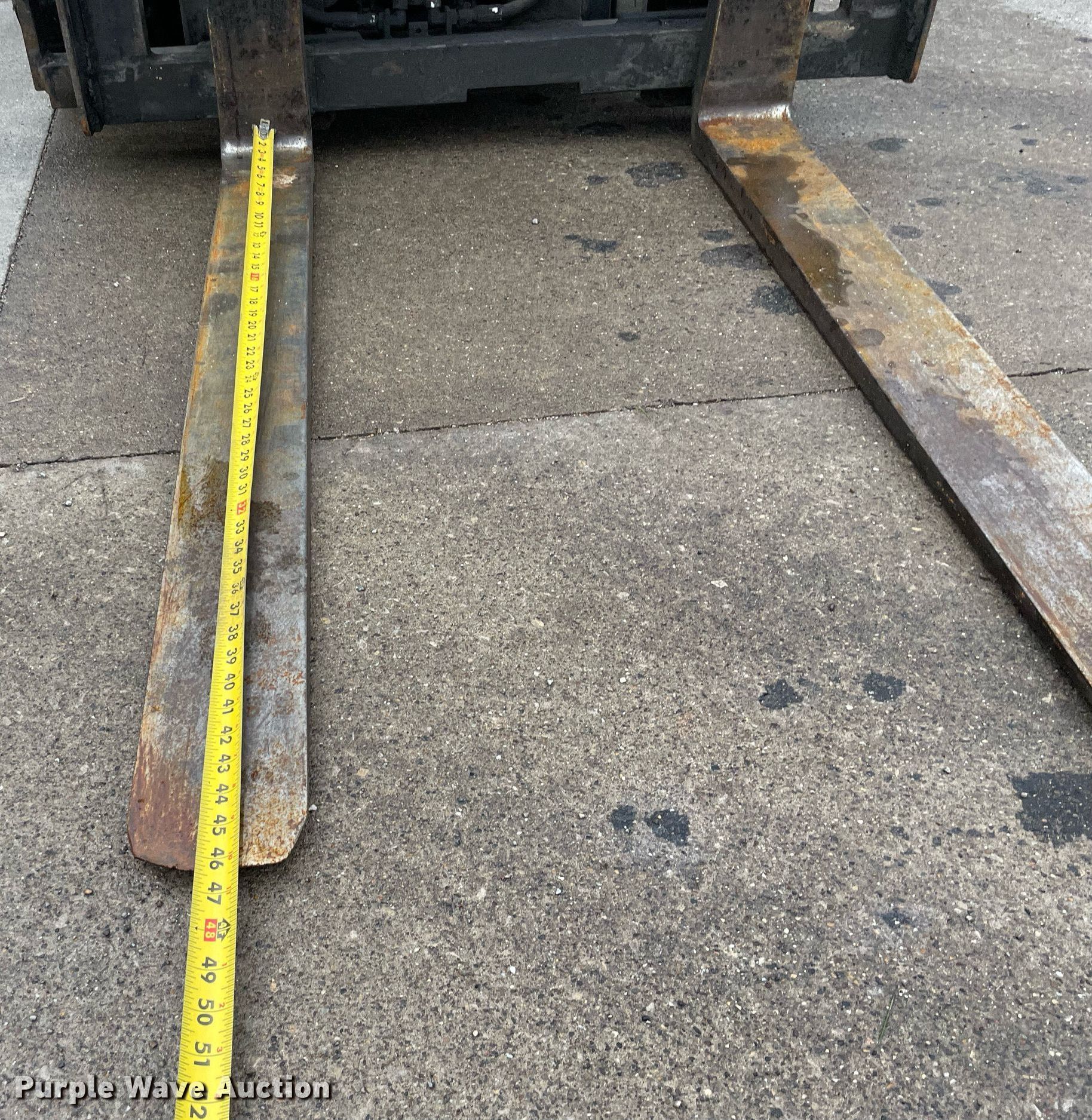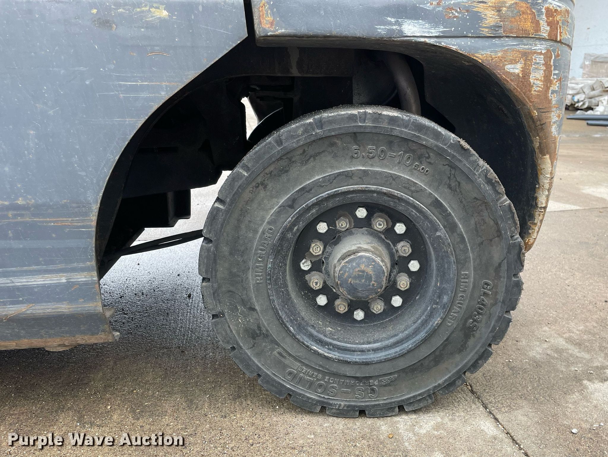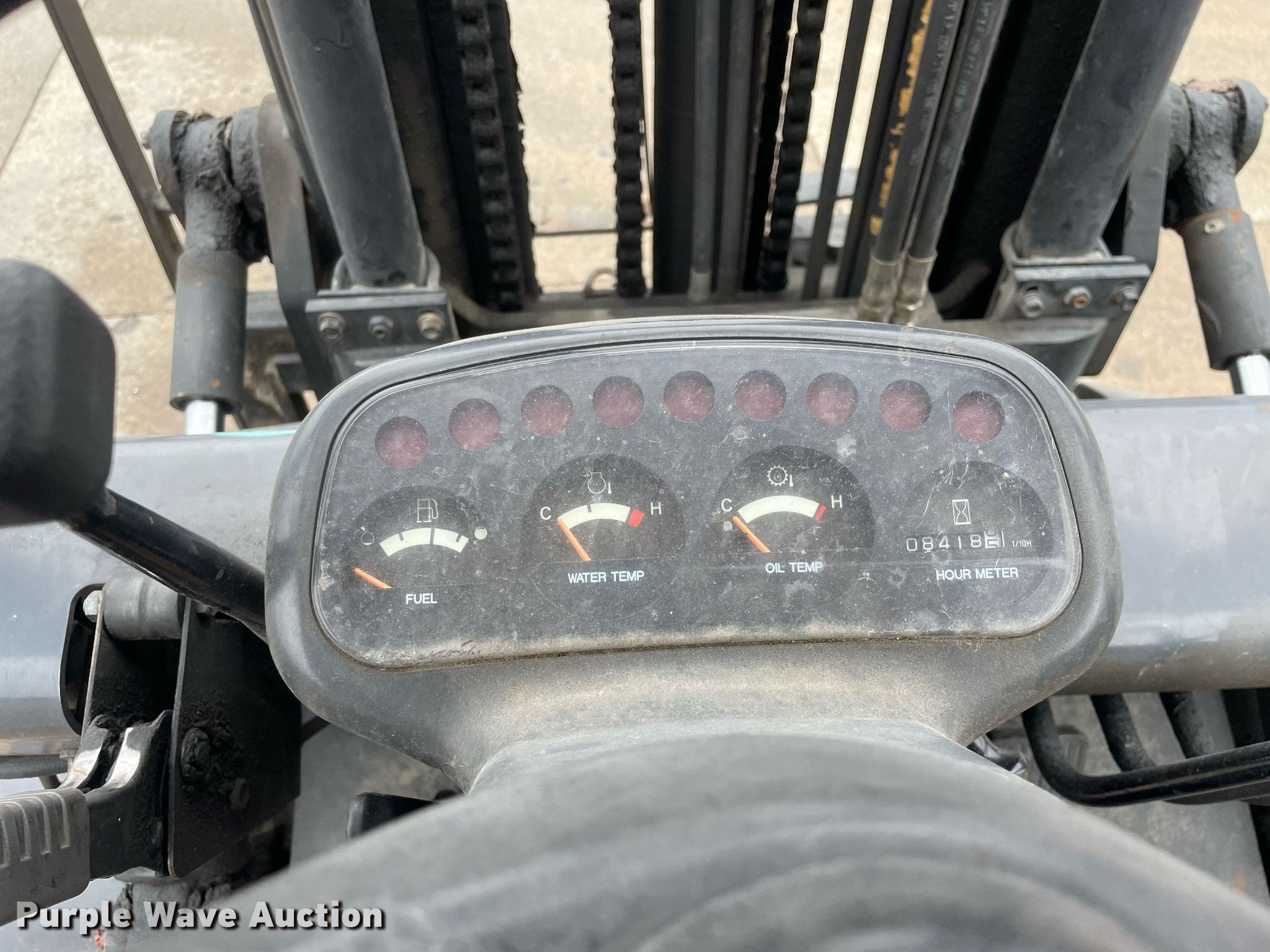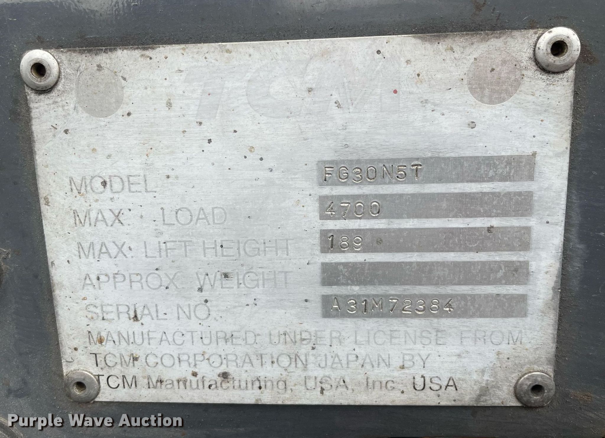 TCM FG30N5T forklift. Hours: 8,419 on meter, Serial: A31M72384. Engine Nissan, Cylinders: 4, Fuel type: LPG, Dual fuel LP bottle: Not included. Transmission Powershift. Operators station OROPS. Features Maximum lift capacity: 4,700 lbs, Maximum lift height: 189", Mast stages: 3, Side shift, Mast tilt, Fork length: 46". Tires Front: 28x9-15, Rear: 6.50-10, Solid. R.P. Lumber Co., Inc.. Morton, IL 61550