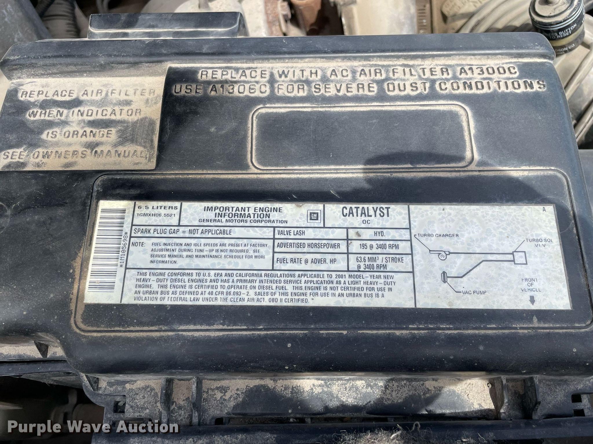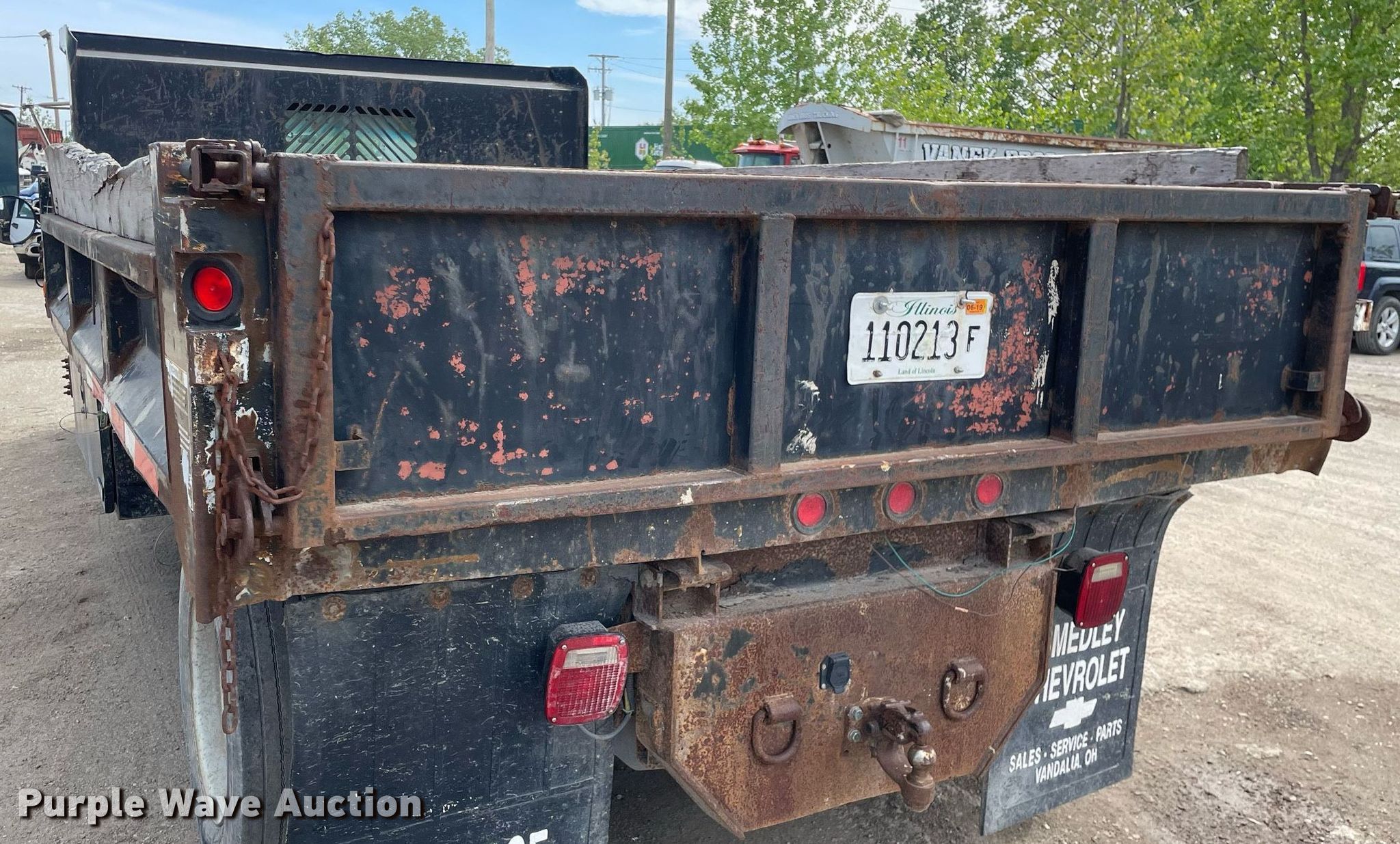 2001 Chevrolet Silverado 3500HD dump bed pickup truck. Miles: 161,495 on odometer, Miles or hours may vary, unit still in use, VIN: 3GBKC34F51M105698. Engine Displacement: 6.5L V8 OHV, Cylinders: 8, Fuel type: Diesel. Transmission Automatic. Chassis Axles: Single, Suspension: Spring, Brakes: Hydraulic, GVWR: 15,000 lbs. Interior AC, Heat, Brake controller. Features Dump bed Rugby, 12' L x 96" W, Side height: 16", Side board height: 9", Bed type: Steel, Ram: Single , End gate: Manual. Tires Size: 225/70R19.5. Notes Dash warning indicator: Service engine soon. Illinois title. Title distribution may be delayed up to 14 days from verification of funds. 1500 South Western Avenue. Chicago, IL 60608