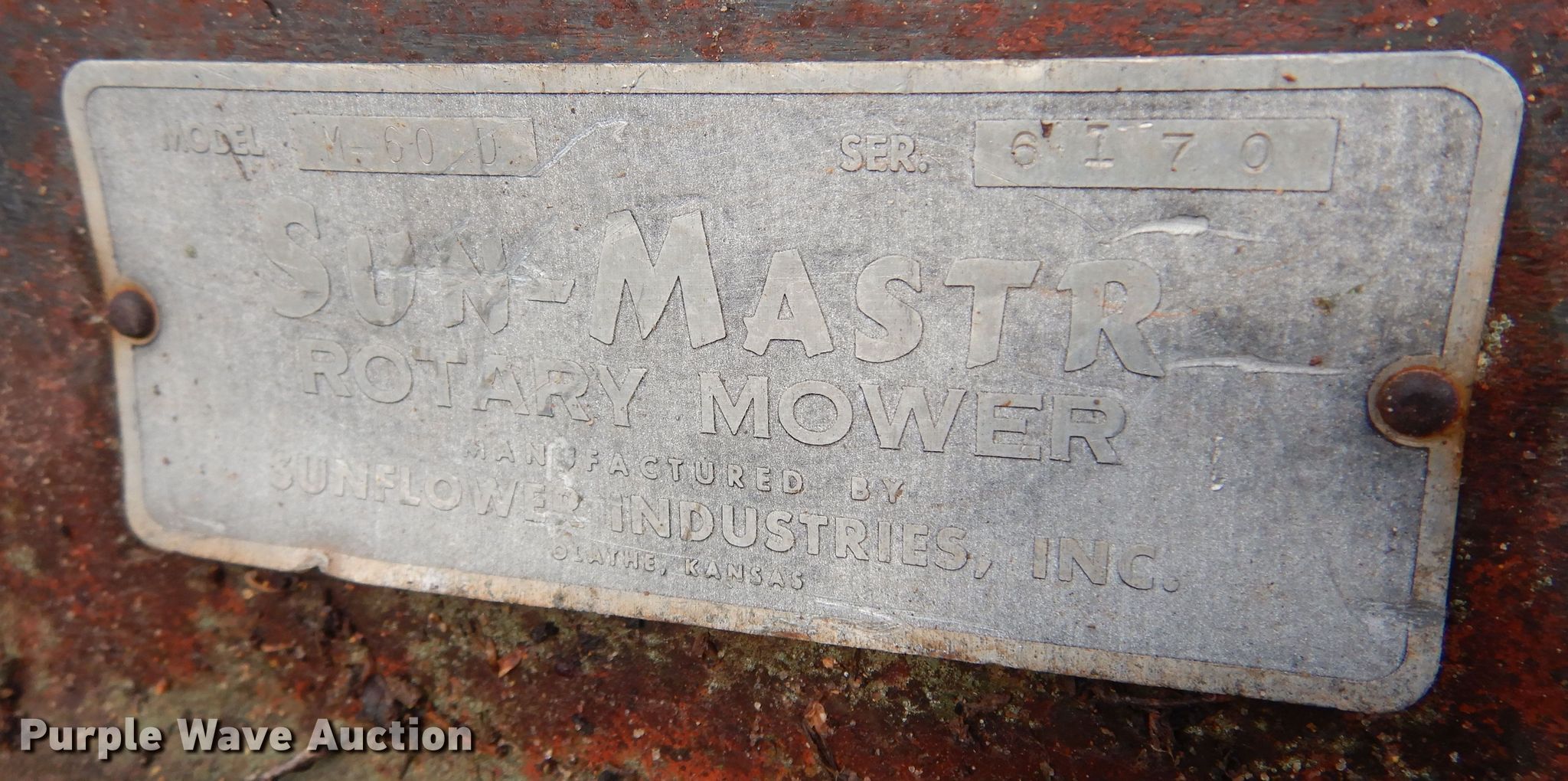 Purple Wave is selling a used Mower, Cutter, Shredder in Kansas. This item is a Sun Master rotary mower with the following: Serial: 6170