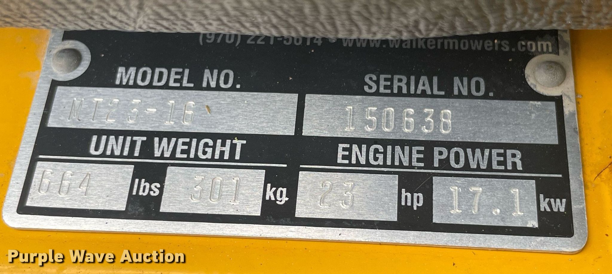 Purple Wave is selling a used Lawn Mower in Kansas. This item is a Walker MT23-16 ZTR lawn mower with the following: Hours: 2,023 on meter, Cutting width: 48", Serial: 150638