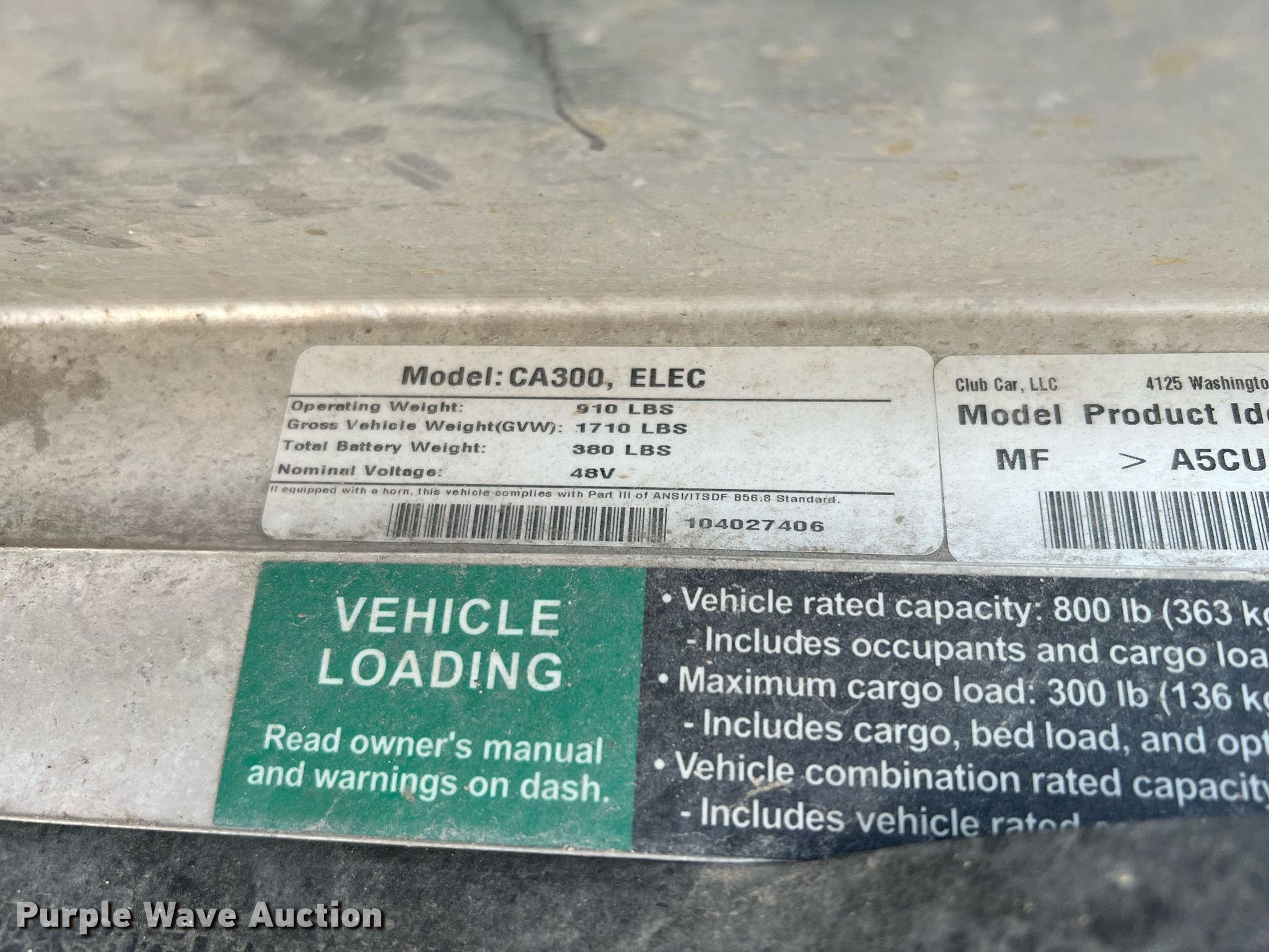 Club Car Carryall 300 golf cart. Hours: 678 on meter, Serial: MF1734-823521. Electric Motor Club Car EJ8-4001A, HP: 3.3, Volts: 48. Transmission Automatic. Operators station Canopy, Passengers: 2. Features Receiver hitch, Dump bed 36" L x 48" W, Dump bed type: Manual. Tires Size: 20x10.00-10. Plunkett Enterprises. 1825 County Road 212. Angleton, TX 77515
