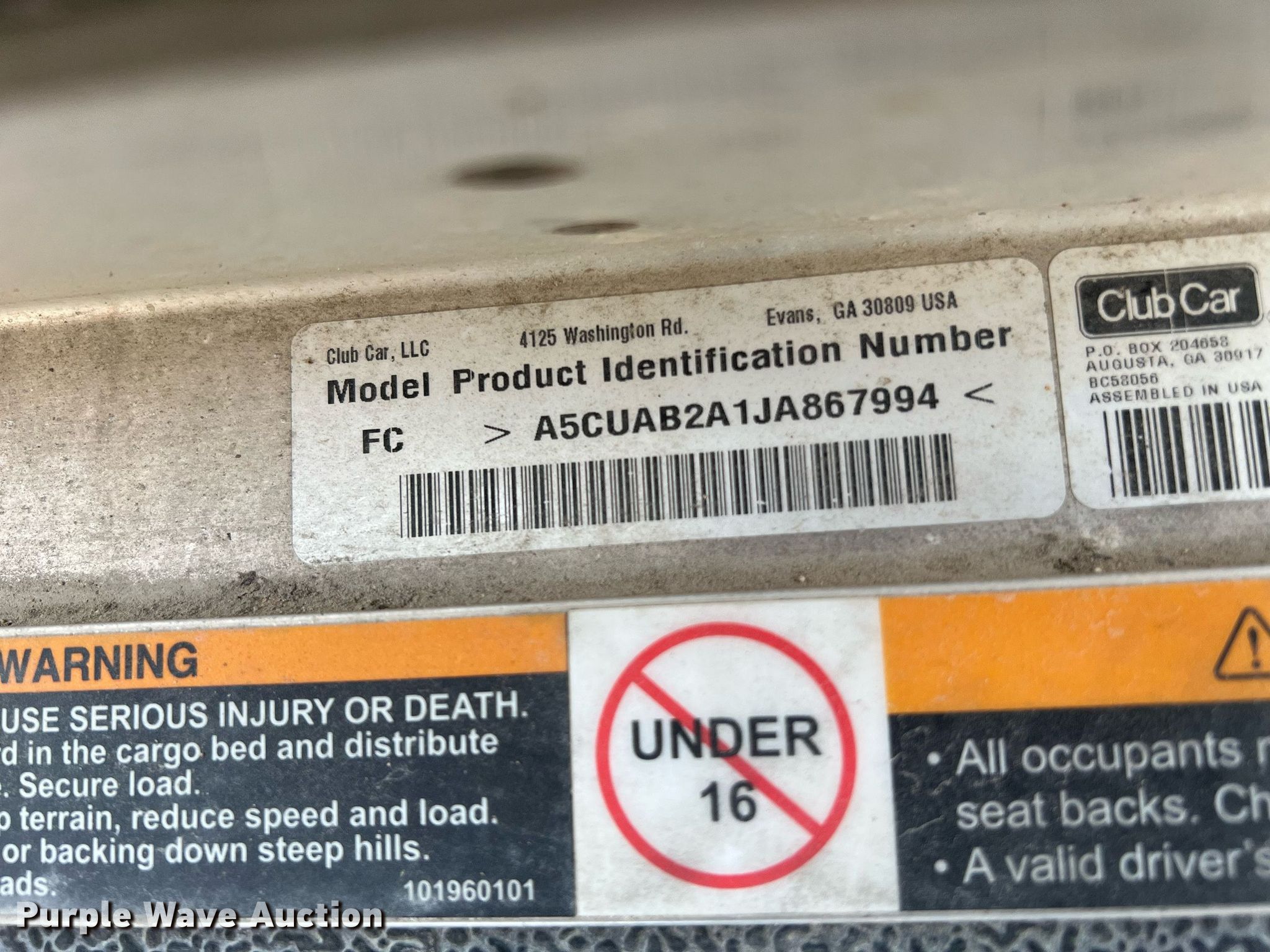 Purple Wave is selling a used Golf Cart in Texas. This item is a Club Car Carryall 100 golf cart with the following: Serial: FC1818-867994