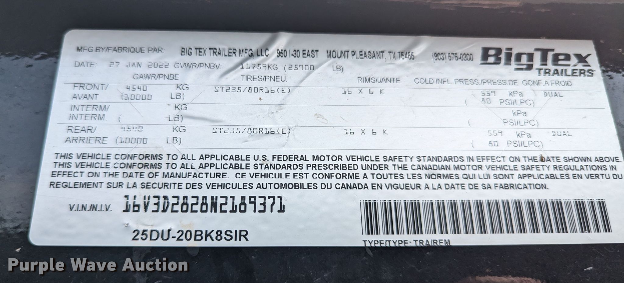 Purple Wave is selling a used Dump Trailer in Oklahoma. This item is a 2022 Big Tex 25DU-20BK8SIR dump trailer with the following: VIN: 16V3D2828N2189371