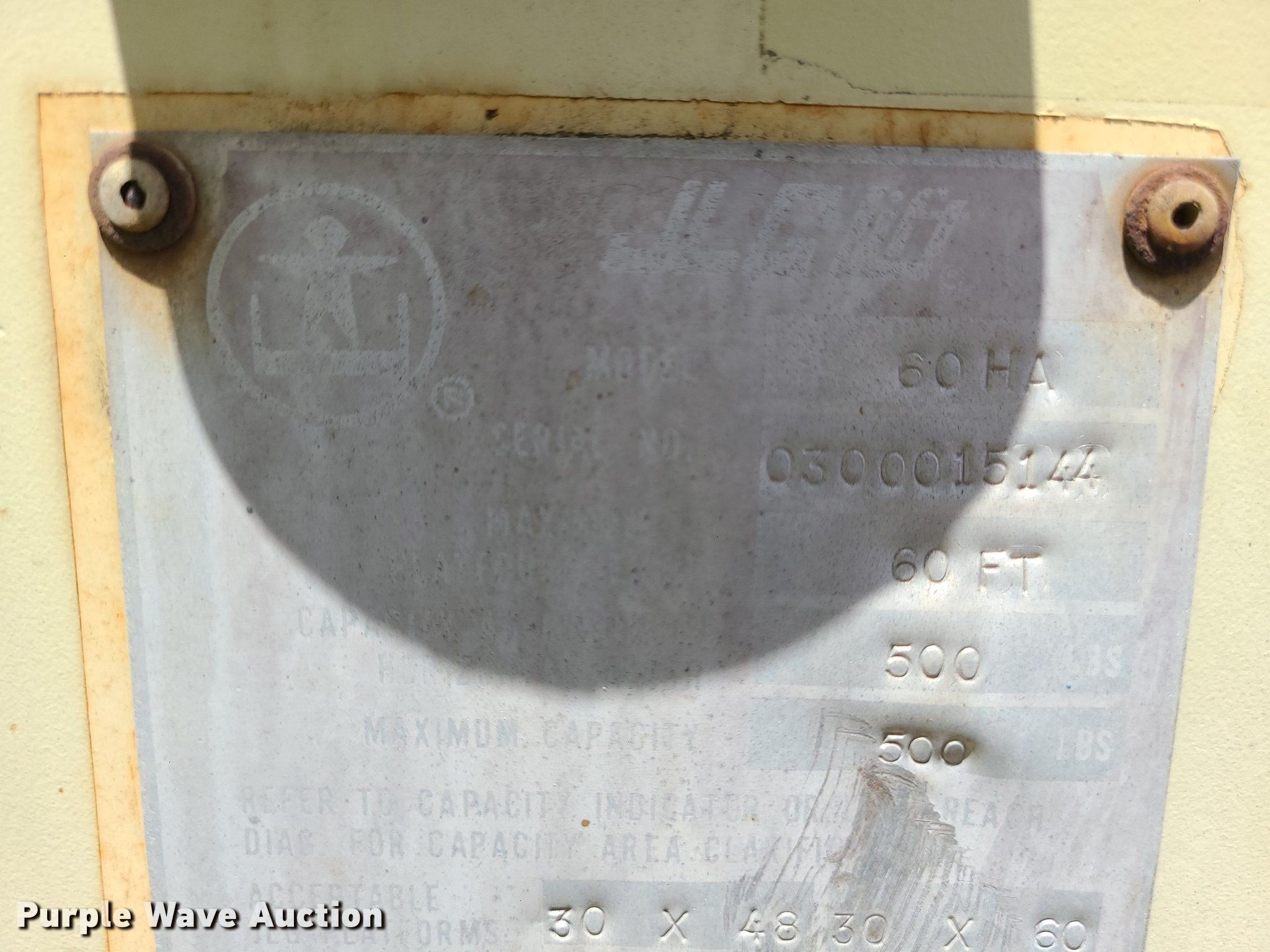 Purple Wave is selling a used Boom Lift in Missouri. This item is a JLG 60HA boom lift with the following: Hours: 3,631 on meter, VIN: 0300015144
