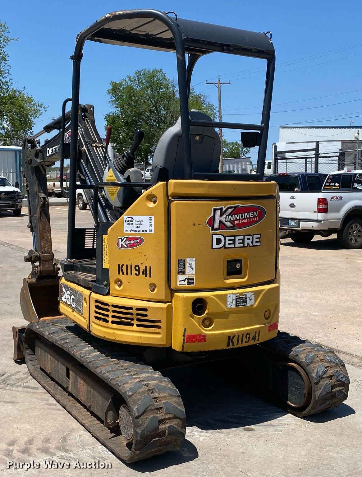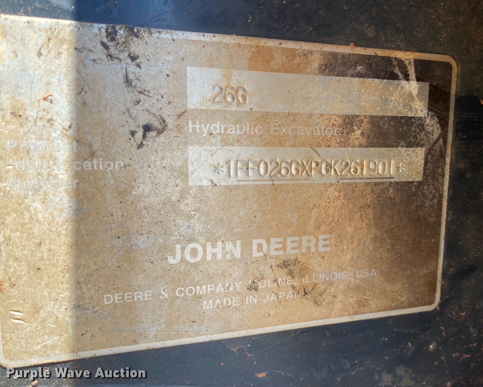 Purple Wave is selling a used Mini Excavator in Oklahoma. This item is a 2017 John Deere 26G mini excavator with the following: Hours: 2,172 on meter, Serial: 11FF026GXPGK261901