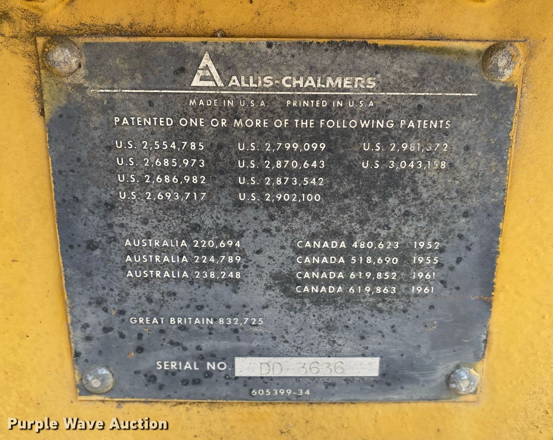 Purple Wave is selling a used Motor Grader in Oklahoma. This item is a 1966 Allis-Chalmers DD rigid frame motor grader with the following: Hours: 104 on meter, Serial: DD3636