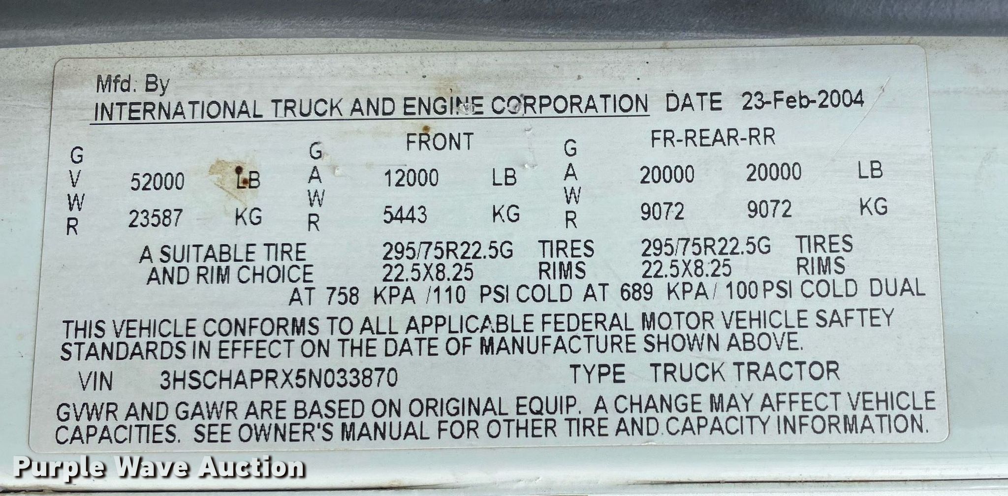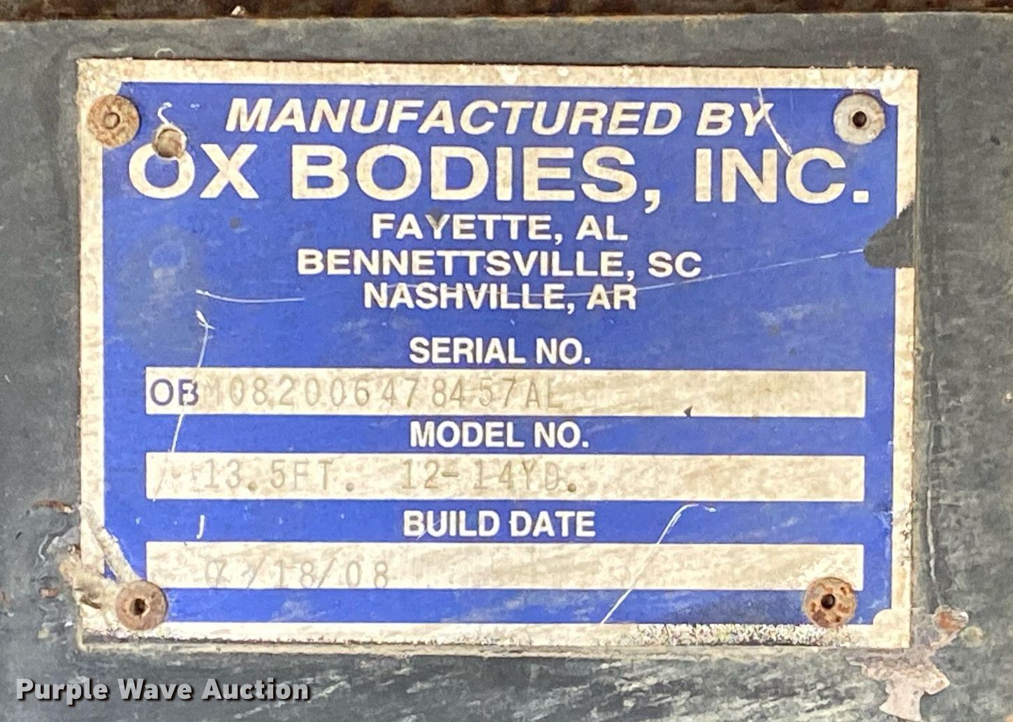 2005 International 9900i dump truck. Miles: 586,556 on odometer, Hours: 18,790 on meter, VIN: 3HSCHAPRX5N033870. Engine Cummins ISX, Serial: 79035546, Displacement: 14.9L, Cylinders: 6, Fuel type: Diesel, Engine brake. Transmission Eaton Fuller, Manual, Speed: 10. Chassis Axles: Tandem, Differential lock: Inter-axle, Suspension: Air, Brakes: Air, PTO, GVWR: 52,000 lbs FAWR: 12,000 lbs, IAWR: 20,000 lbs, RAWR: 20,000 lbs, Wheelbase: 200". Interior AC, Heat, Heated mirrors, Cruise control, Brake controller. Features Dump bed Ox Bodies 13.5 FT 12-14YD, 13' 6" L x 96" W, Side height: 45", Side board height: 8", Bed type: Steel, Roll tarp, Ram: Single , End gate: Air operated. Tires Size: 11R24.5. Notes Fuel leak. Oklahoma title. Title distribution may be delayed up to 14 days from verification of funds. Merriman Trucking. Cleveland, OK 74020