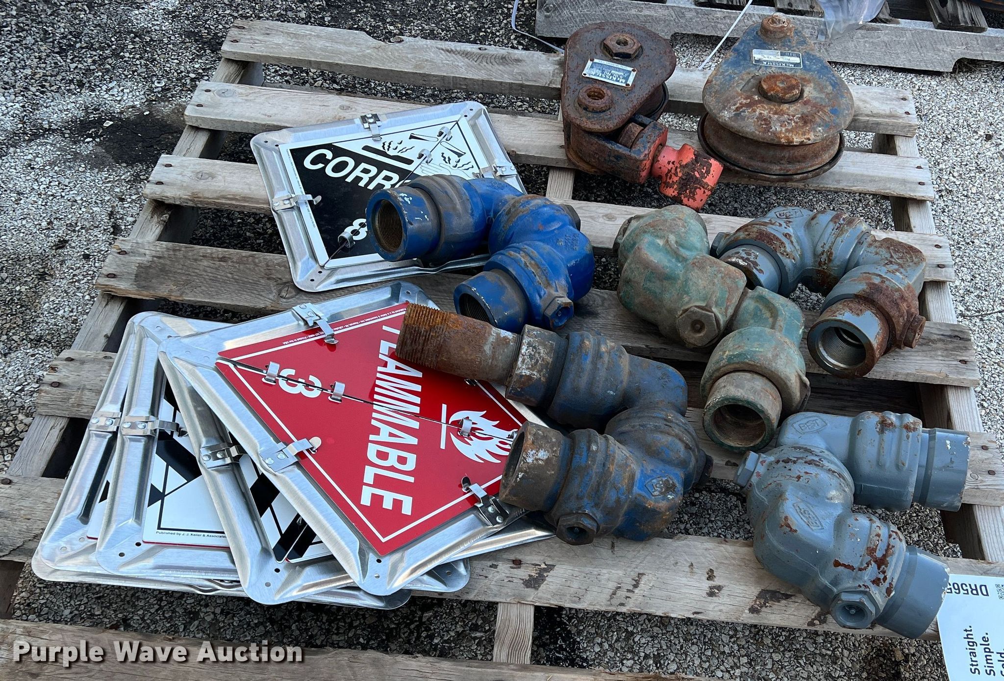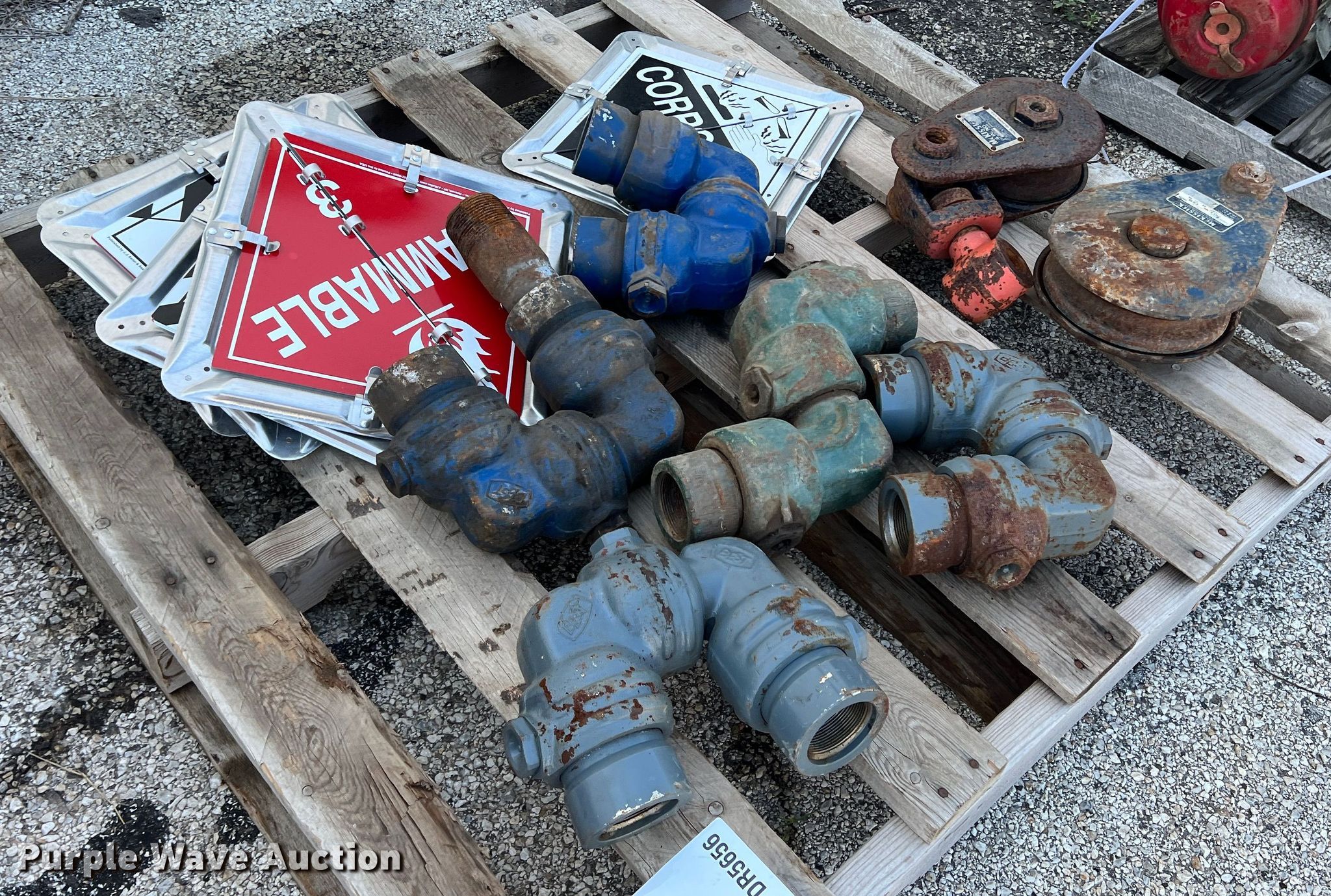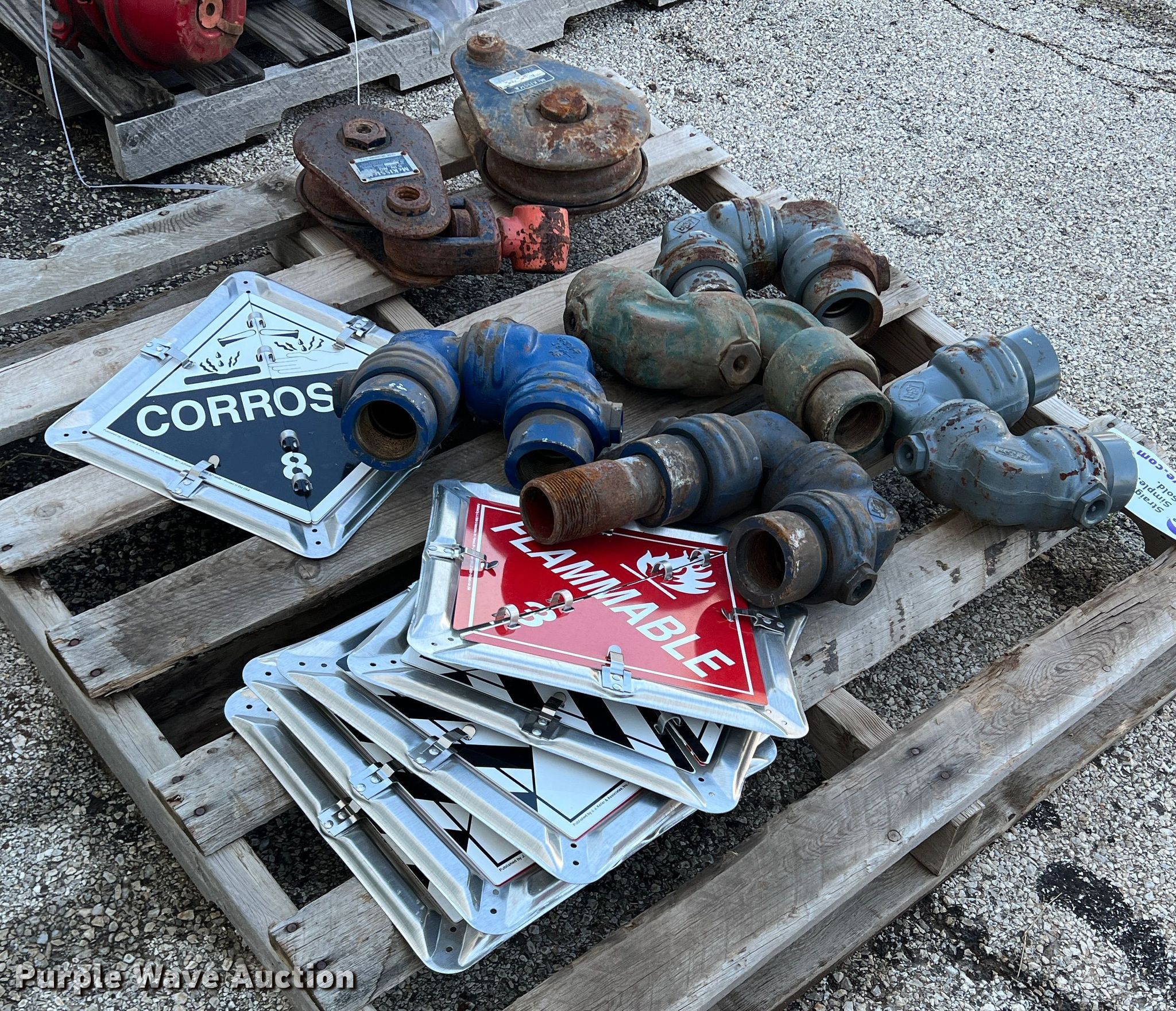 Purple Wave is selling a used Tools in Texas. This item is a Tools with the following: (5) swivel joints, (2) snatch blocks, 6" 12 ton capacity, 8" 15 ton capacity, (6) hazardous material placards