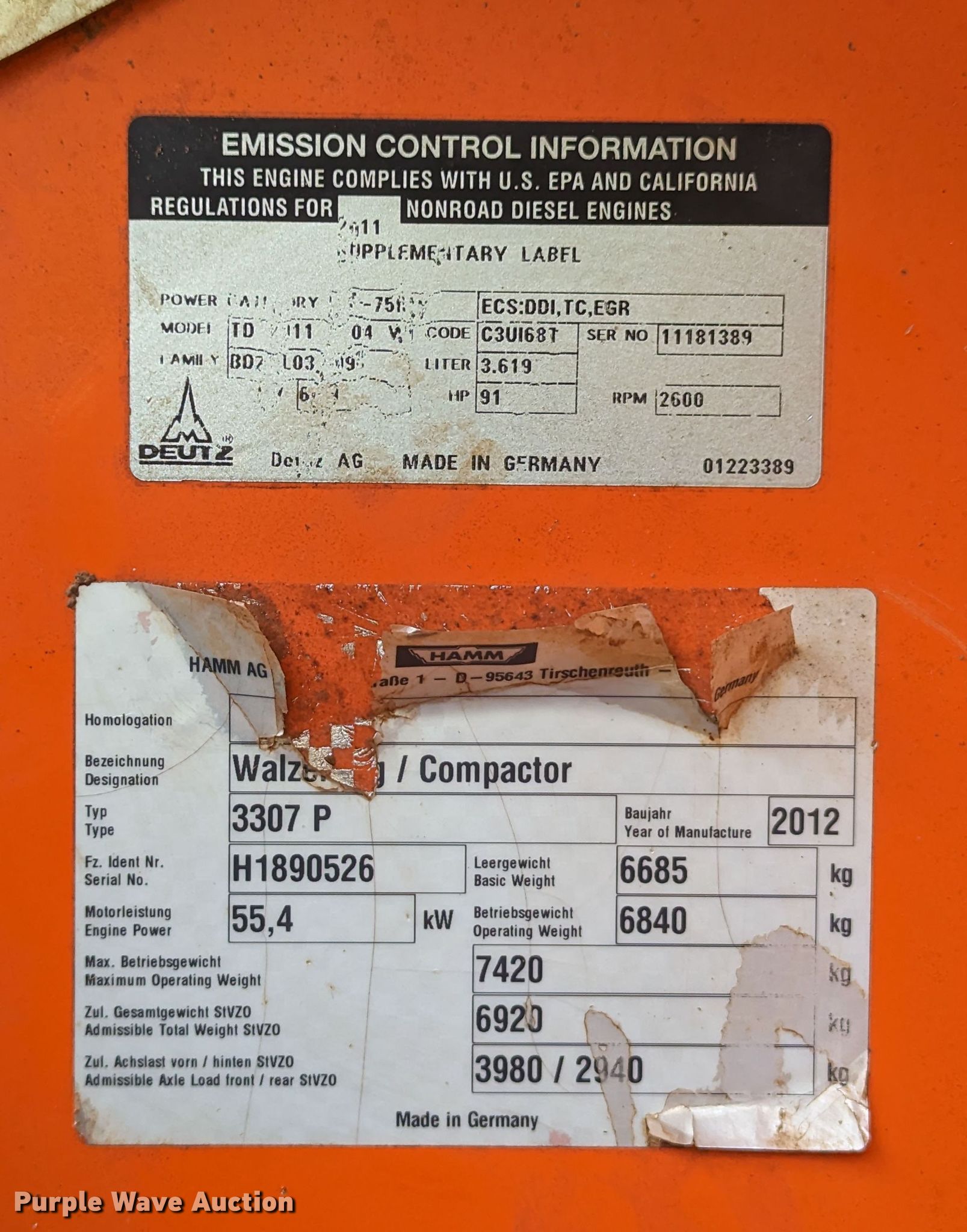 2012 Hamm 3307P single drum vibratory roller. Hours: 805 on meter, Serial: H1890526. Engine Deutz TD2011L04W, Serial: 11181389, Displacement: 3.619L, Cylinders: 4, Fuel type: Diesel, HP: 91. Transmission Hydrostatic. Operators station OROPS, Vandal cover. Features Drum: Padfoot, Vibratory system: Single, Front drum Width: 66", Diameter: 48", Drum scrapers: Front. Tires Size: 14.9-24. Miller Grading, LLC. 9900 West Wilshire Boulevard. Yukon, OK 73099