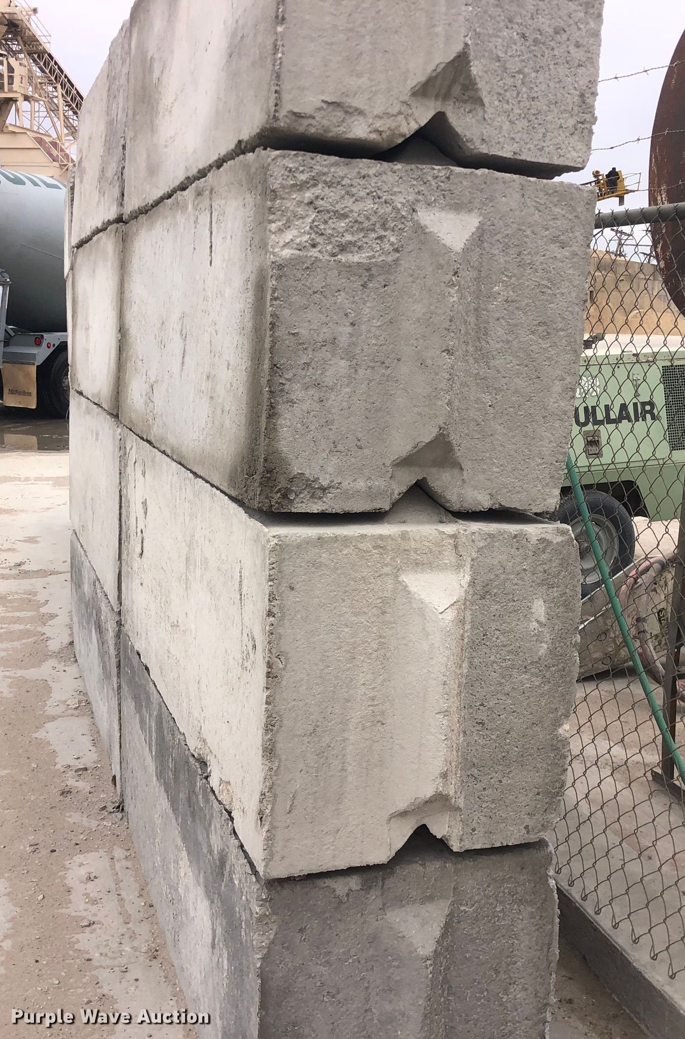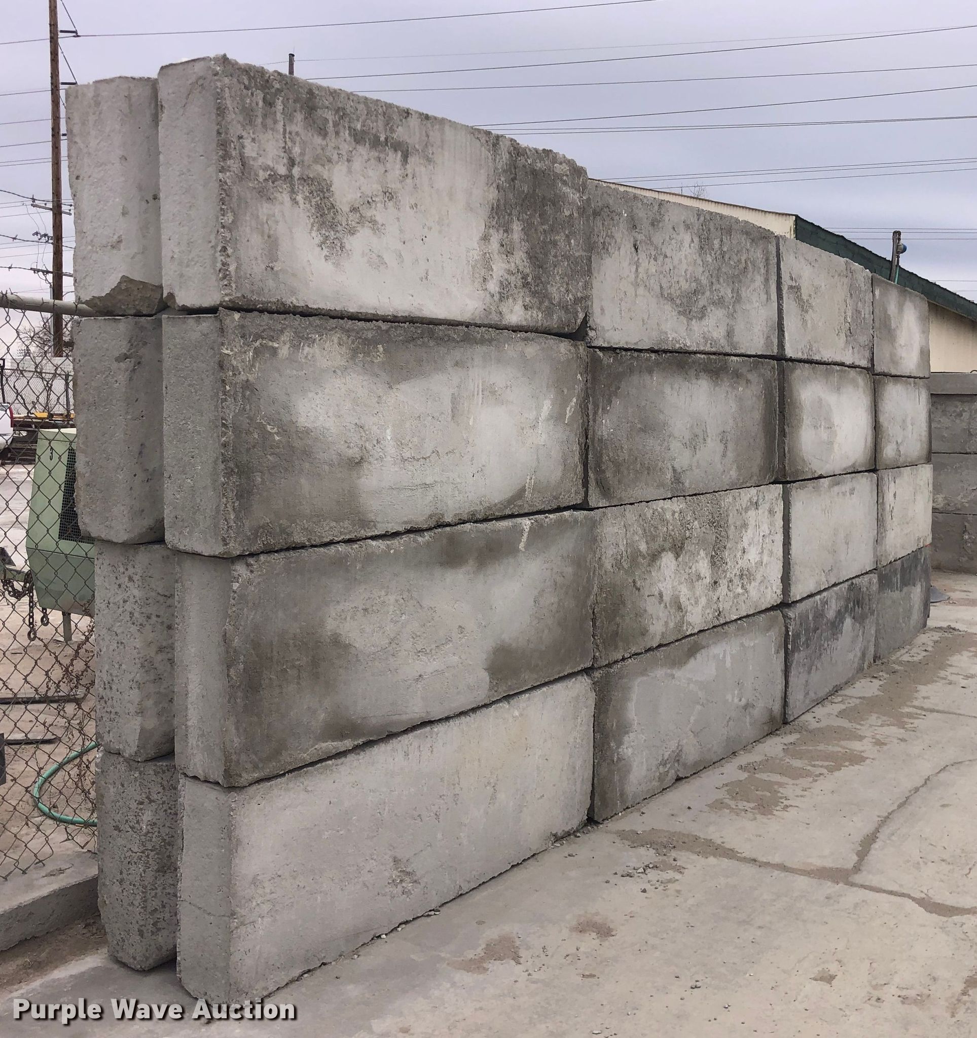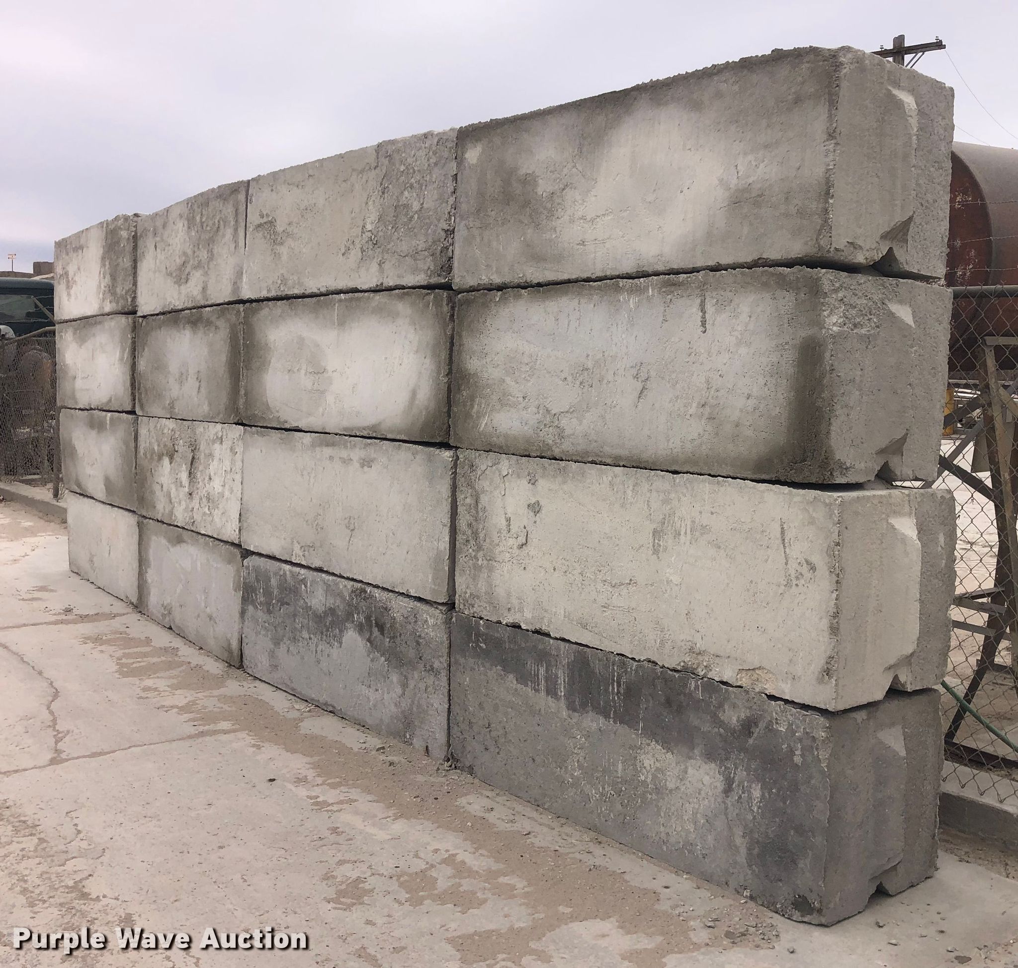 Purple Wave is selling a used Building Materials in Kansas. This item is a (16) concrete edge bunker blocks with the following: 2' x 2' x 6', Rebar lift eyelet, Keyed, Finish and condition may vary, Color: Grey, Approx 3,200 lbs per block