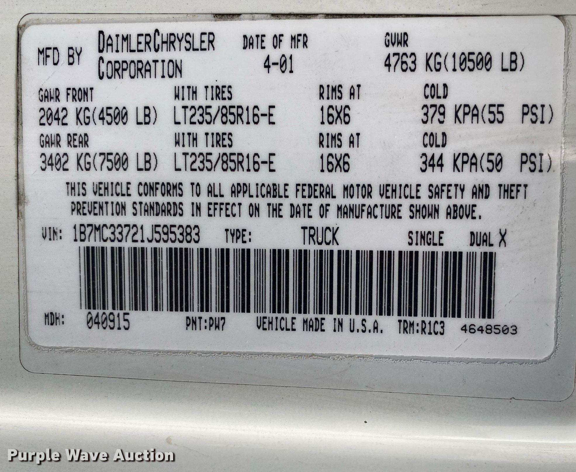 - VIN: 1B7MC33721J595383