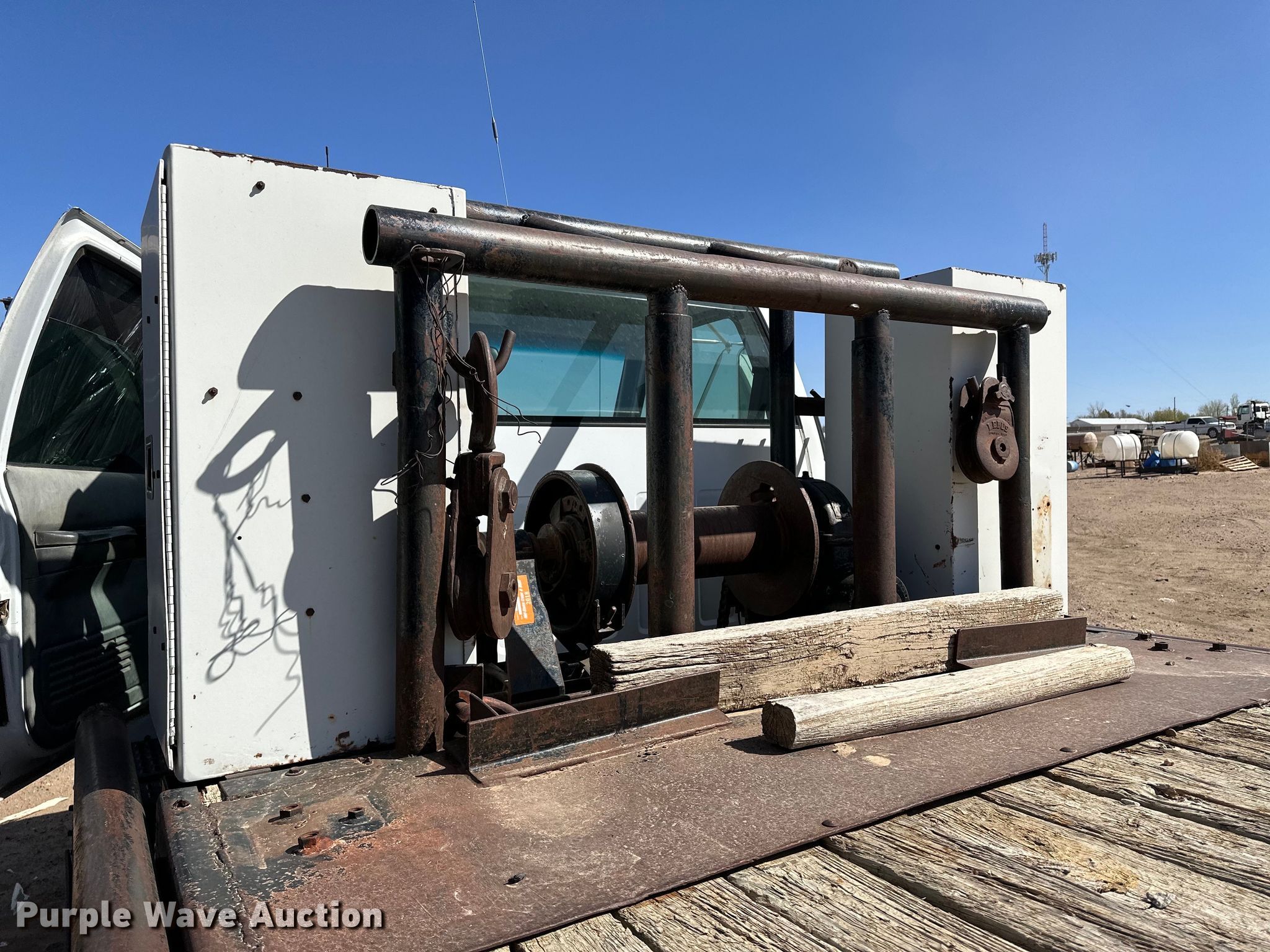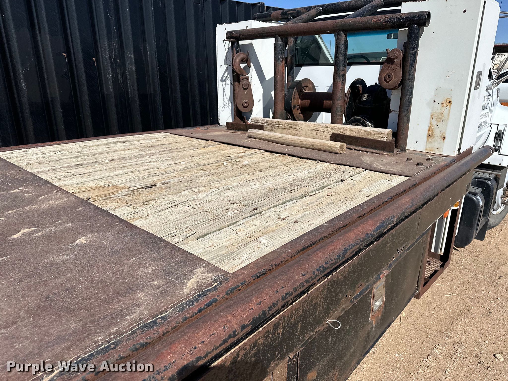 2002 GMC C7500 winch truck. Miles: 65,060 on odometer, VIN: 1GBM7H1E72J502060. Engine Displacement: 8.1L, Cylinders: 8, Fuel type: Gas. Transmission Manual, Speed: 5, plus 2. Chassis Axles: Single, Suspension: Spring, Brakes: Air, PTO. Interior AC, Heat. Features Flatbed 11' 6" L x 96" W, Winch, Rolling tailboard, Gin pole length: 12' 9". Tires Front: 11R22.5. Notes Non-operational rear differential, Non-operational unit. Kansas title. Title distribution may be delayed up to 14 days from verification of funds. Scout Energy Partners. Ulysses, KS 67880