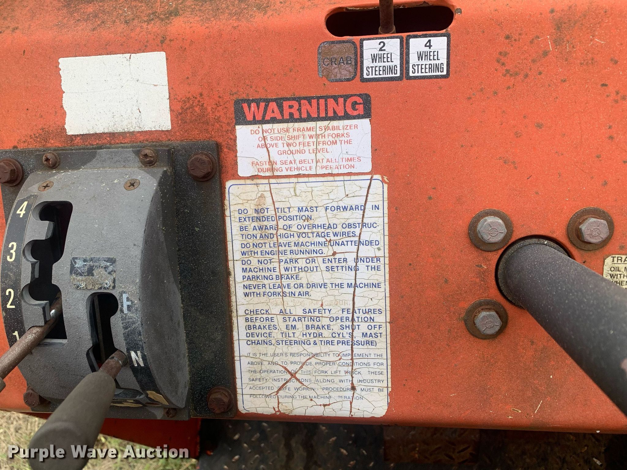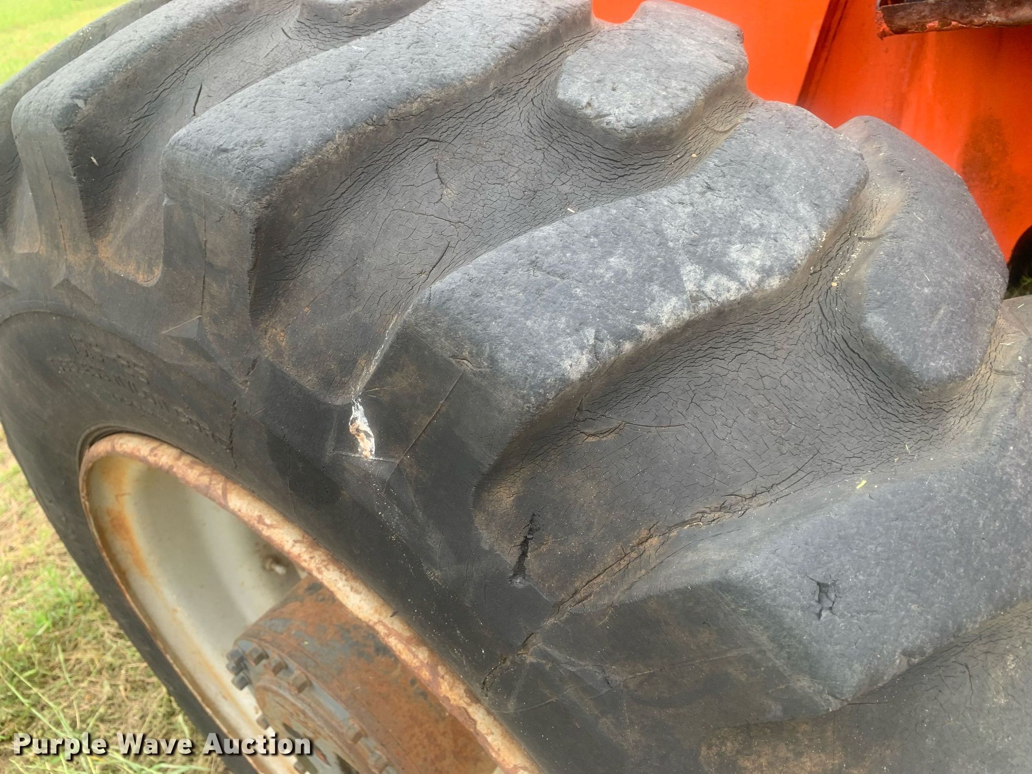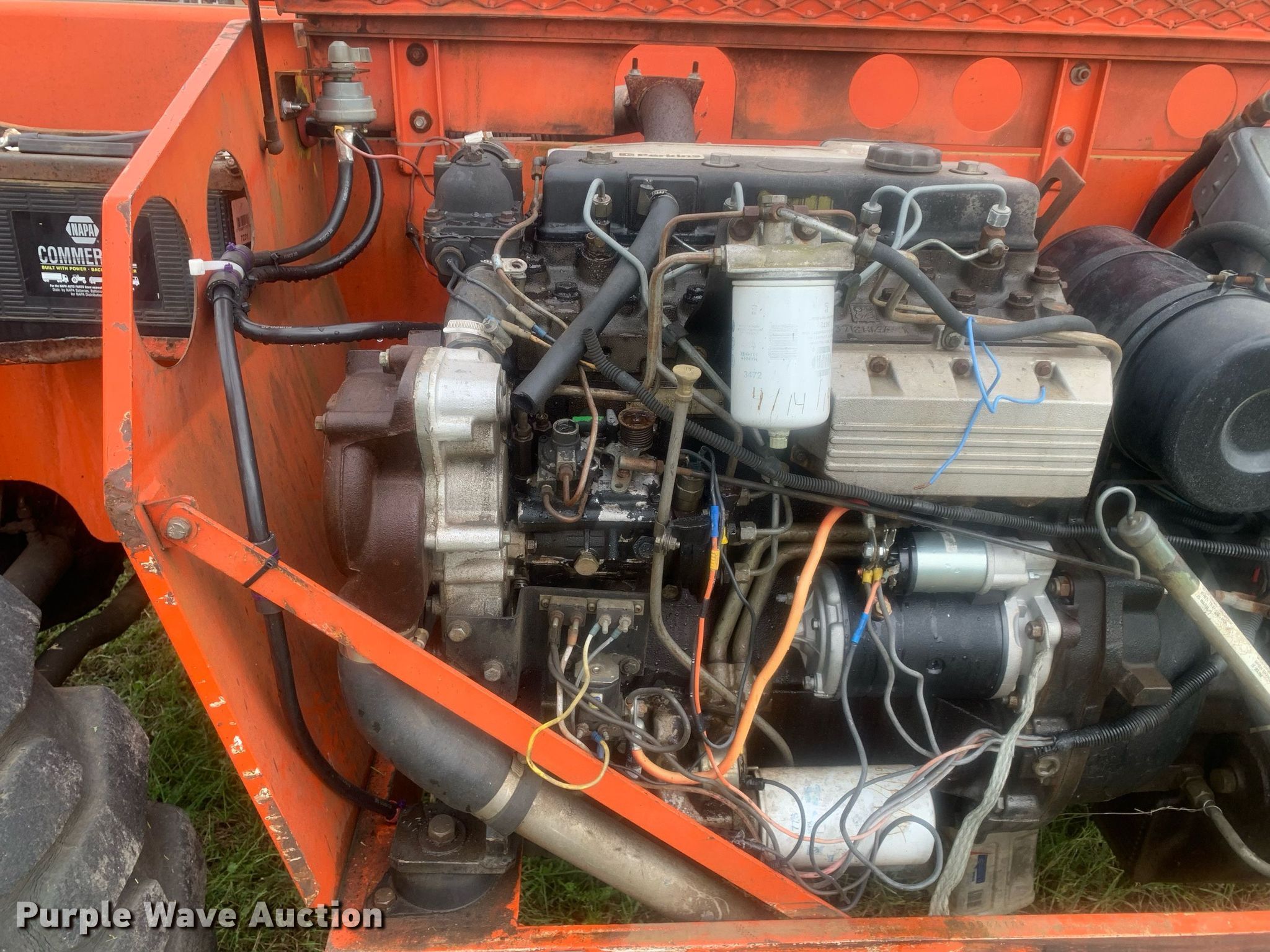 Tovel TL6-44-42 telehandler. Hours: 3,778 on meter, Serial: 6994418. Engine Perkins, Cylinders: 4, Fuel type: Diesel. Transmission Powershift, 4F - 4R, Four wheel drive. Operators station Canopy, Steering: Crab, Four wheel. Features Maximum lift capacity: 6,000 lbs, Maximum lift height: 40', Boom stages: 3, Fork length: 48", Hydraulic leveling. Tires Size: 15.5-25. Notes Possible electrical issue, Non-operational unit. Consolidated Wood Products. 1940 Co Rd 3703. Bullard, TX 75757
