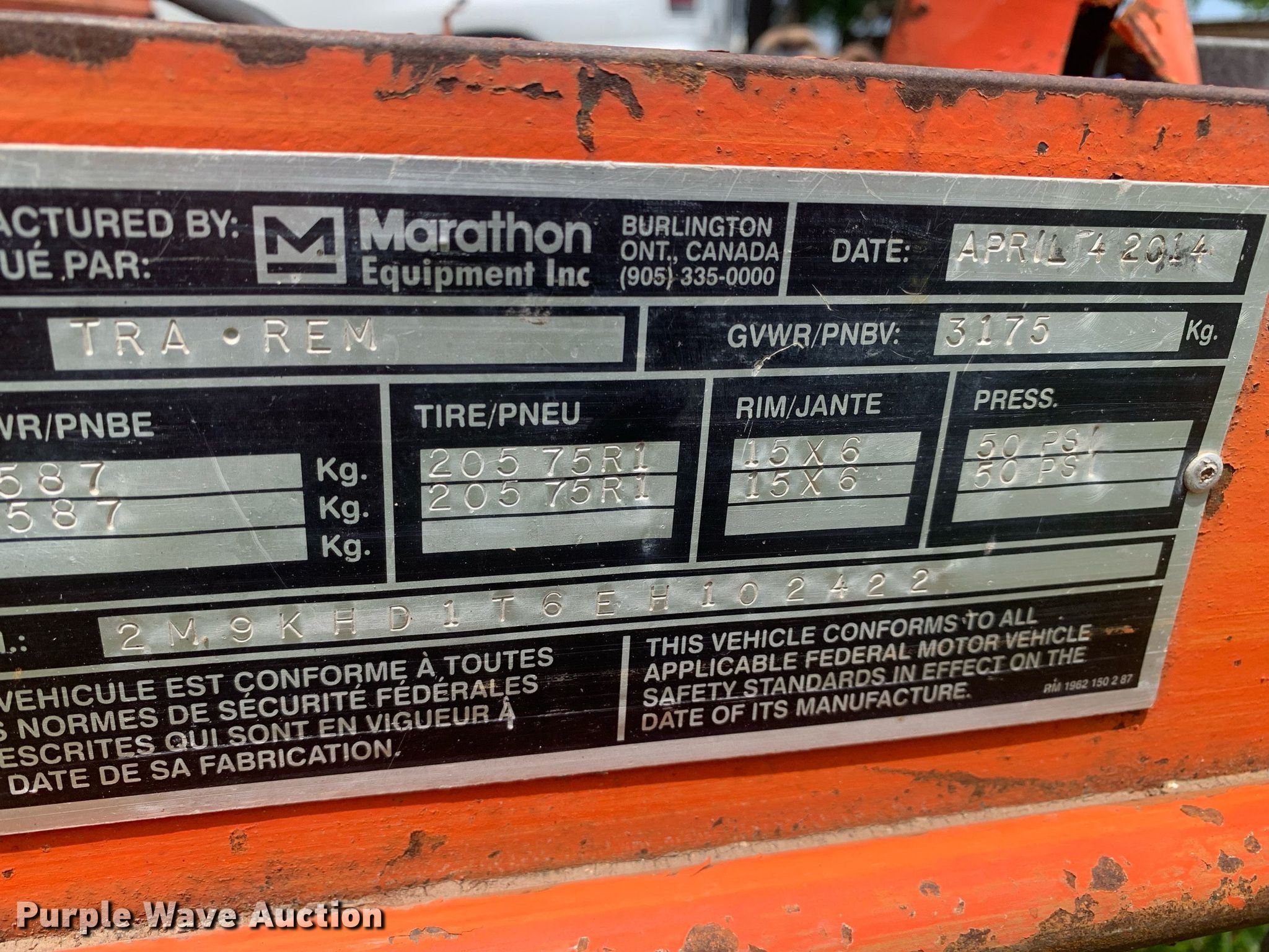 2014 Marathon TRA- REM melter applicator. Hours: 3,176 on meter, VIN: 2M9KHD1T6EH102422. Dimensions Overall: 6'6" W x 13'4" L. Engine Kohler, Cylinders: 3, Fuel type: Diesel. Chassis Brakes: Electric, Suspension: Spring. Tires Size: 235/80R16. Notes No battery , Non-operational unit. This is worksite support equipment and will not come with a title. Transfer of ownership documentation will be a bill of sale. 1800 Alsdorf Road. Ennis, TX 75119