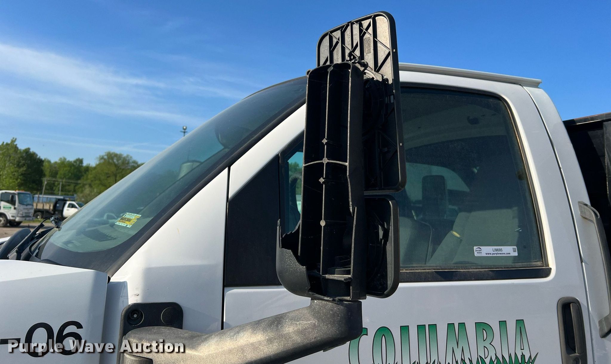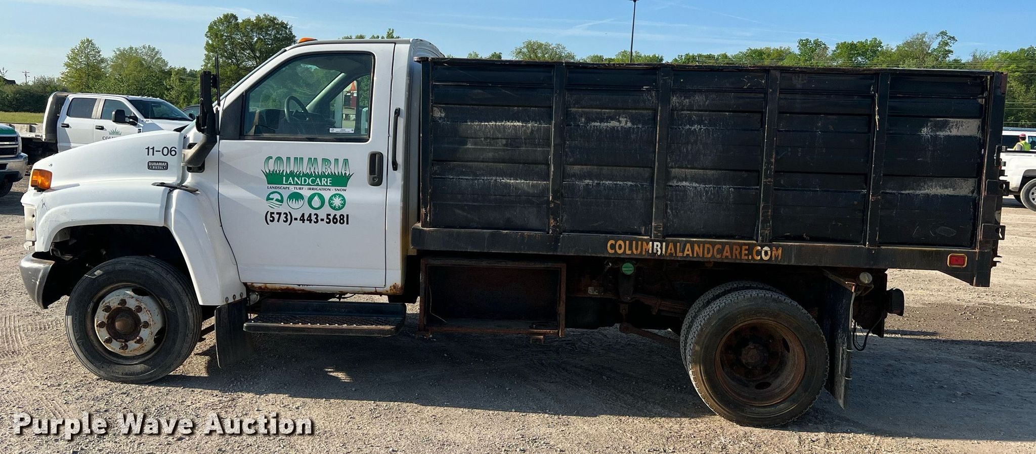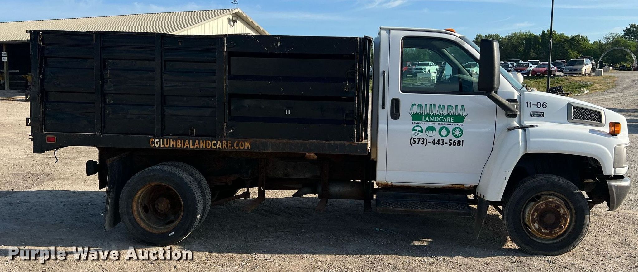 2006 GMC C4500 dump flatbed truck. Miles: 116,255 on odometer, VIN: 1GDE4C1216F408827, Unit #: 11-06. Engine Displacement: 6.6L, Cylinders: 8, Fuel type: Diesel. Transmission Automatic. Chassis Axles: Single, Suspension: Spring, Brakes: Hydraulic, PTO, GVWR: 17,500 lbs. Interior AC, Heat, Cruise control. Features Dump flatbed 11' L x 94.5" W, Side height: 40", Removable sides, Ram: Single. Tires Size: 225/70R19.5. Notes Plow controls and wiring harness not included, Unattached end gate included, Dash warning indicator: Check engine, ABS, Brake, Windshield chipped or cracked. Missouri title. Title distribution may be delayed up to 14 days from verification of funds. Columbia Landcare, LLC.. 7105 West Henderson Road. Columbia, MO 65202