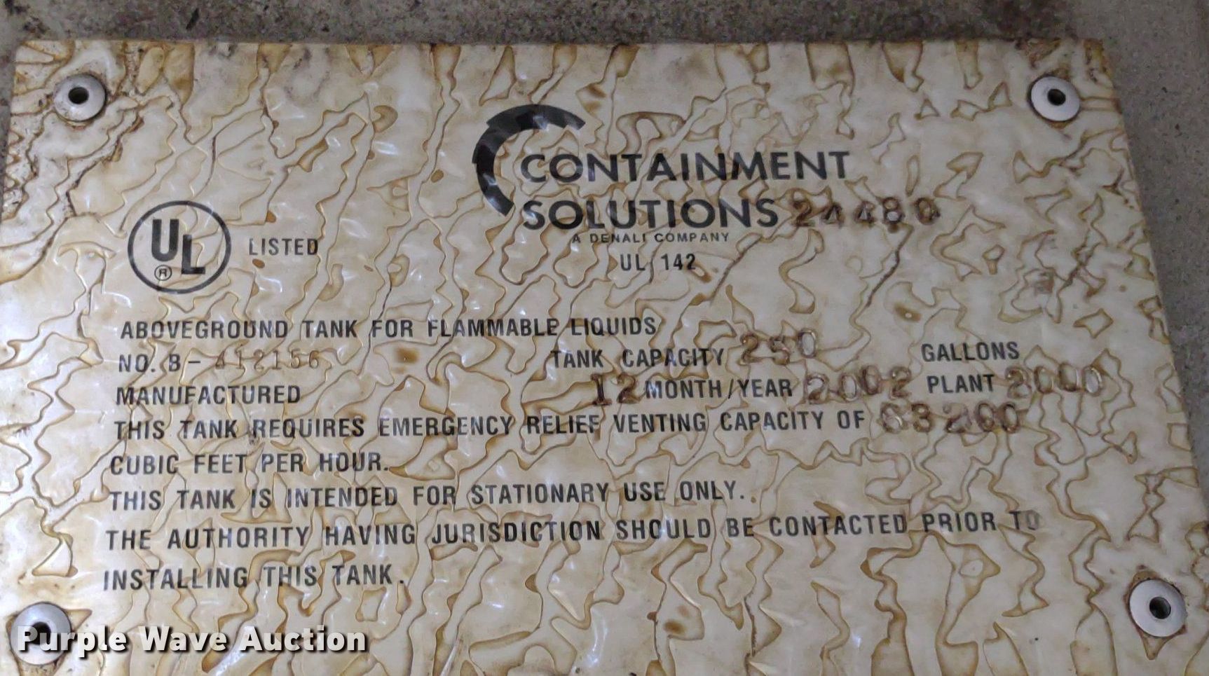 Purple Wave is selling a used Fuel and Lube in Kansas. This item is a Containment Solutions waste oil tank with the following: 250 gallon capacity, Pneumatic pump