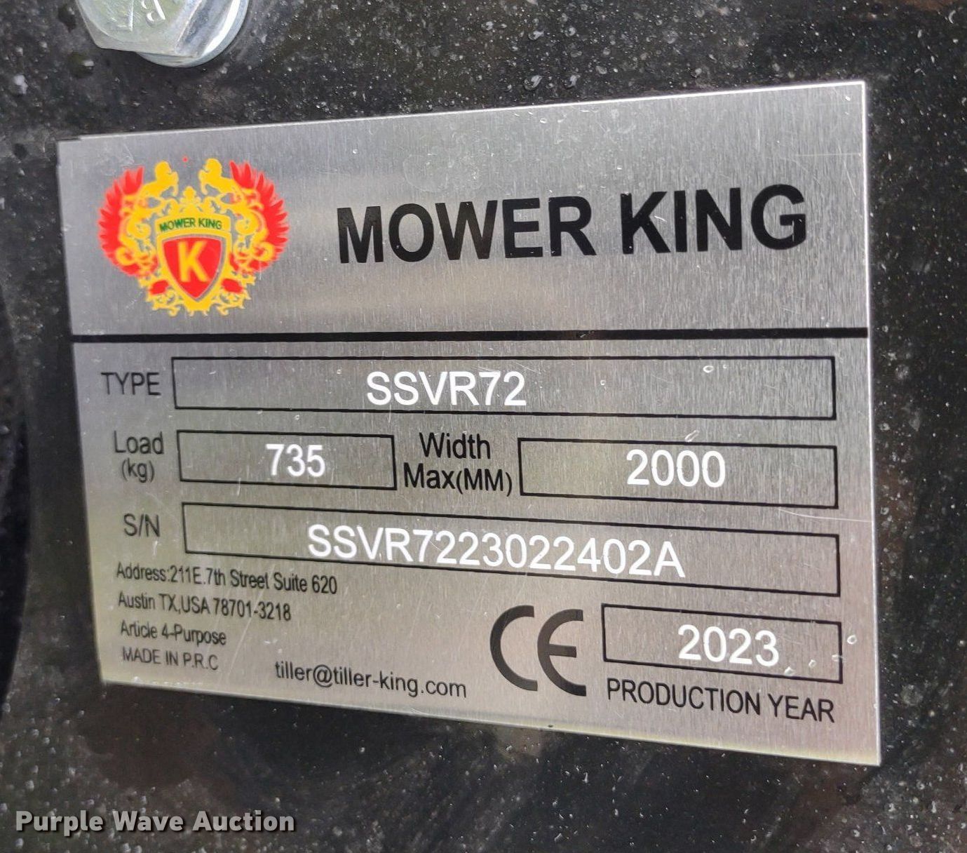 Take a look at this used 2023 Mower King SSVR72 skid steer roller being sold on June 8th, 2023 in the SOLD! June 08 Construction Equipment Auction made by Mower King. Take a look at all of the item information below or take a look at similar auctions for Skid Steer Loaders.