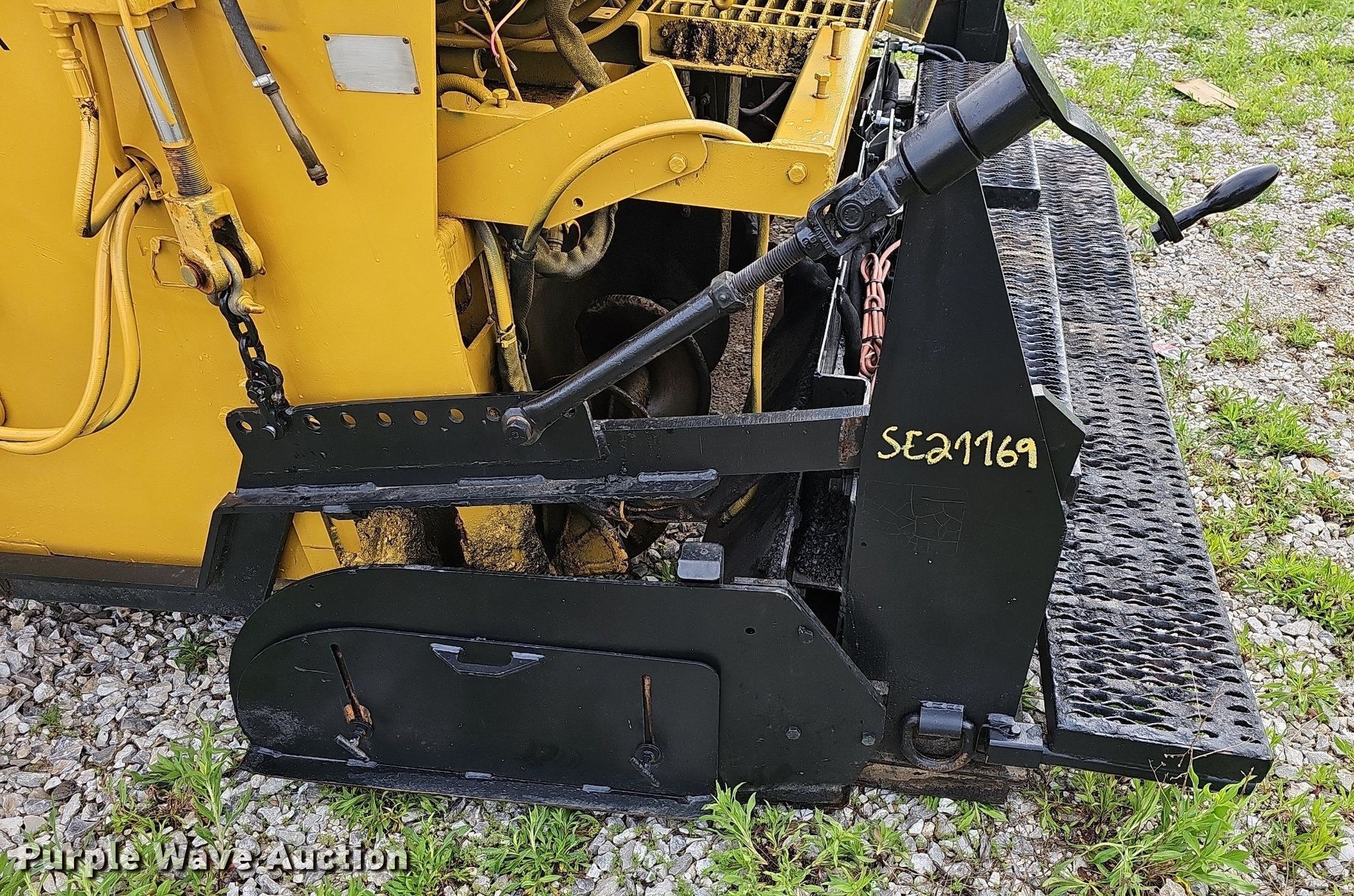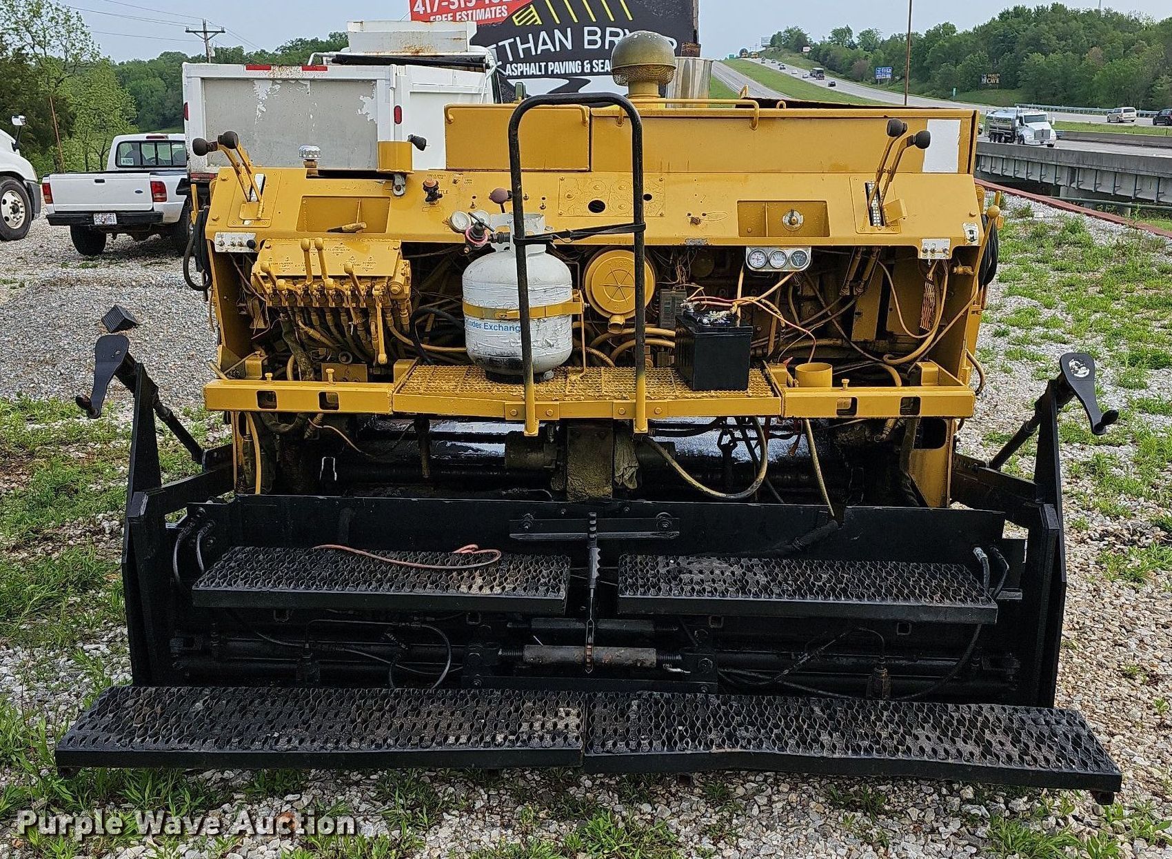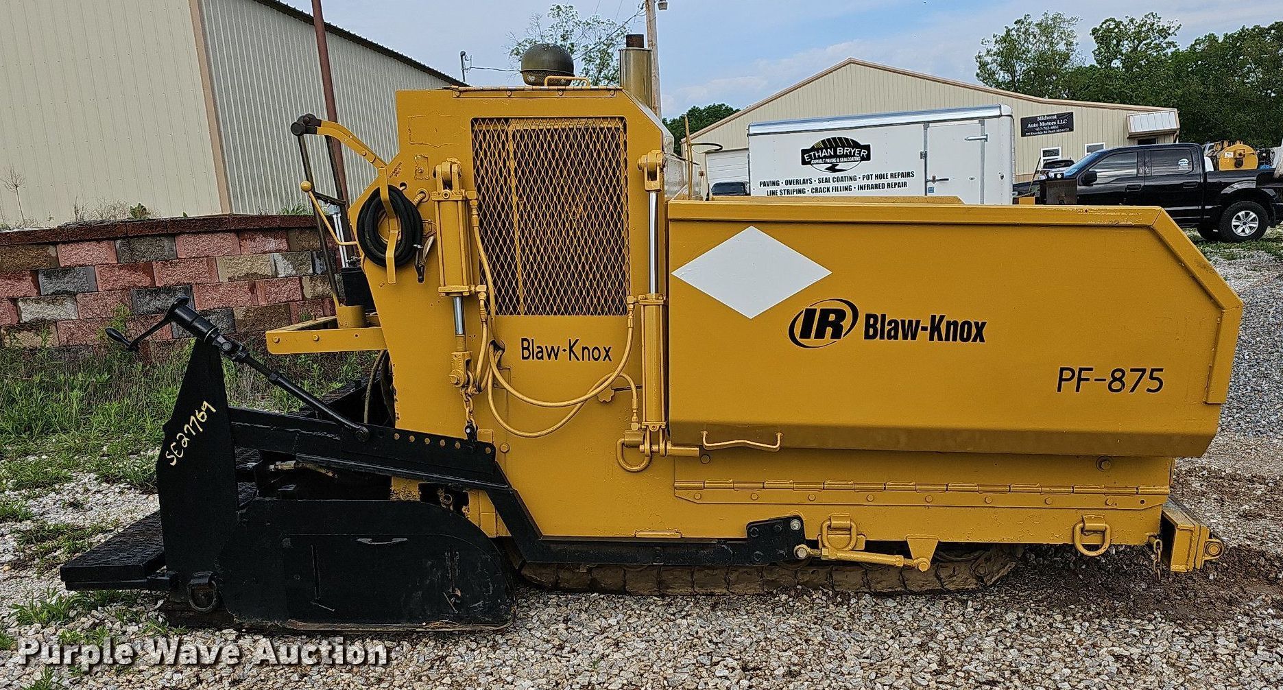 2001 Blaw-Knox PF-875 paver. Serial: PF875-01-051. Engine Cylinders: 4, Fuel type: Diesel. Transmission Hydrostatic. Features Screed Serial: SE21169, Paving width: 8' to 15', Extensions Quantity: 2, Screed heater: Propane, Front spread hopper width: 10', Material conveyor Width: 68", Wash down system, Ground level remote, Grade and slope controls. Tracks Width: 12", Steel, Track pads: Rubber. Ethan Bryer Asphalt Paving and Sealcoating. 266 Riverdale Road. Ozark, MO 65721