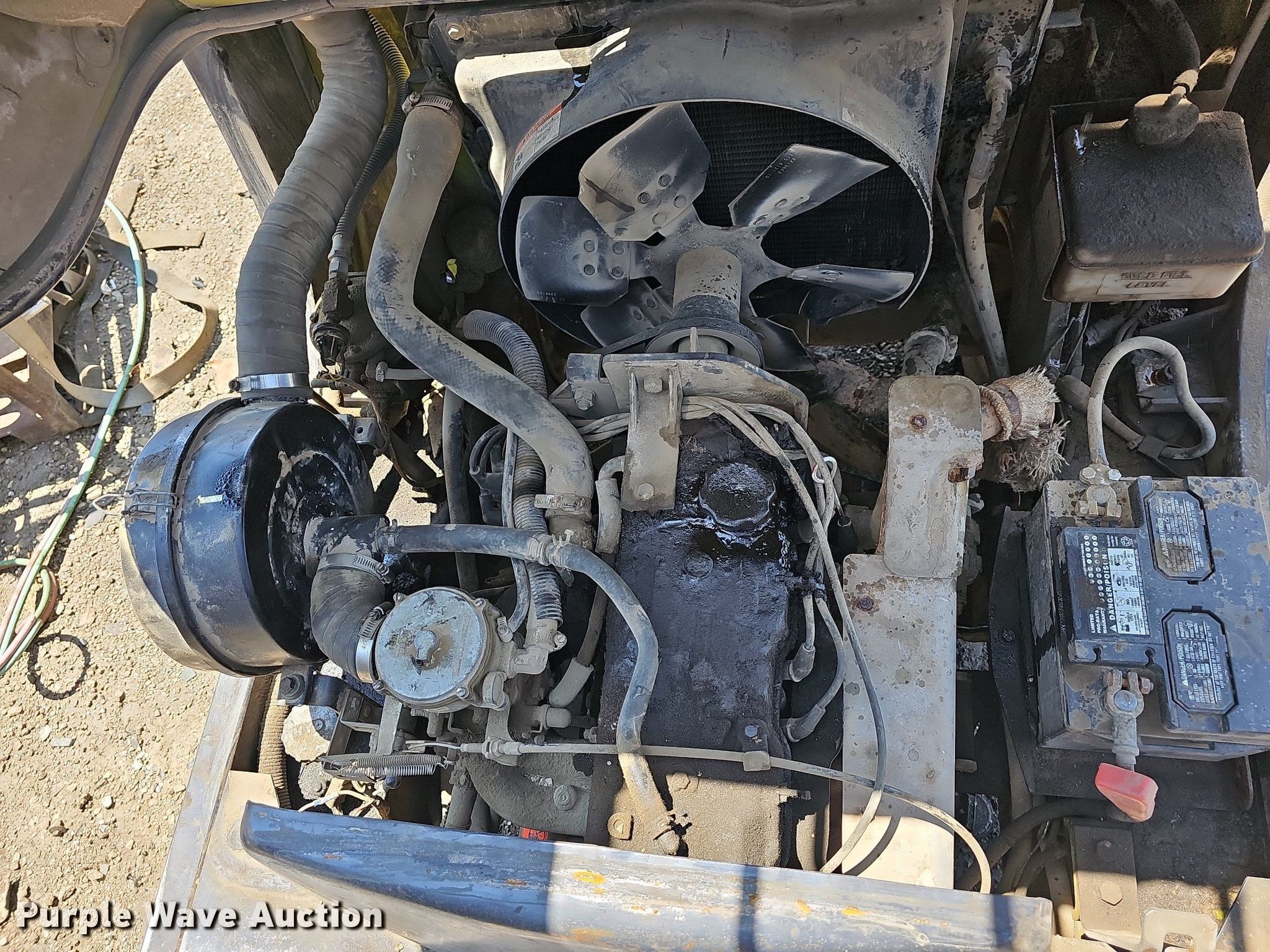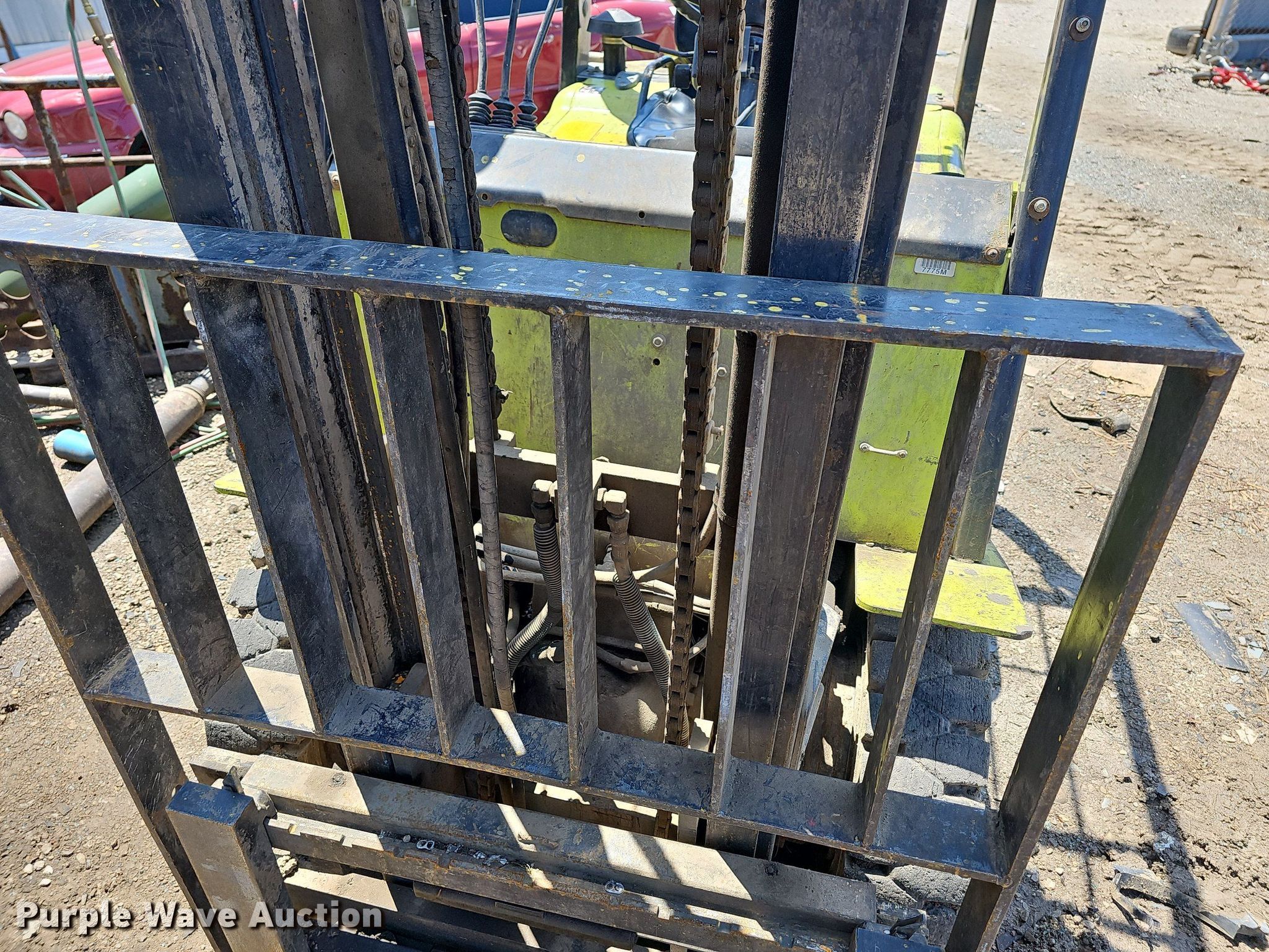 Clark CMP25 forklift. Hours: 8,599 on meter, Serial: CMP230L-0239-6872KF. Engine Cylinders: 4, Fuel type: LPG LP bottle: Not included. Transmission Shuttle shift. Operators station Canopy. Features Maximum lift capacity: 4,850 lbs, Maximum lift height: 24", Mast stages: 2, Side shift, Mast tilt, Fork length: 42". Tires Front: 7.00-12, Rear: 6.50-10, Solid. Lebanon, MO 65536
