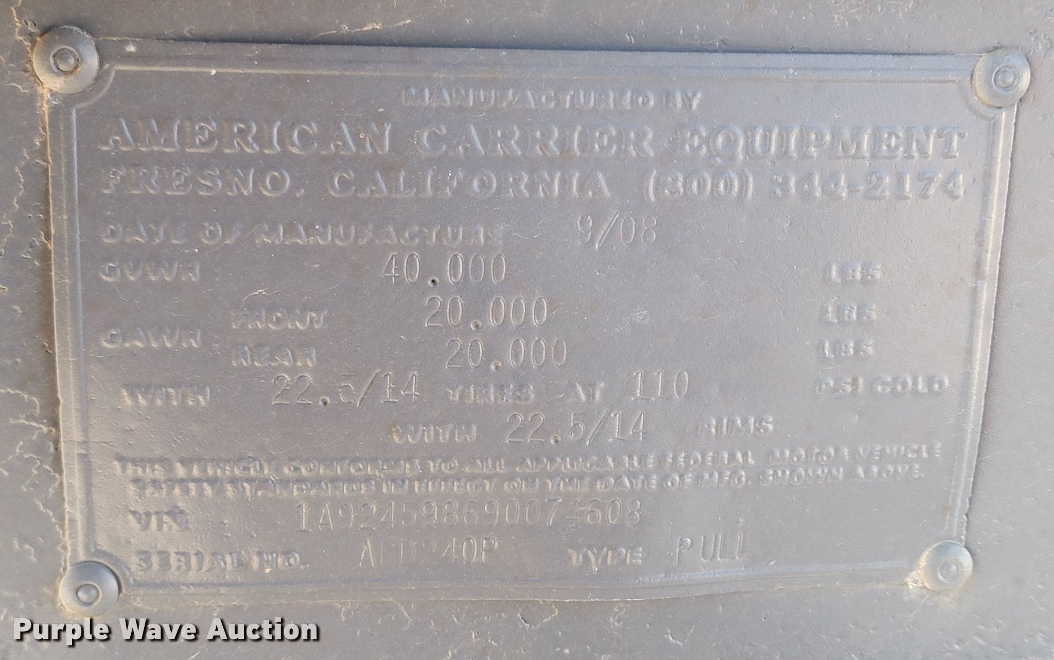 2009 American Carrier Equipment bottom dump trailer. VIN: 1A924598690074608. Dimensions Overall: 37' 6" L x 102" W, Body: 24' L x 102" W. Features Body type: Steel, Ram: Dual, End gate: Air operated, Clamshell gate: Air operated, Trailer controls. Chassis Hitch: Pintle, Suspension: Spring, Brakes: Air, GVWR: 40,000 lbs, GAWR: 20,000 lbs. Tires Steel wheels, Size: 11R22. South Dakota title. Title distribution may be delayed up to 14 days from verification of funds. Kalb Trucking. 1210 West Delaware Street. Sioux Falls, SD 57104