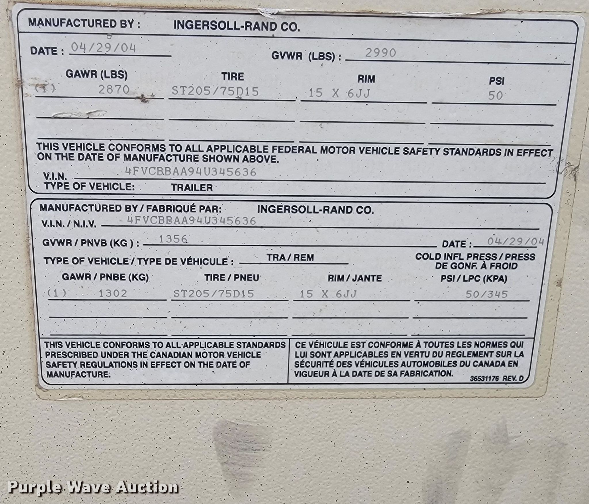 Purple Wave is selling a used Air Compressor in Nebraska. This item is a 2004 Ingersoll Rand 185 air compressor with the following: Hours: 663 on meter, VIN: 4FVCBBAA94U345636