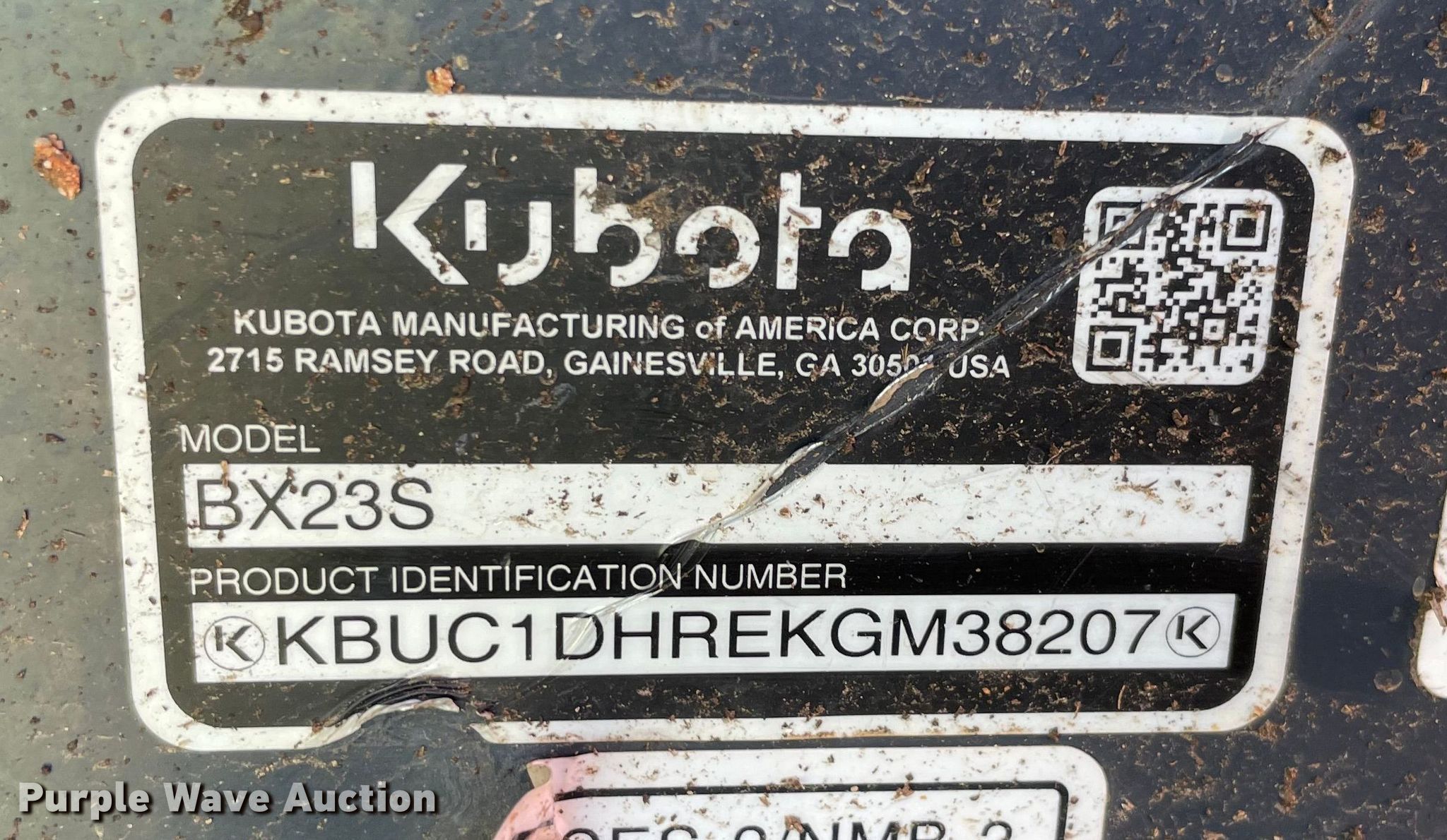 Purple Wave is selling a used Tractor in Oklahoma. This item is a Kubota BX23S MFWD tractor with the following: Hours: 400 on meter, Serial: KBUC1DHREKGM38207