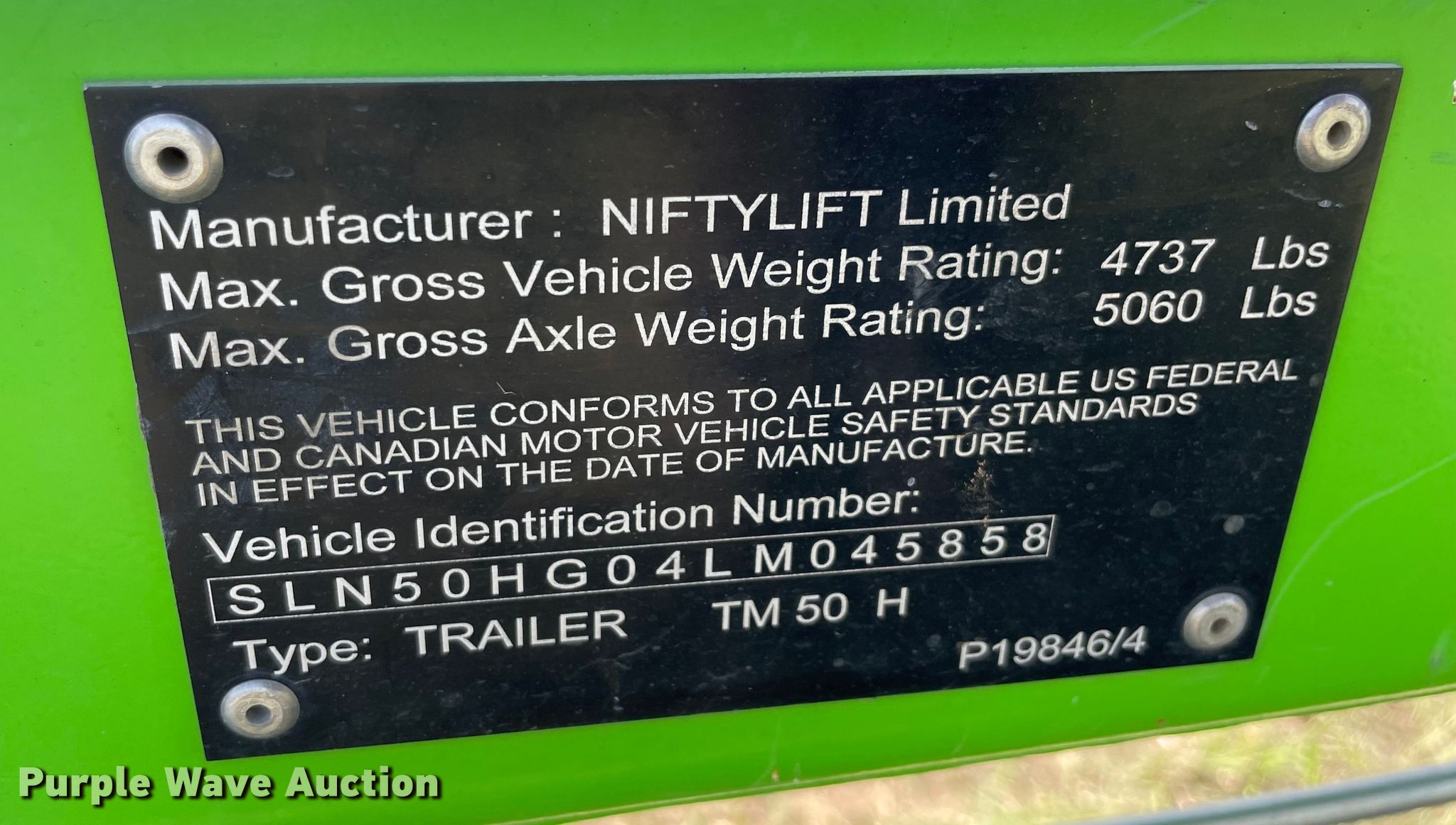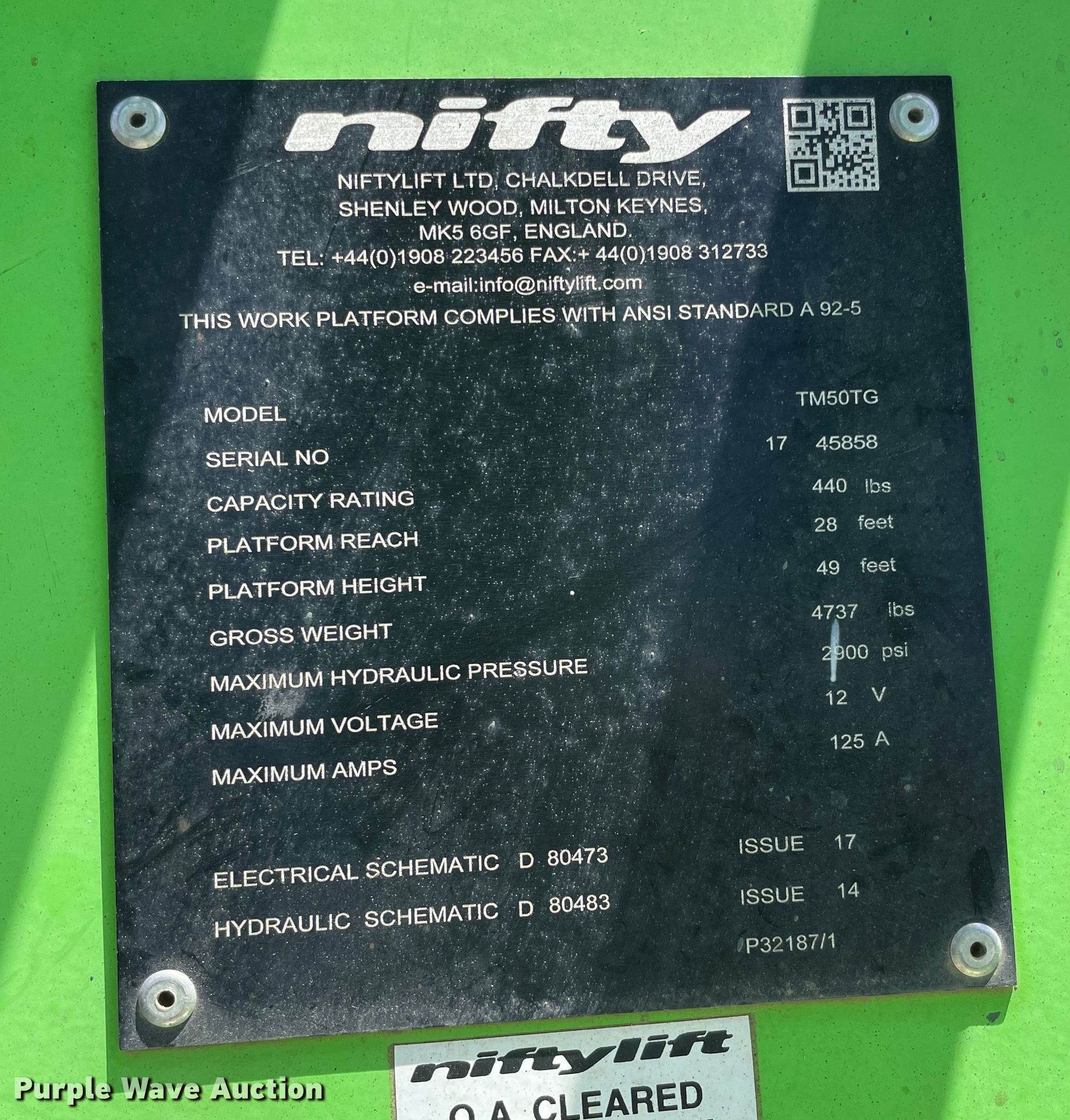 Purple Wave is selling a used Boom Lift in Oklahoma. This item is a Niftylift TM50TG boom lift with the following: VIN: SLN50HG04LM045858, Serial: 1745858