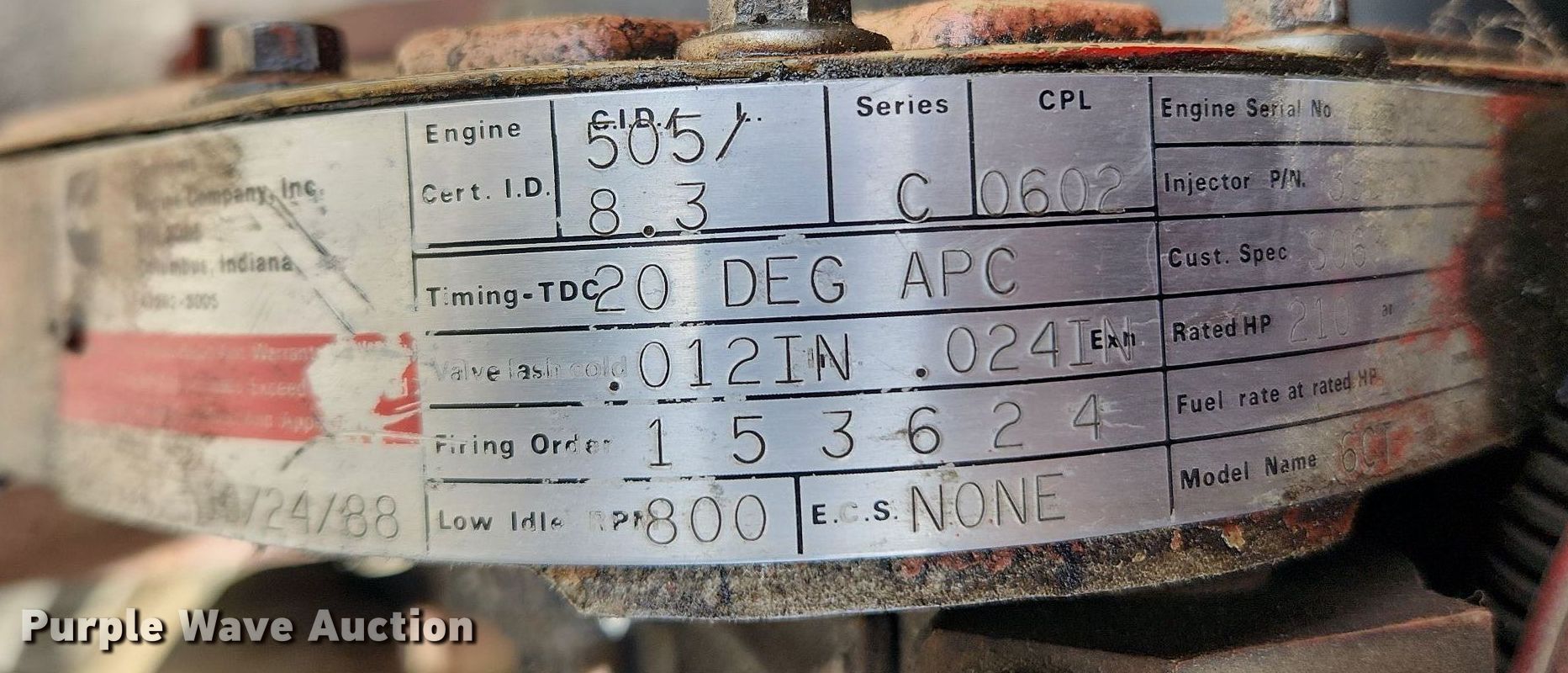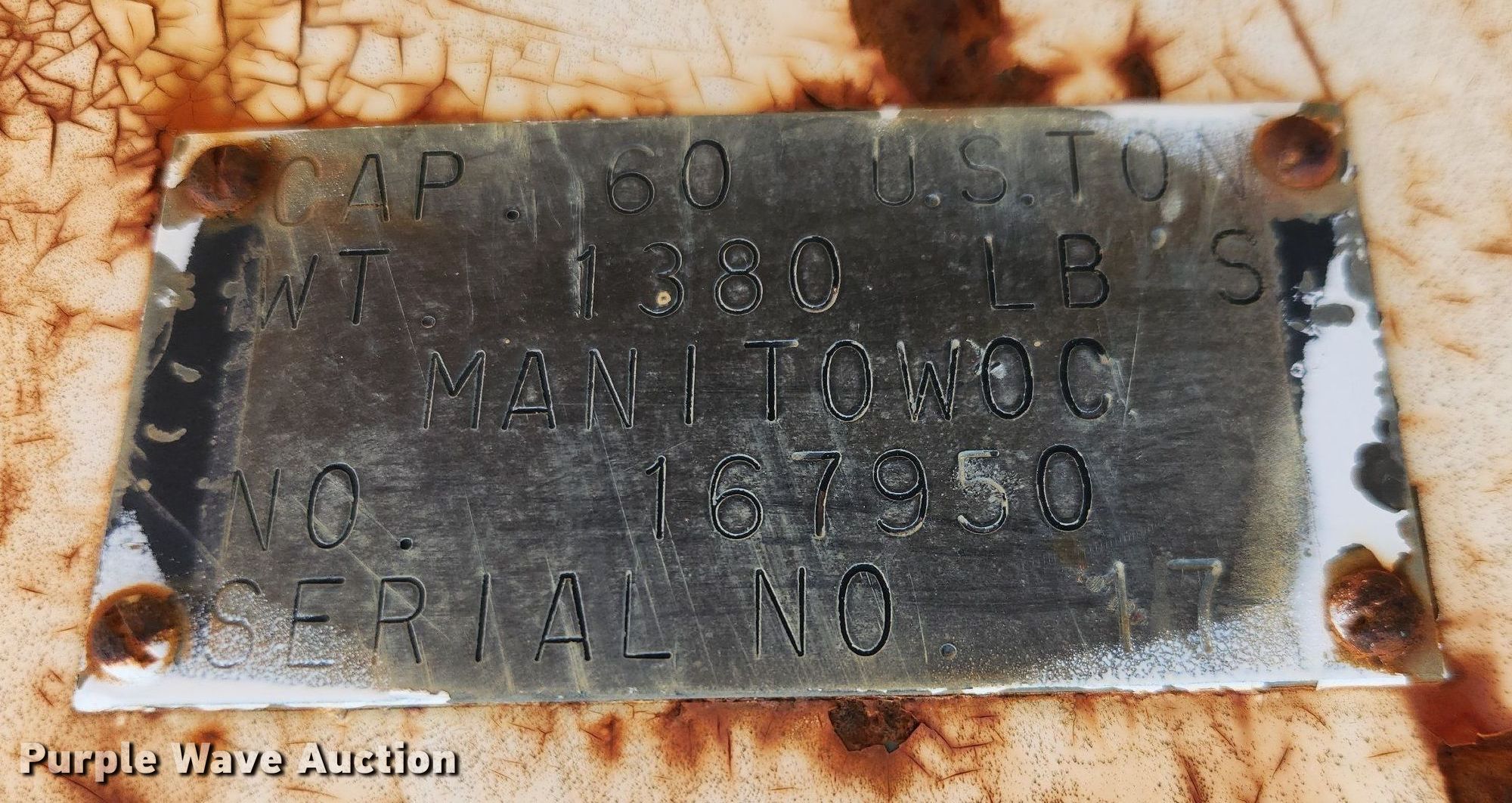 1992 Manitowoc M50W crane. Hours: 3,234 on meter, Serial: 510003. Engine Cummins , Displacement: 8.3L, Cylinders: 6, Fuel type: Diesel. Transmission Direct-drive. Chassis Propulsion: Hydraulic/ hydrostatic, Controls: Hydraulic actuated. Operators station Enclosed cab, Heat, Crane controls: Joysticks, Upper interior Load monitor LSI.. Features Lattice, Maximum lift capacity: 110,000 lbs, Maximum lift height: 180', Jib: 30', Boom controls In-cab, Winches: 4, Removable counter weight, Crane block Sheaves: 4, Capacity: 120,000 lbs, Crane ball & hook, Manuals, Lift chart. Tracks Width: 30", Extendable tracks. Notes Additional 30' boom section, Additional upper boom point, Hour meter replaced at approx. 14,000 hours, Glass cracked. IUOE Local 513 Training Center. Silex, MO 63377