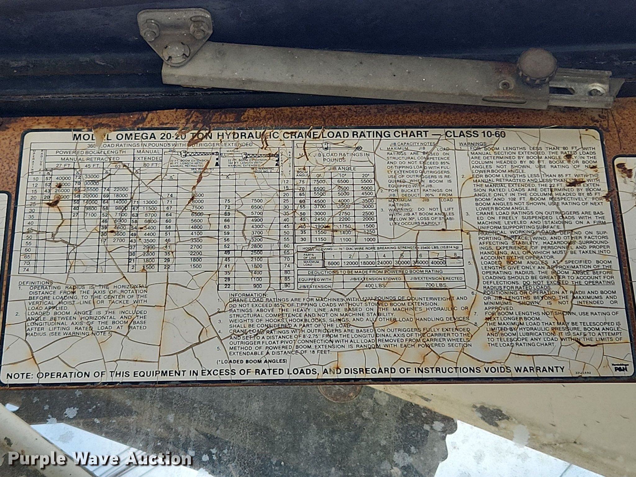 Purple Wave is selling a used Rough or All Terrain Crane in Missouri. This item is a 1980 P&H Omega 20-20 crane with the following: Hours: 9,979 on meter, Serial: 49417