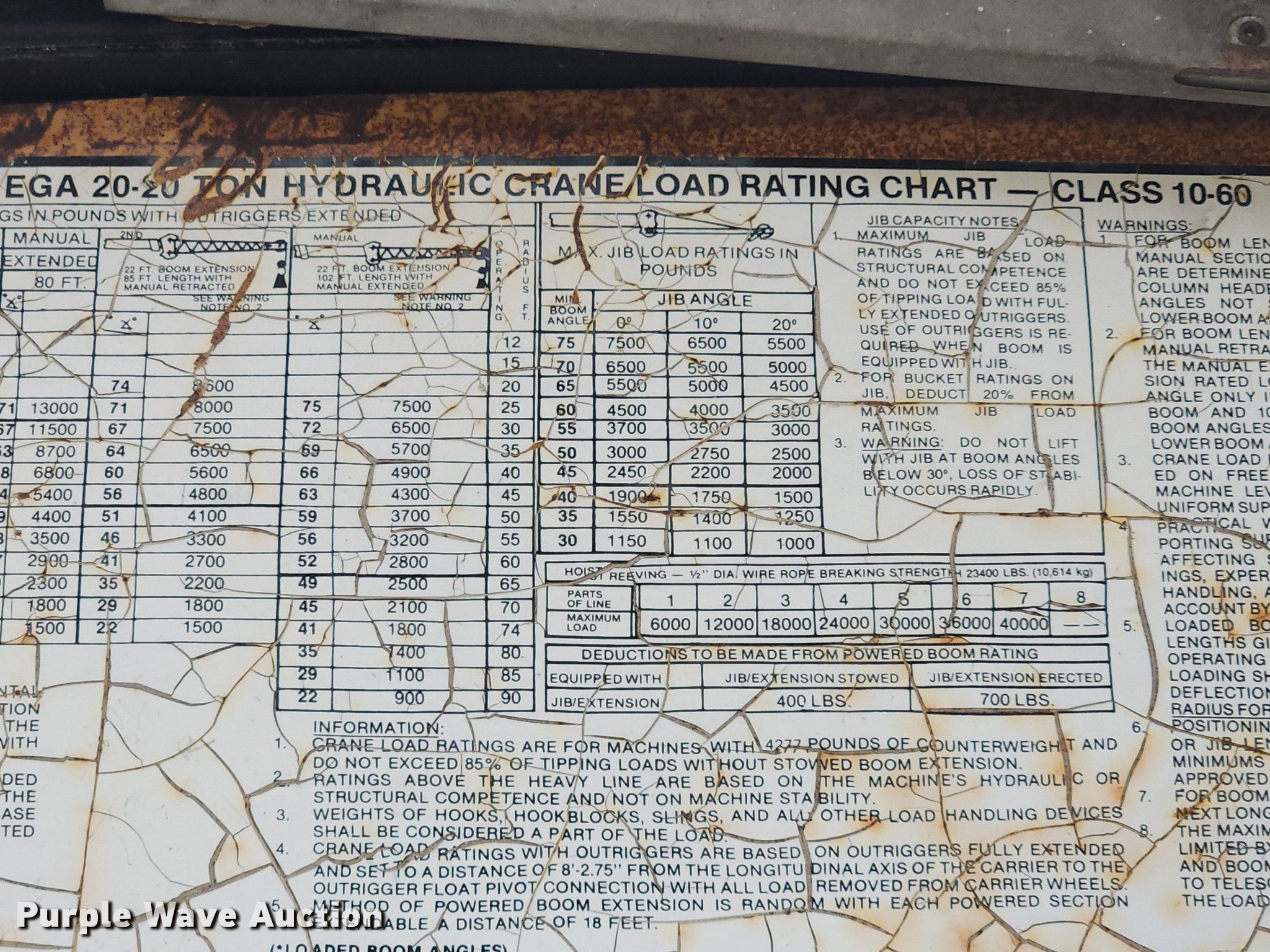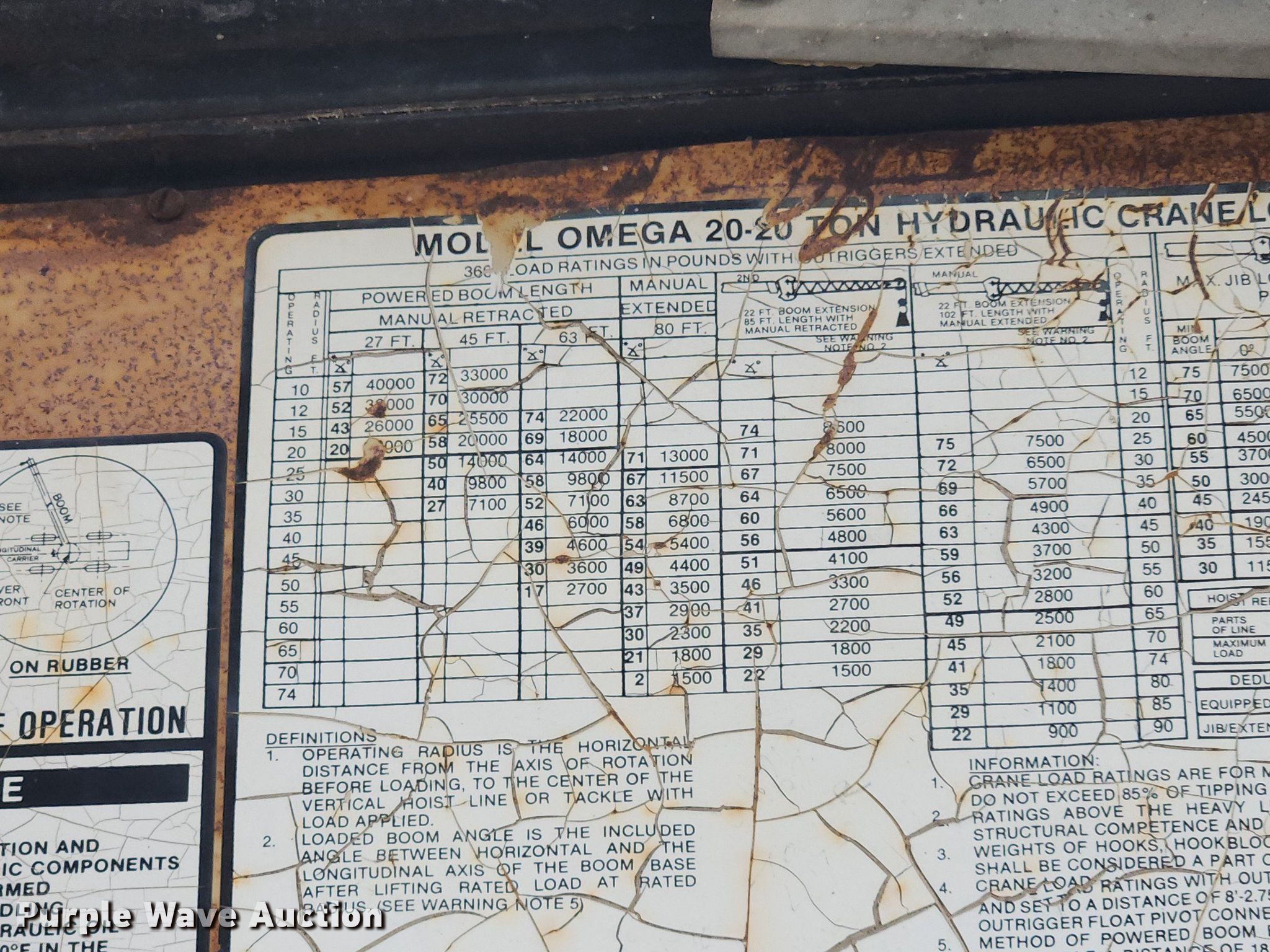 1980 P&H Omega 20-20 crane. Hours: 9,979 on meter, Serial: 49417. Engine Detroit Diesel, Cylinders: 3, Fuel type: Diesel. Transmission 3F - 3R. Chassis Axles: Single, Brakes: Hydraulic. Operators station Enclosed cab, Heat, Crane controls: Stick. Features Boom Telescopic, Maximum boom length: 62' Sections: 4 (3) powered, Maximum lift capacity: 40,000 lbs, Maximum lift height: 102', Jib: 22', Stabilizers: 4, Boom controls In-cab, Winches: 1, Crane ball & hook, Lift chart. Tires Size: 16.00-24. Notes Outrigger hydraulic leak, Scope cylinder hydraulic leak, Rear end issues Parts removed but included. IUOE Local 513 Training Center. Silex, MO 63377