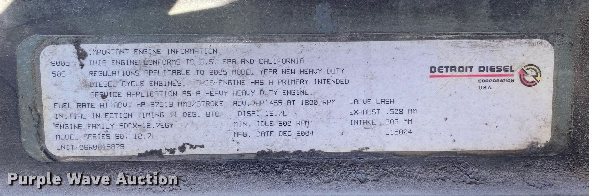 2005 Freightliner Columbia semi truck. Miles: 116,489 on odometer, Hours: 7,636 on meter, VIN: 1FUBA5CG75LU11289. Engine Detroit Diesel Series 60, Serial: 06R0815878, Displacement: 12.7L, Cylinders: 6, Fuel type: Diesel, HP: 455. Transmission Eaton Fuller, Speed: 10. Chassis Axles: Single, Suspension: Air Dump valves, Brakes: Air, GVWR: 33,000 lbs. Interior AC, Heat, Power windows, Power locks, Cruise control. Features Fifth wheel type: Fixed, Fuel tank: Dual. Tires Size: 275/80R22.5. Oklahoma title. Title distribution may be delayed up to 14 days from verification of funds. Love Bottling Company. 3200 South 24th Street West. Muskogee, OK 74401